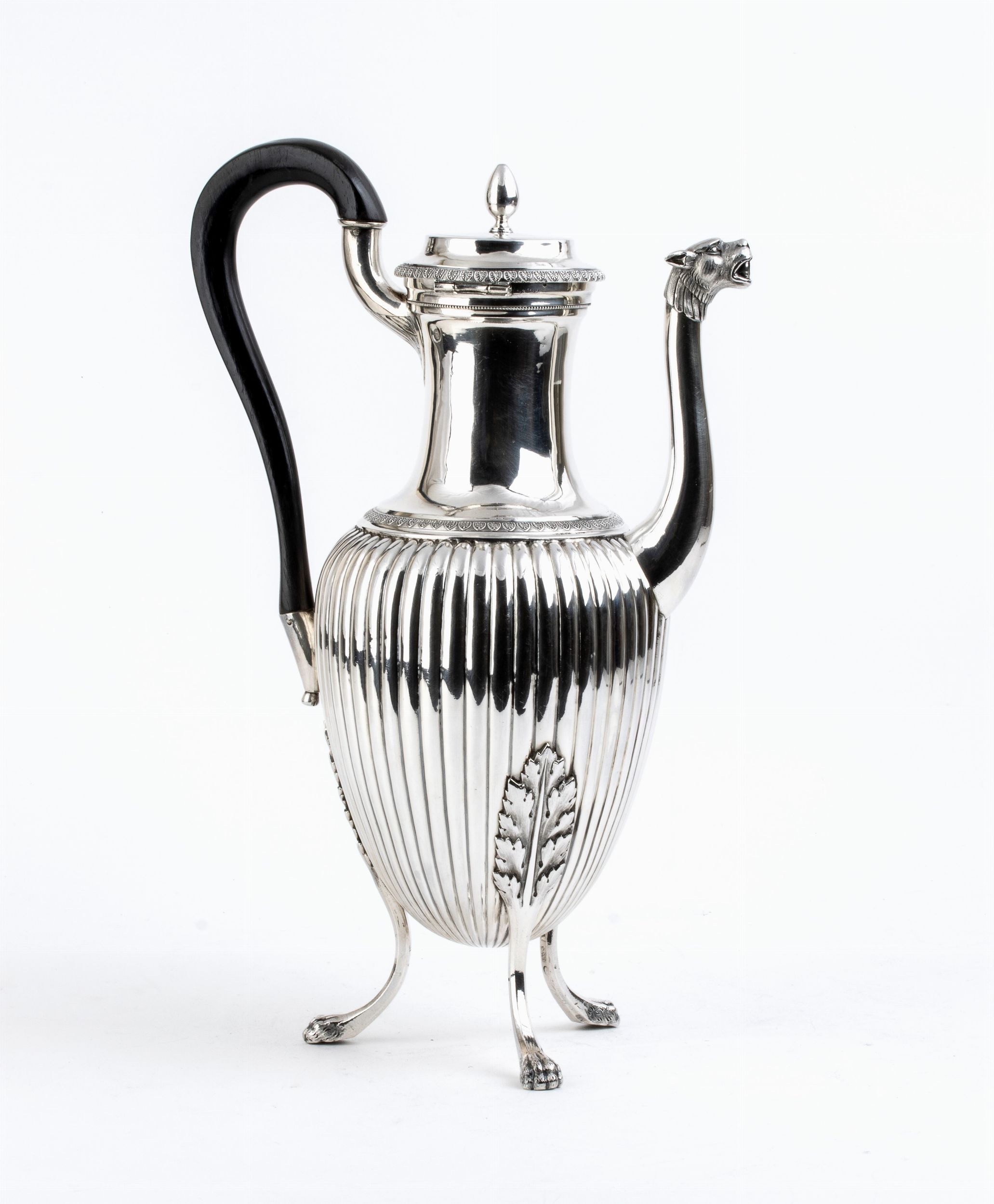 corpo ovoidale con scanalature verticali poggiante su tre piedini con estremità a zampa ferina e attaccatura superiore a foglie di quercia, collo rastremato con versatoio sagomato e beccuccio zoomorfo. Coperchio incernierato con presa a ghianda, manico in ebano. Argento 950/1000, punzonata con i marchi per l'argento al primo titolo in uso a Parigi dal 1798 al 1809, con il marchio non ufficiale utilizzato dall'Association des Orfévres di Parigi per l'argento al primo titolo di 950/1000 testa di donna greca con lettera P e con le iniziali J.B.P. dell'argentiere Jean-Baptiste Potot.