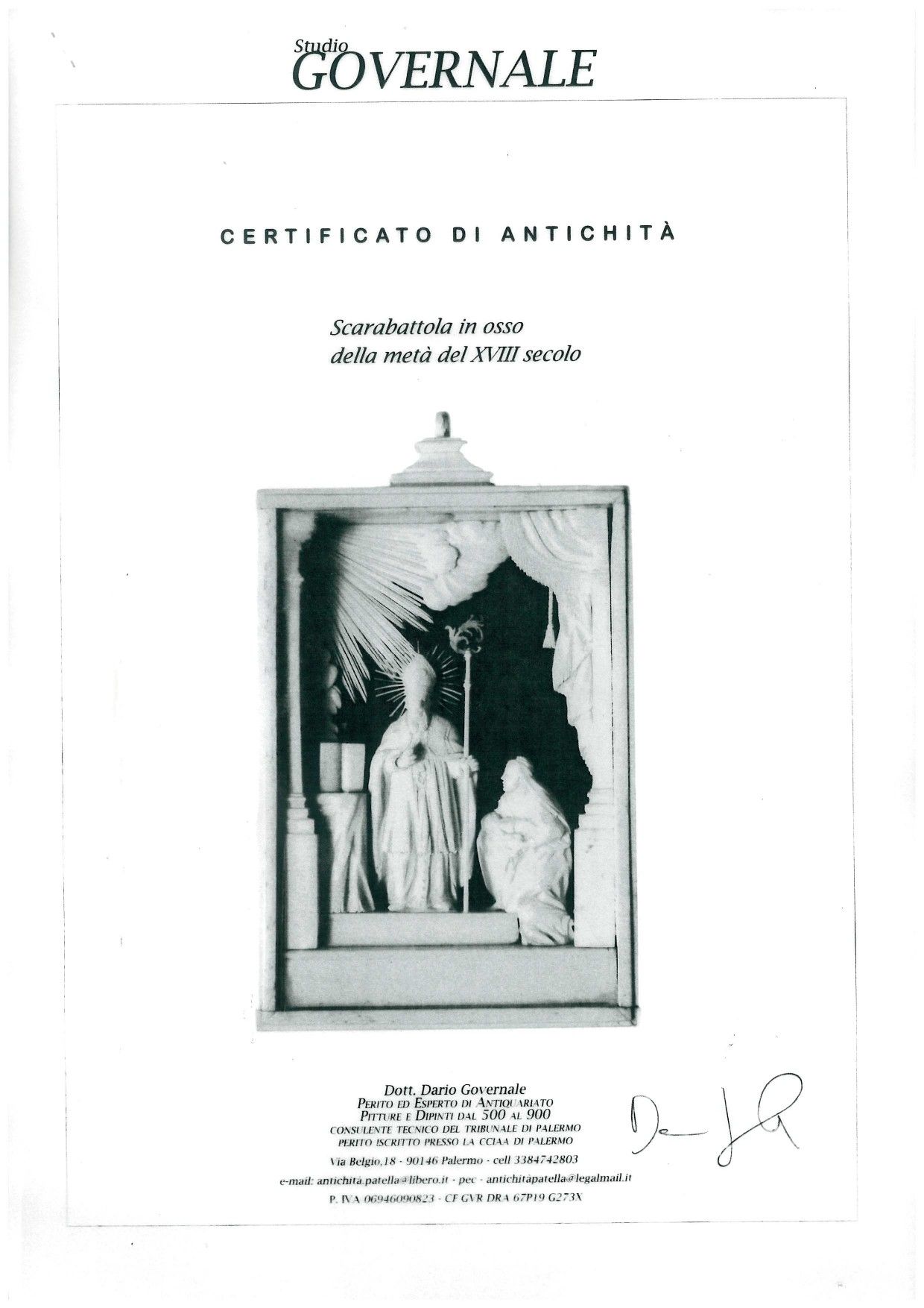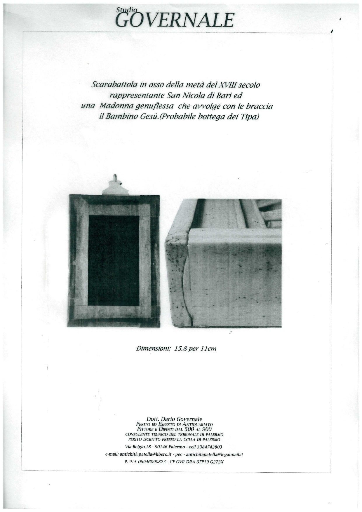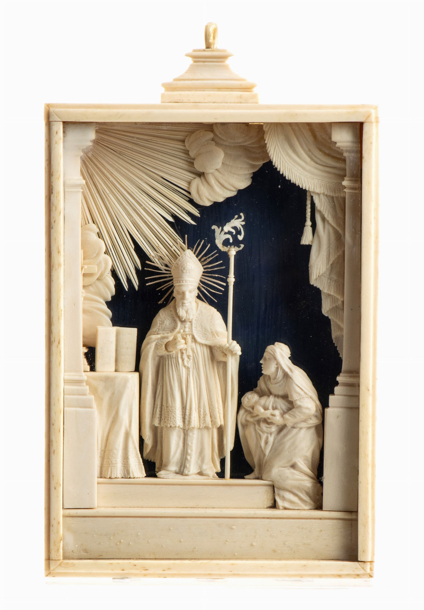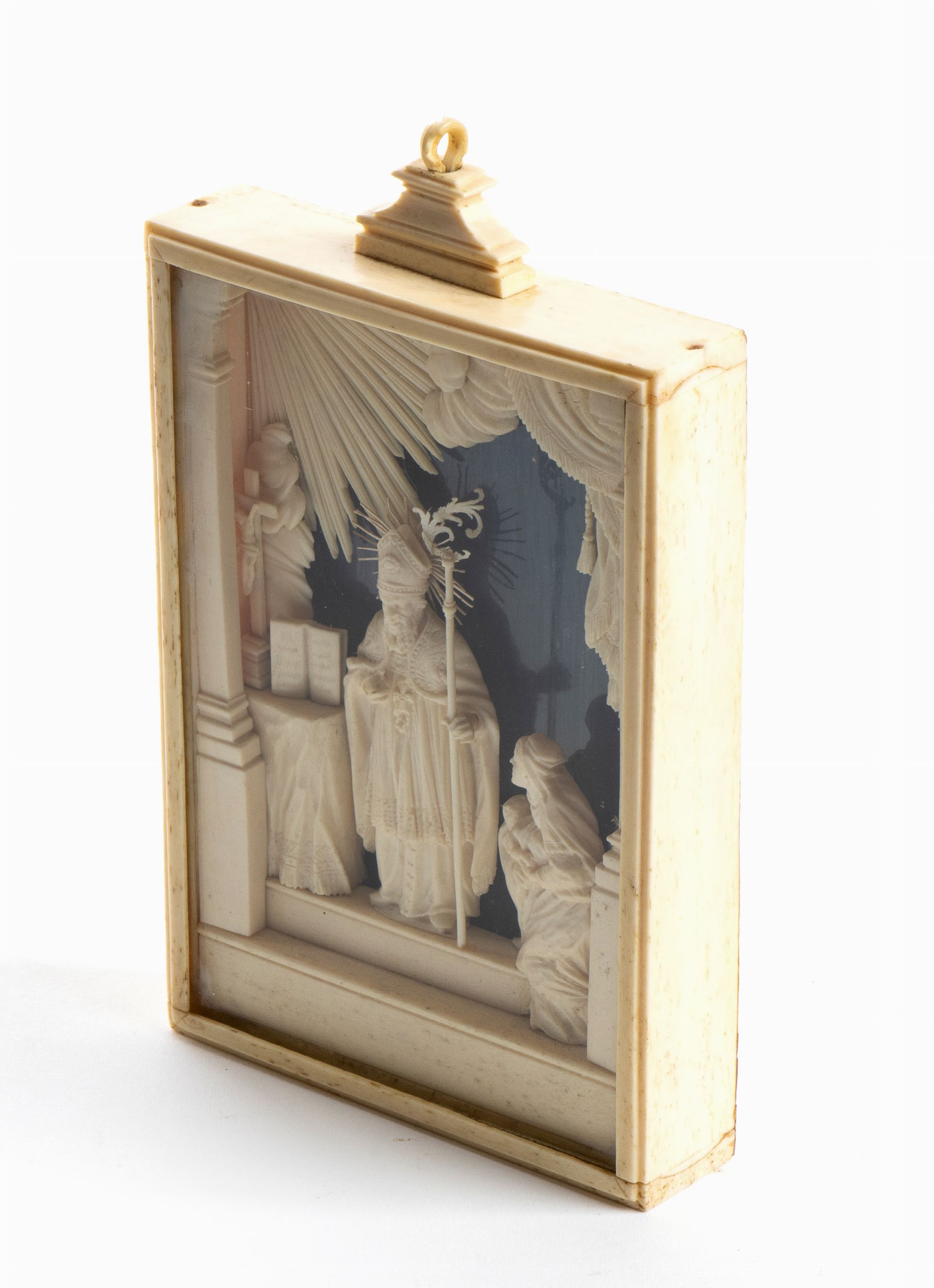 I personaggi della sacra rappresentazione, scolpiti a micro-intaglio a tutto tondo in osso e raffiguranti San Biagio con una devota ed un bambino sono inseriti in una teca rettangolare in osso. L'opera è impaginata in una tradizionale quinta architettonica; la figura stante di San Biagio in abito vescovile, con pastorale e mitra, che benedice una donna inginocchiata ai suoi piedi con un bambino tra le braccia è posta al centro della rappresentazione, mentre alla sua destra è collocato un altare con un Cristo crocifisso e un testo sacro.