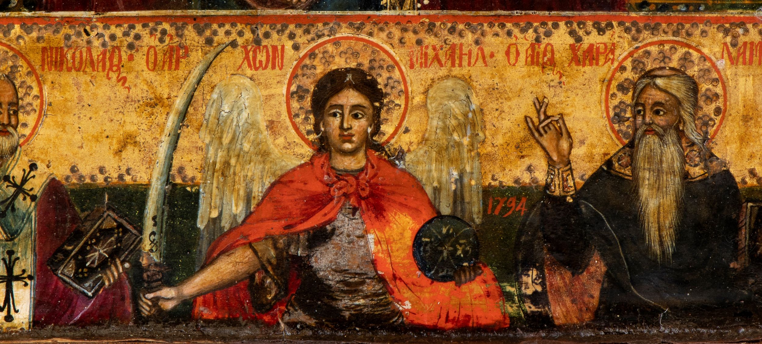 l'iconografia è costituita dalla Madonna con in braccio il Bambino Gesù, che tiene nella mano una destra una pergamena e che la Vergine osserva. Nella parte inferiore un arcangelo affiancato da due santi. Datata 1794.