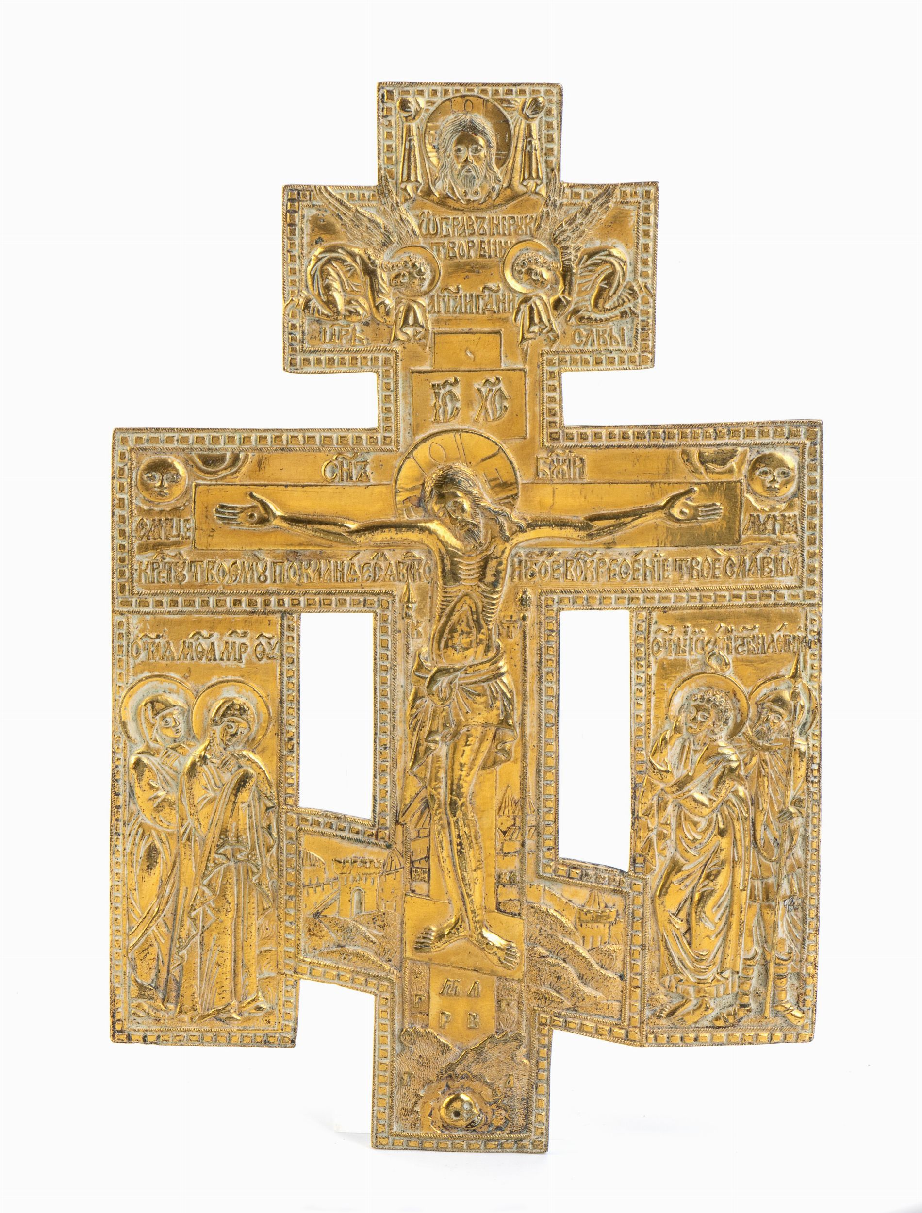 In bronzo dorato, presenta una barra verticale e tre traversali. Ogni barra rappresenta un particolare dettaglio del momento della crocifissione: La parte più alta e stretta, presenta la targa INBI in greco, corrispondente all’INRI latino, che sta per “Gesù Nazareno, Re degli Giudei”; la centrale rappresenta le braccia aperte del Cristo crocifisso; la più bassa, anch’essa più stretta rispetto a quella centrale, simboleggia il poggiapiedi, su cui il sangue di Cristo colava durante la crocifissione. La figura del Cristo non indossa una corona di spine, ed è fissato alla croce con tre chiodi anziché quattro. Dietro di lui sono presenti la lancia con cui Longino gli trafisse il costato e la spugna con cui venne dissetato con aceto. Sullo sfondo, la città di Gerusalemme, teatro della Passione. Della croce non si vede la base che è nascosta nel terreno, coperta da rocce che fanno da tetto ad una caverna sotterranea dove è conservato il teschio di Adamo. Quest'ultimo personaggio simboleggia la morte di Gesù, simbolo di salvezza, che vince su quella del primo uomo che non ha potuto accedere alla redenzione. Questa Croce rappresenta la vittoria sulla morte e sul dolore stesso.