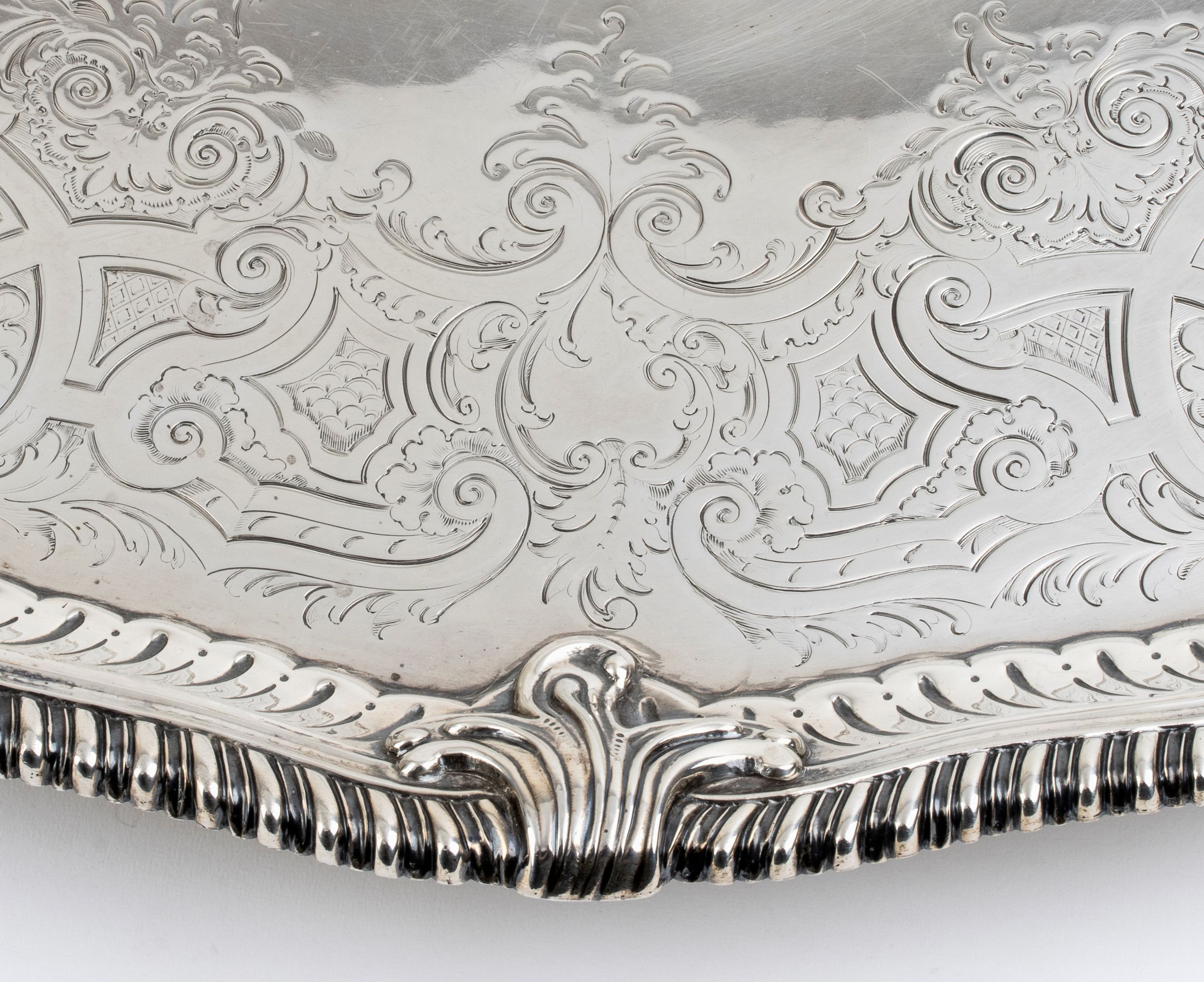 di forma rotonda poggiante su tre piedi a voluta vegetale, con bordo godronato e ricca decorazione a bright cut a volute vegetali.
