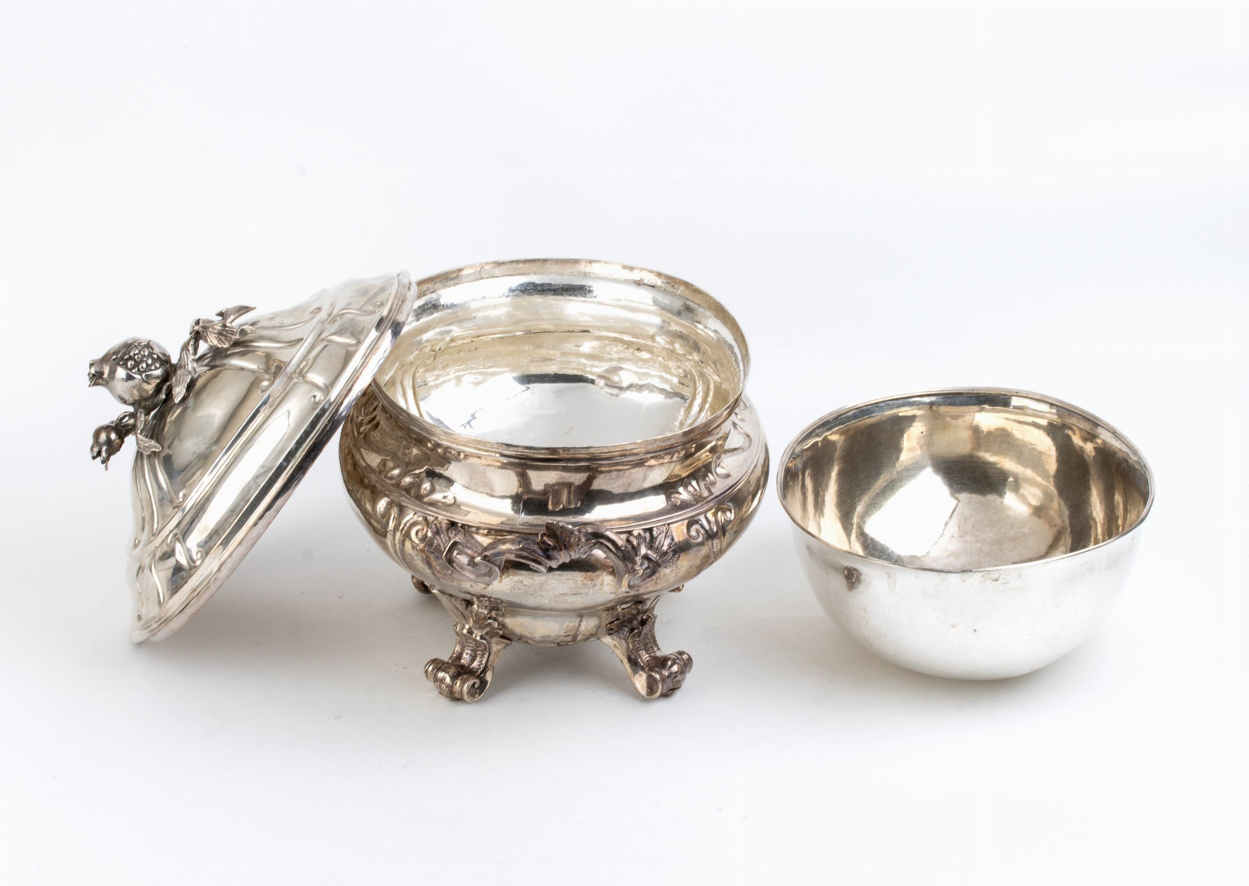 di forma ovale con manici laterali, poggiante su quattro piedi a riccio, completa di contenitore interno e coperchio con cimatura con trionfo di Il melograni. Punzonata sotto la base e sotto il contenitore con il marchio della bulla di Palermo raffigurata da un aquila a volo alto in uso a partire dal XVIII secolo, marchi DGG 77 , console Don Gioachino Carraffa, argentiere scarsamente leggibile e presa di saggio. Ulteriormente punzonata con il marchio di importazione in svezia per l'argento al titolo minimo di 830/1000 in uso dopo il 1912.