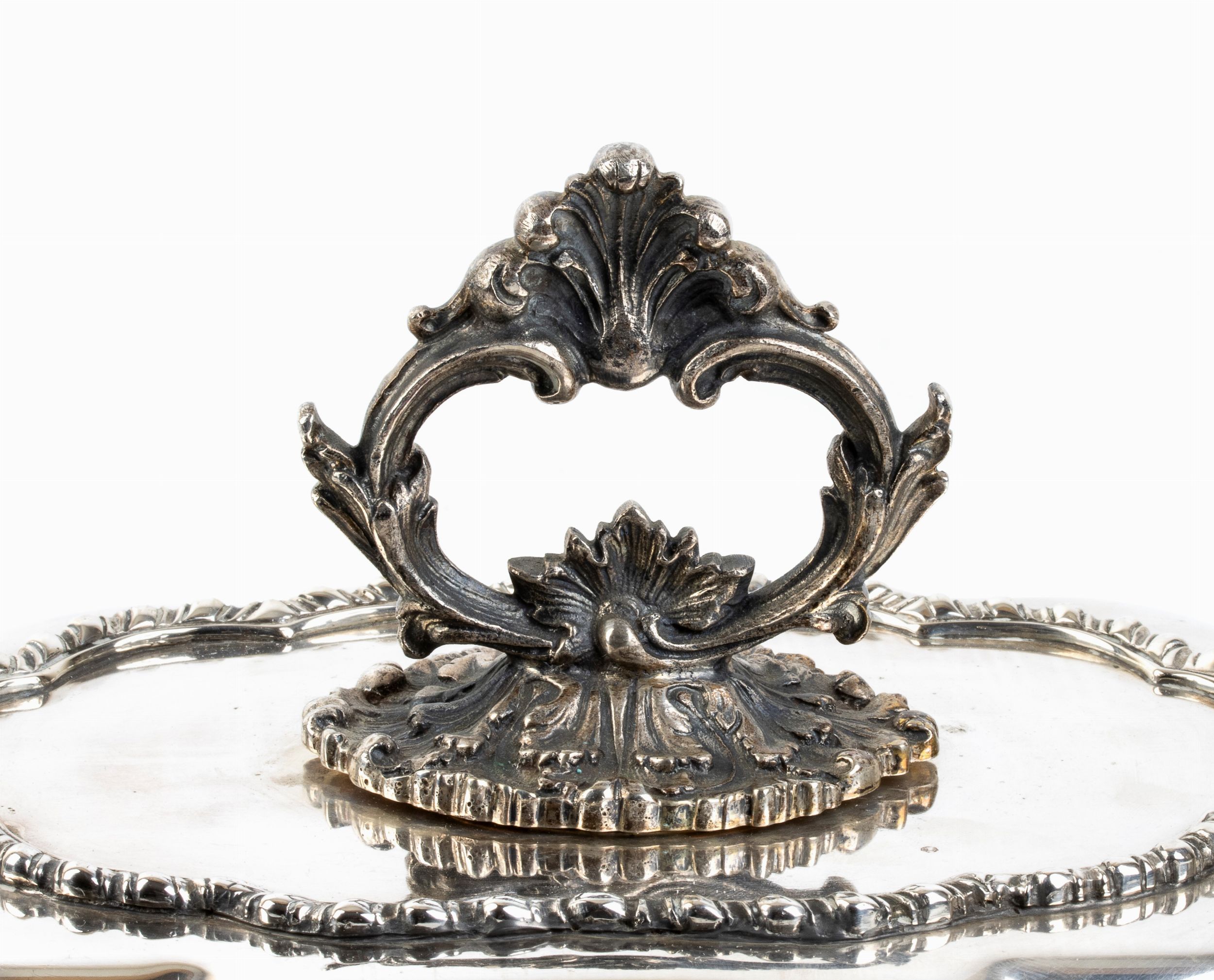 con bordi decorati a motivi vegetali e coperchio con presa folgiata. Argento 800/1000, punzonata 800.Stato di conservazione: **** buono, minori segni d'uso commensurati all'uso nel tempo.