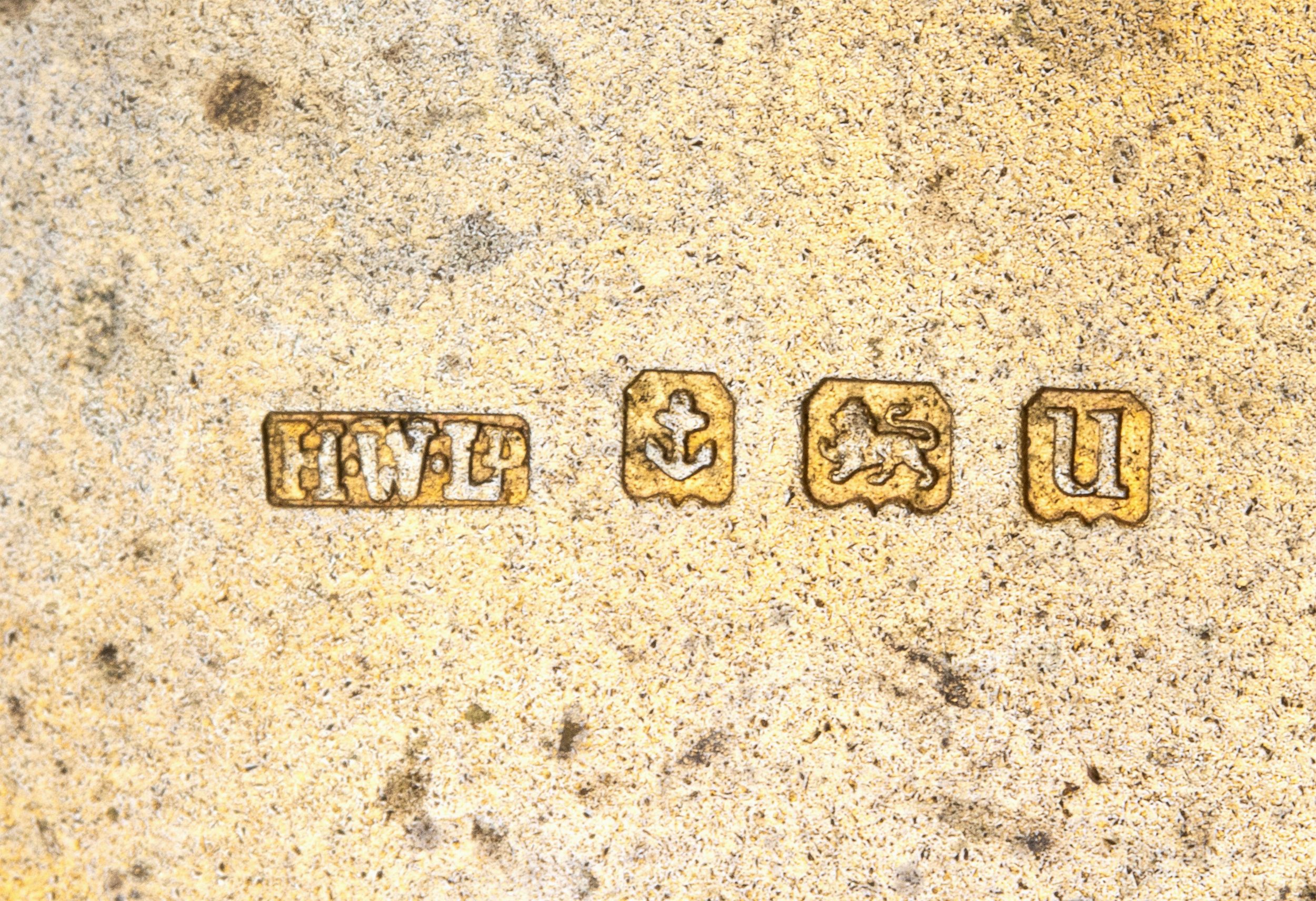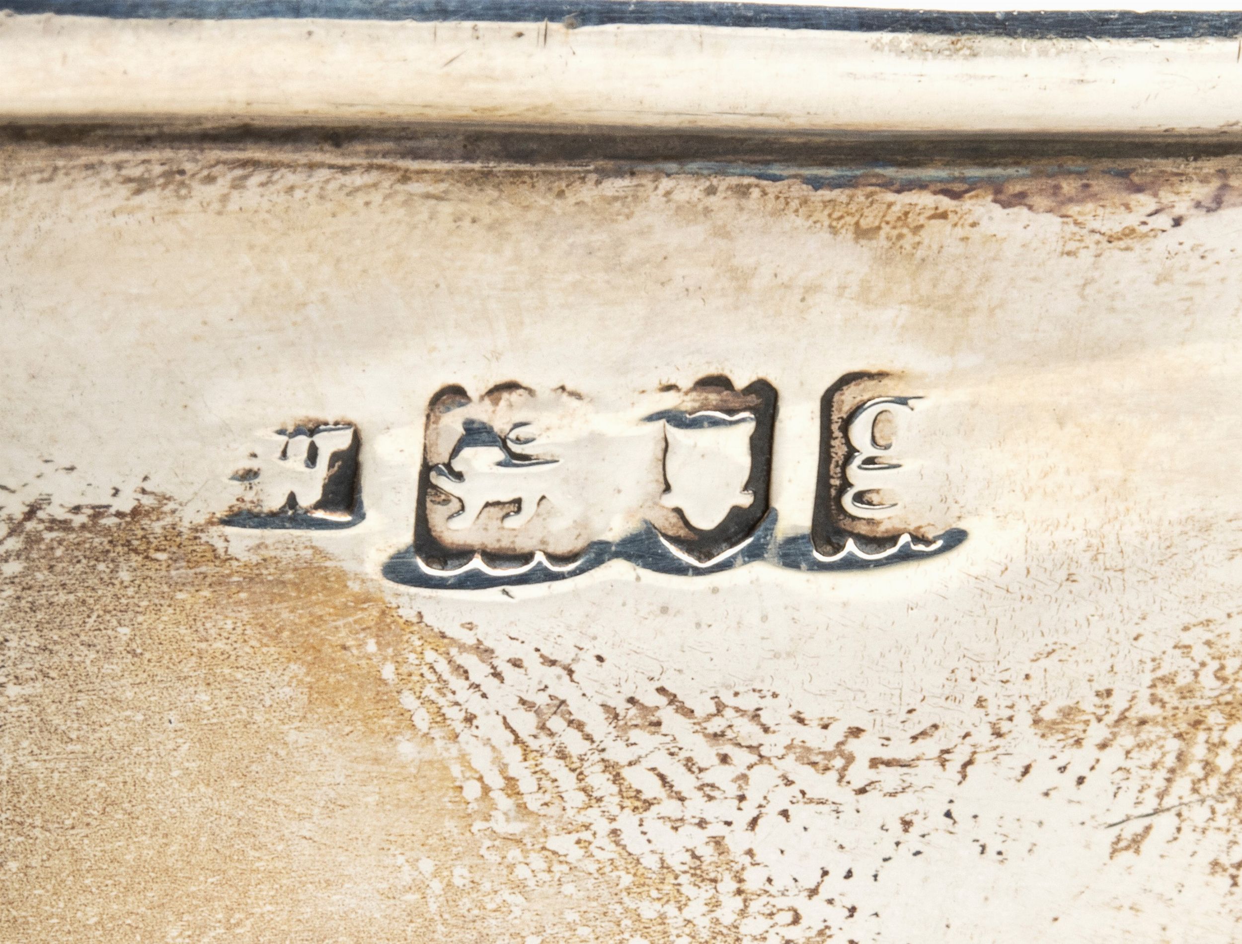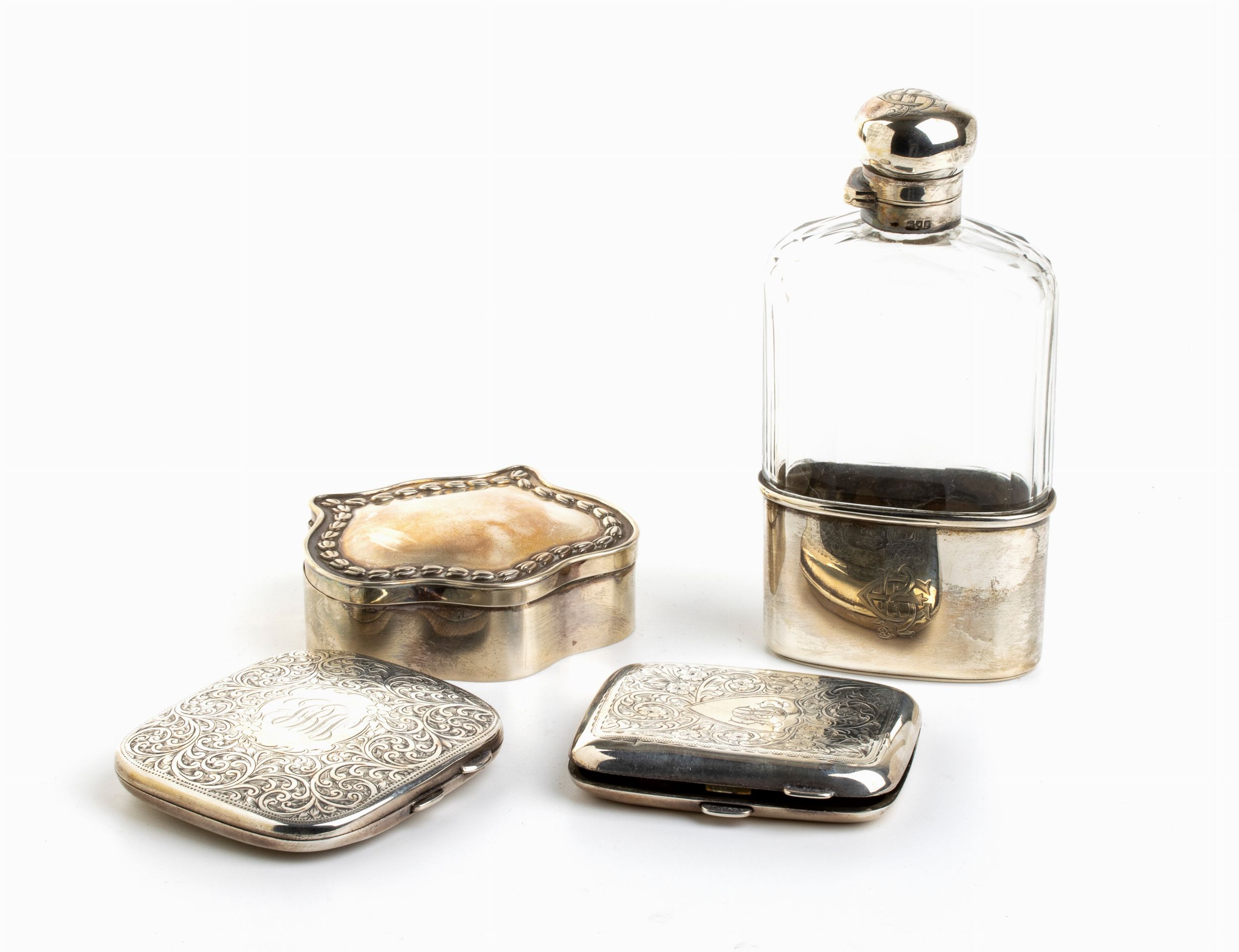 c) portasigarette in argento 925/1000 con monogramma, serie completa di marchi Birmingham 1910-1911, argentiere non identificato.