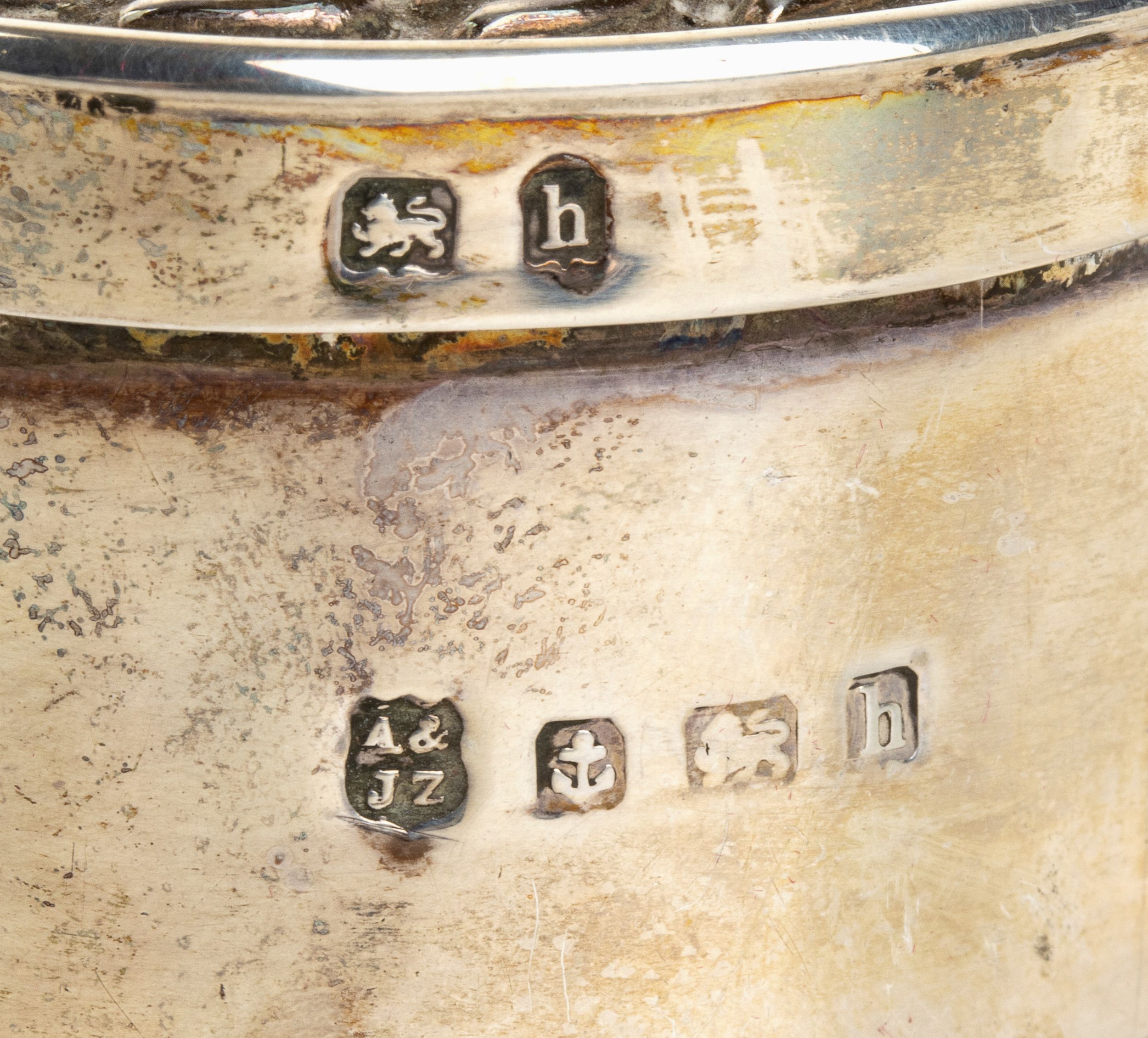 d) scatolina sagomata con coperchio incernierato in argento 925/1000, serie completa di marchi Birmingham 1907-1908, argentieri A & J Zimmerman Ltd (Arthur & John Zimmerman).
