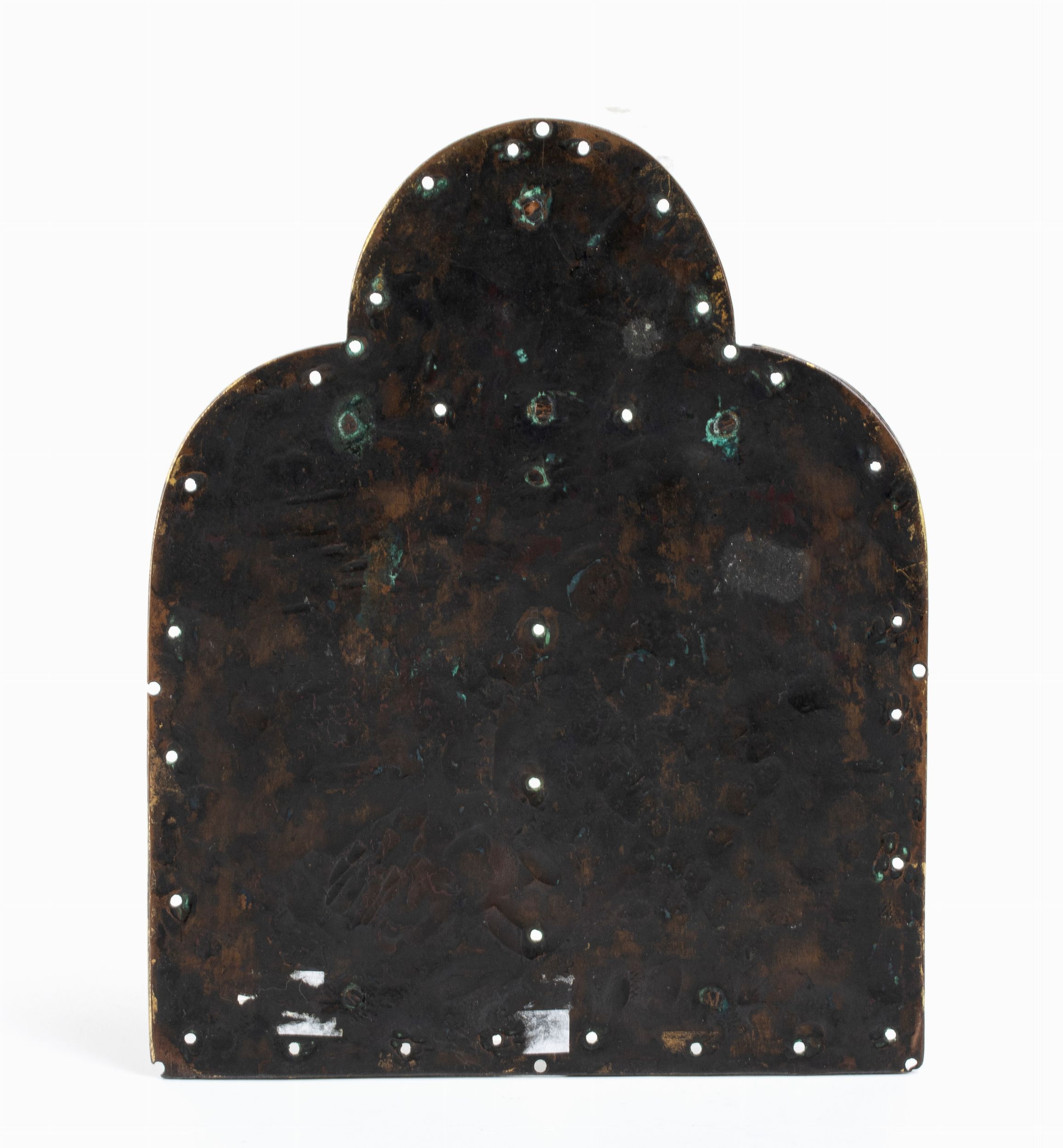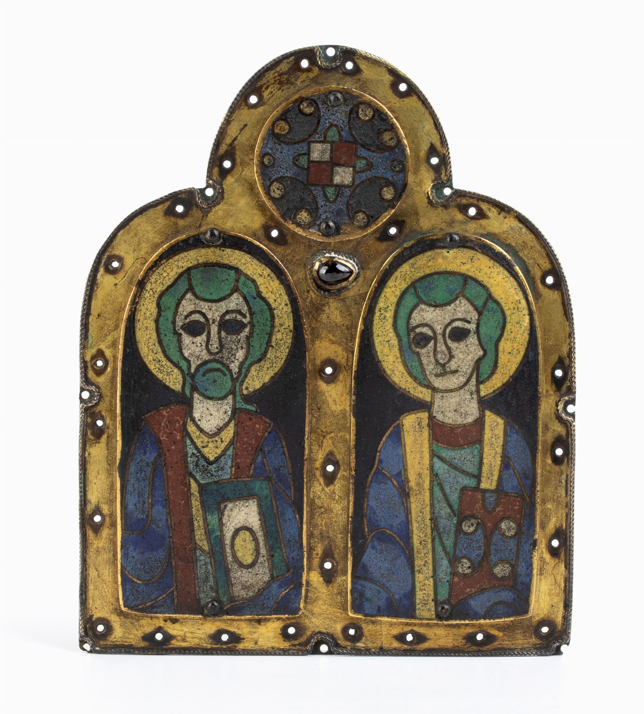 realizzato in bronzo dorato, questo oggetto presenta una cordatura perimetrale e al centro una pietra colorata. Due nicchie rettangolari a punta tonda, ornate con smalto policromatico champlevé, raffigurano due santi a mezzo busto. Questo stile di smalto si ispira alle opere del XII secolo. In cima, vi č un medaglione decorato con smalti policromi champlevé, forse raffigurante uno stemma. La cornice č forata, presumibilmente per consentire il fissaggio tramite chiodi.