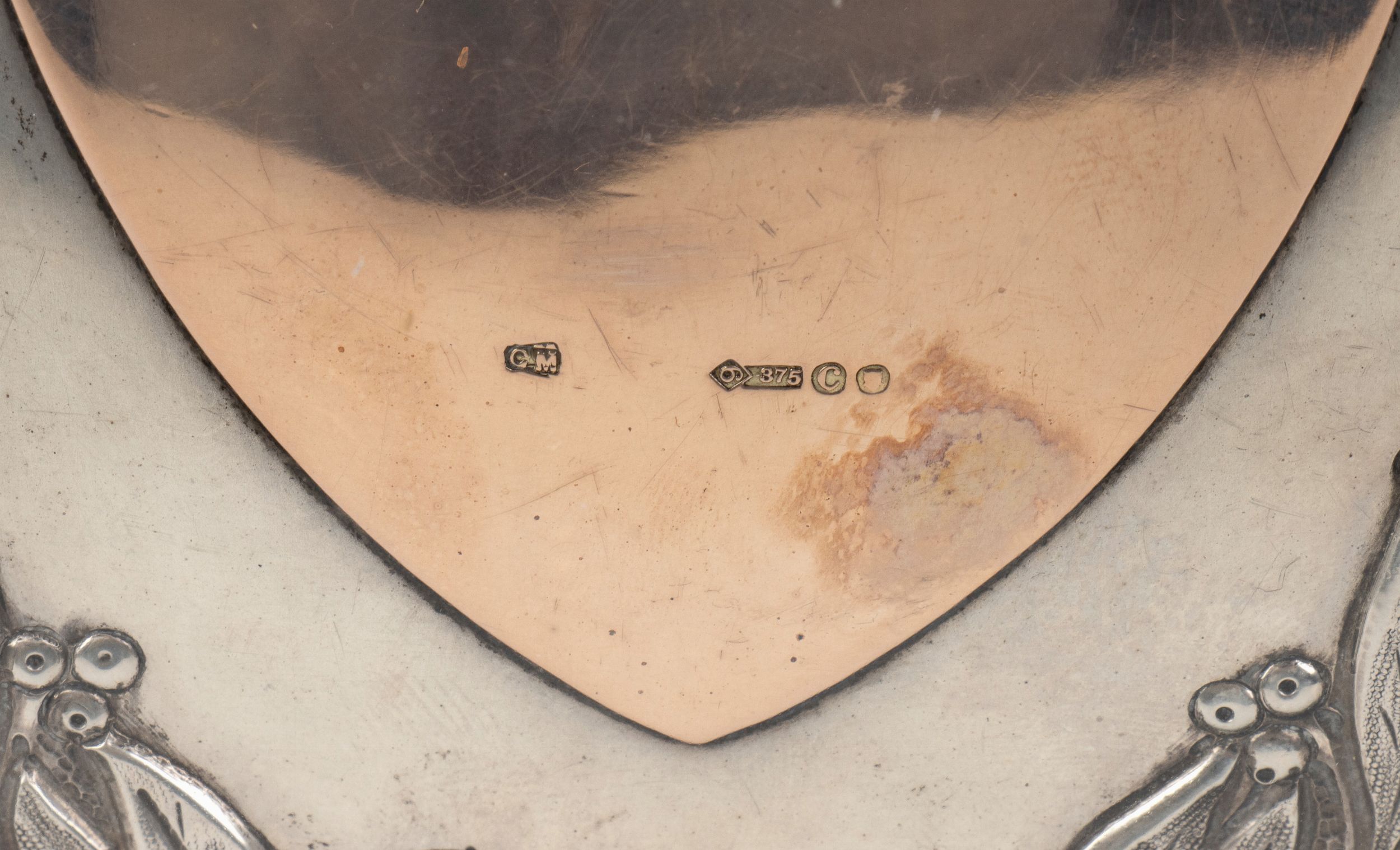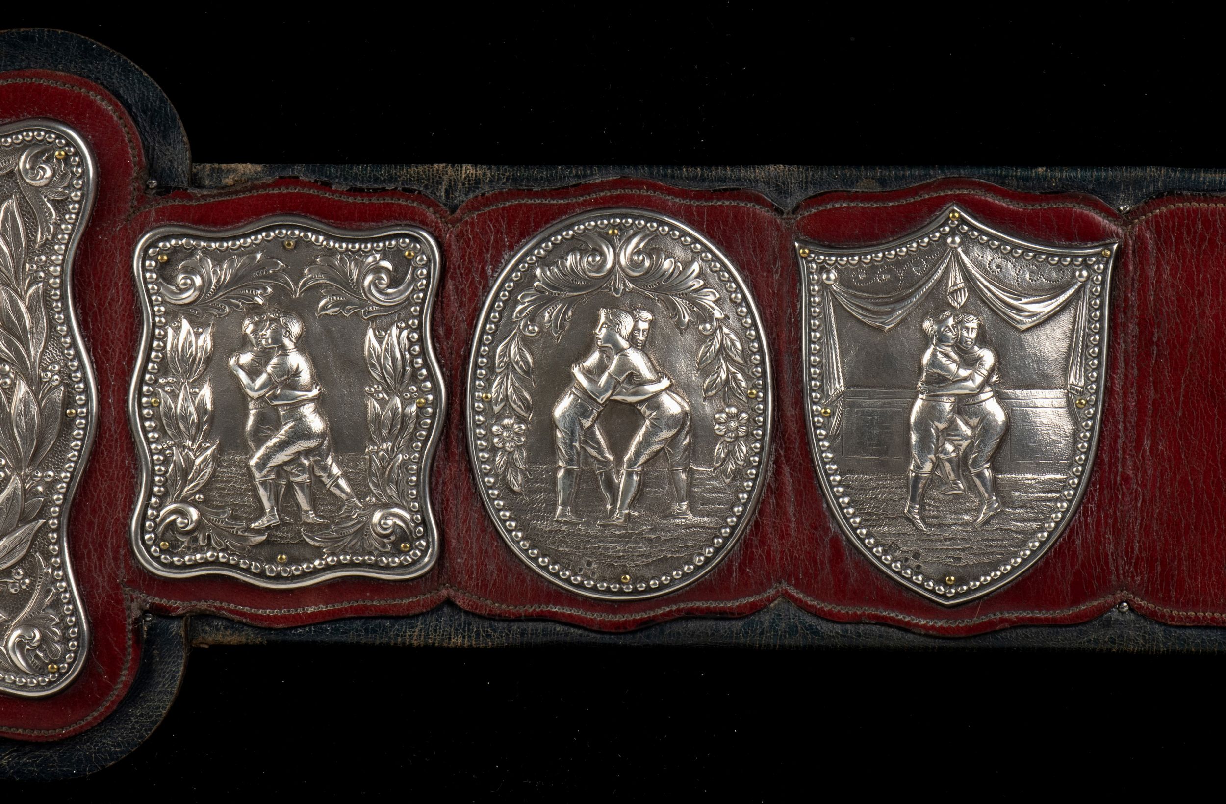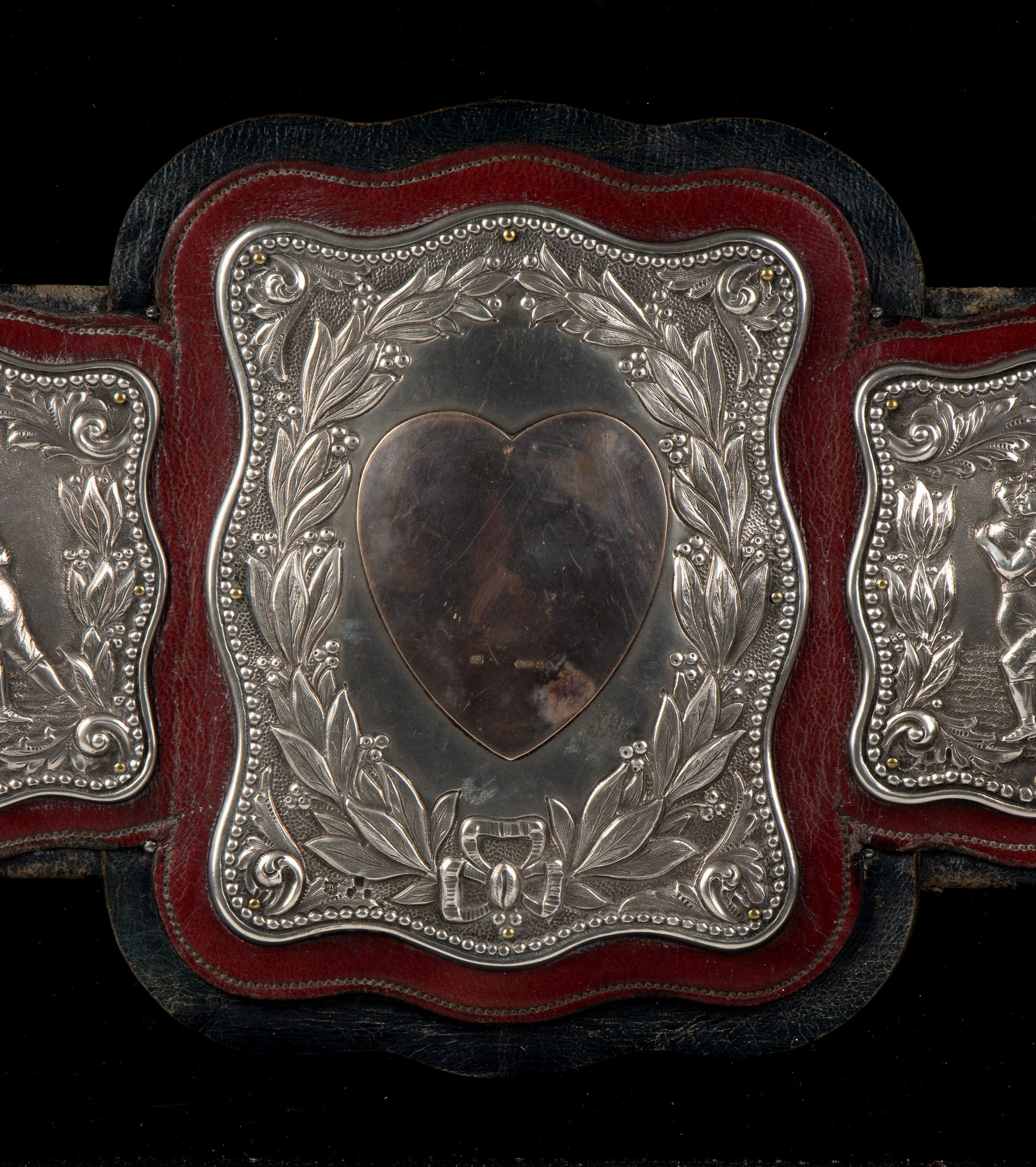 In cuoio nei toni del rosso e del nero con sei placchi laterali in argento con raffigurazioni di lotta ed una grande centrale in argento con scudo centrale in oro. Argento 925/1000 e oro 375/1000 (9ct), serie completa di marchi Londra 1898-1899, argentiere Goldsmiths & Silversmiths Co (William Gibson & John Lawrence Langman), Regent street London.