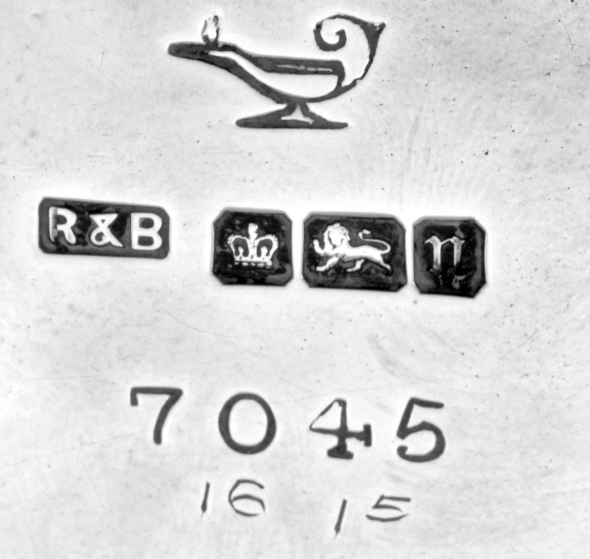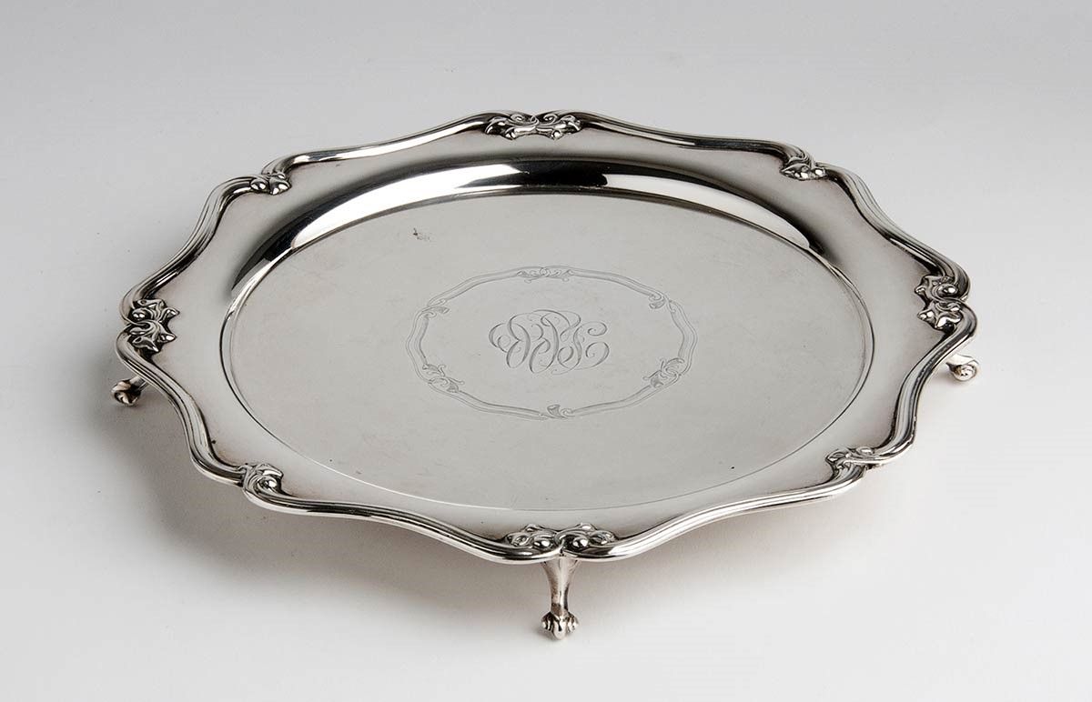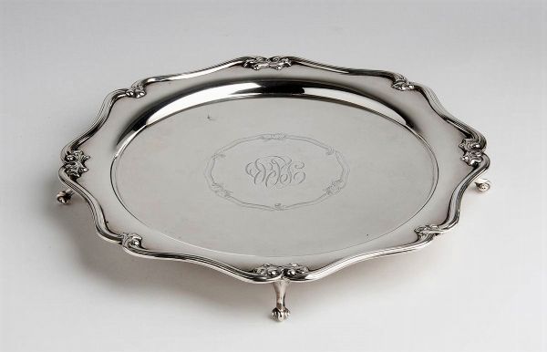 di forma sagomata, decorato con volute fogliate perimetrali, poggiante su quattro piedini ad artiglio. Argento 925/00, serie completa di marchi Sheffield 1905-1906, argentieri Robert & Belk.