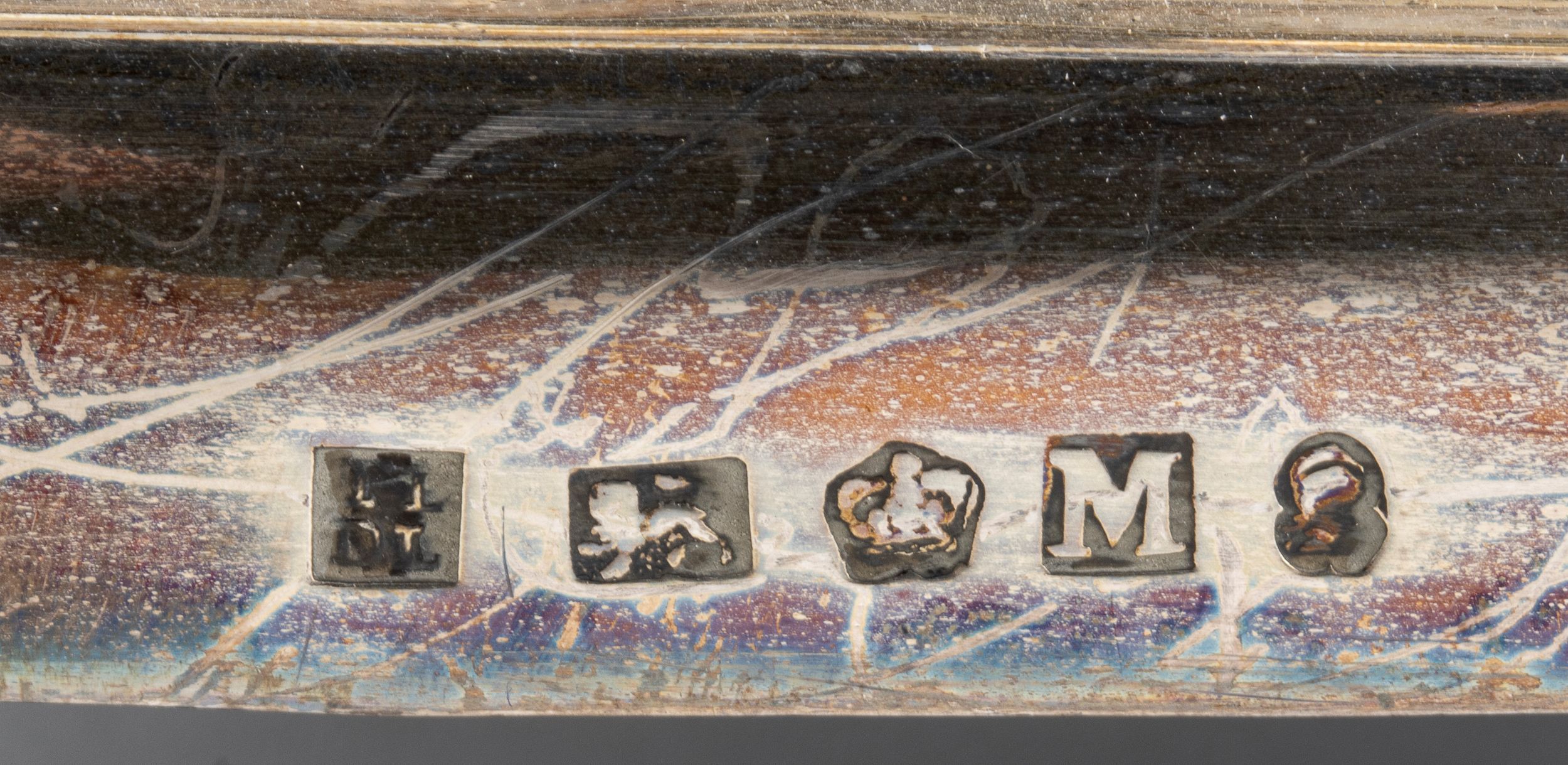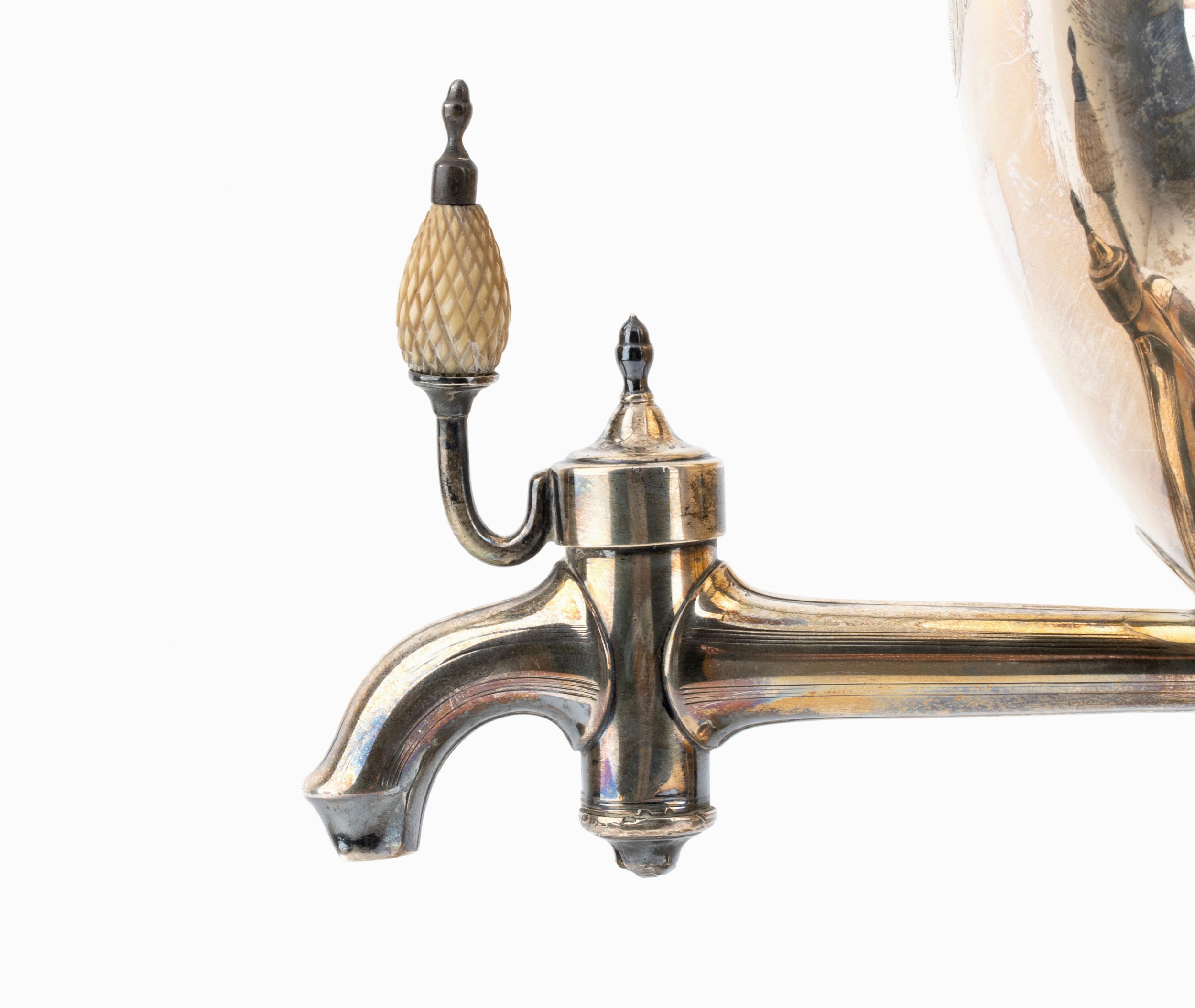 di forma globulare poggiante su base quadrata con piedini a sfera; corpo liscio con manici laterali, stemma nobiliare frontale rubinetto con impugnatura in osso. Argento 925/1000, serie completa di marchi ciità di Sheffield 1802-1803, argentieri Thomas & Daniel Leader.