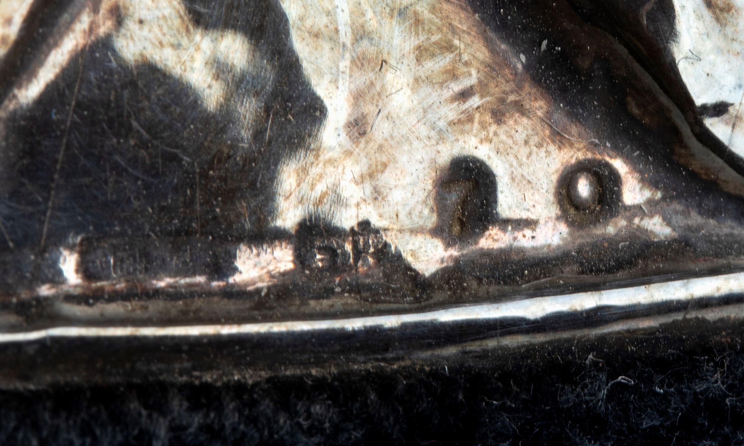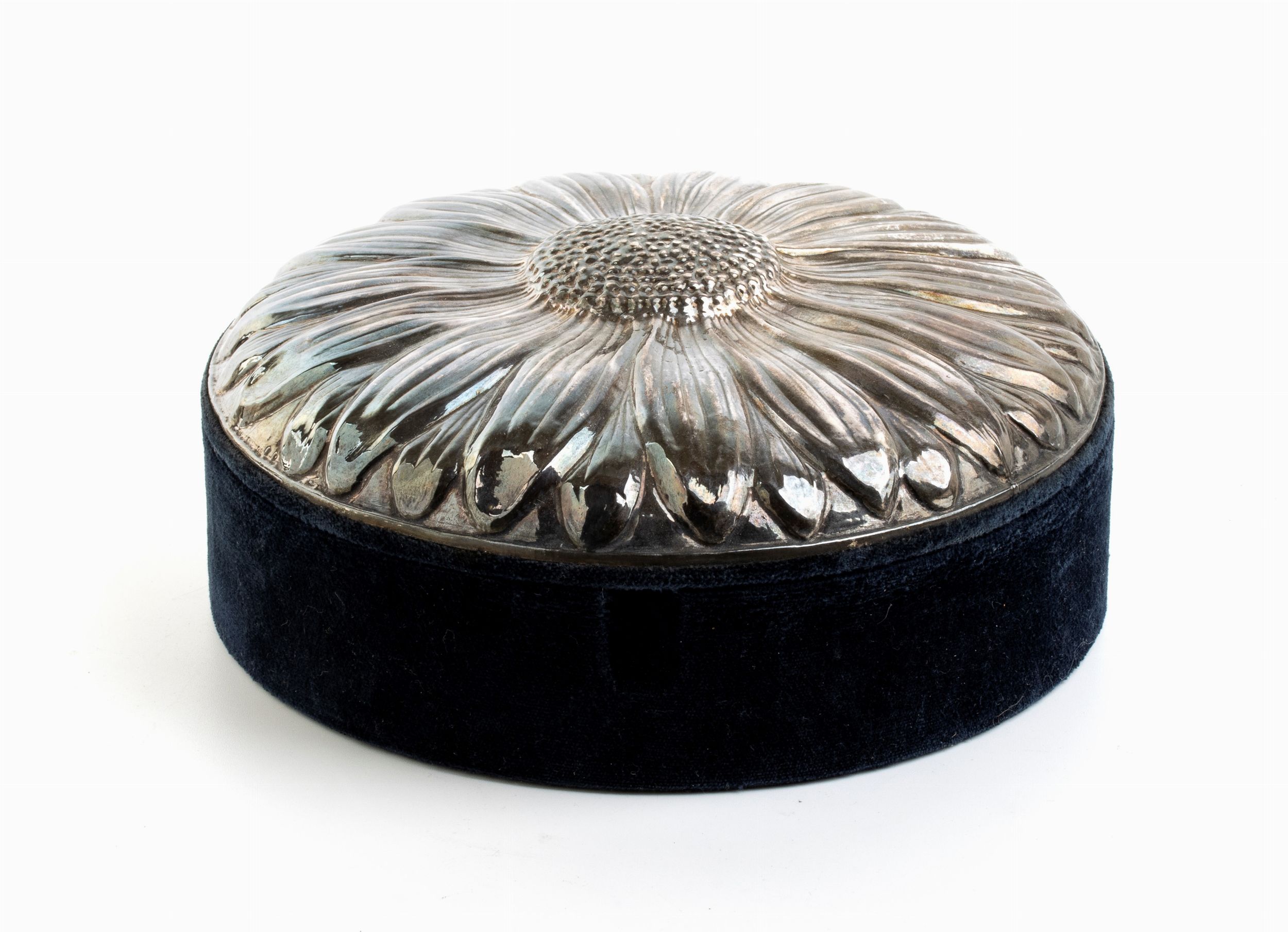 di forma circolare rivestita di velluto blu con inserto in argento 925/1000 a forma di fiore. Punzonata 925 - 889 - 70. Stato di conservazione: **** buono, minori segni d'uso commensurati all'uso nel tempo.