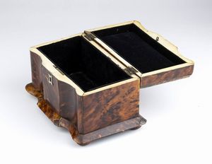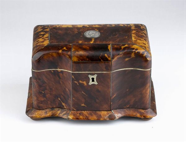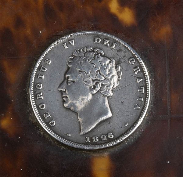 di forma rettangolare sagomata realizzata interamente in tartaruga (hawksbill sea turtle, Eretmochelys imbricata, Cheloniidae). Coperchio incernierato incastonato con una moneta in argento del 1826 raffigurante Re Giorgio IV.