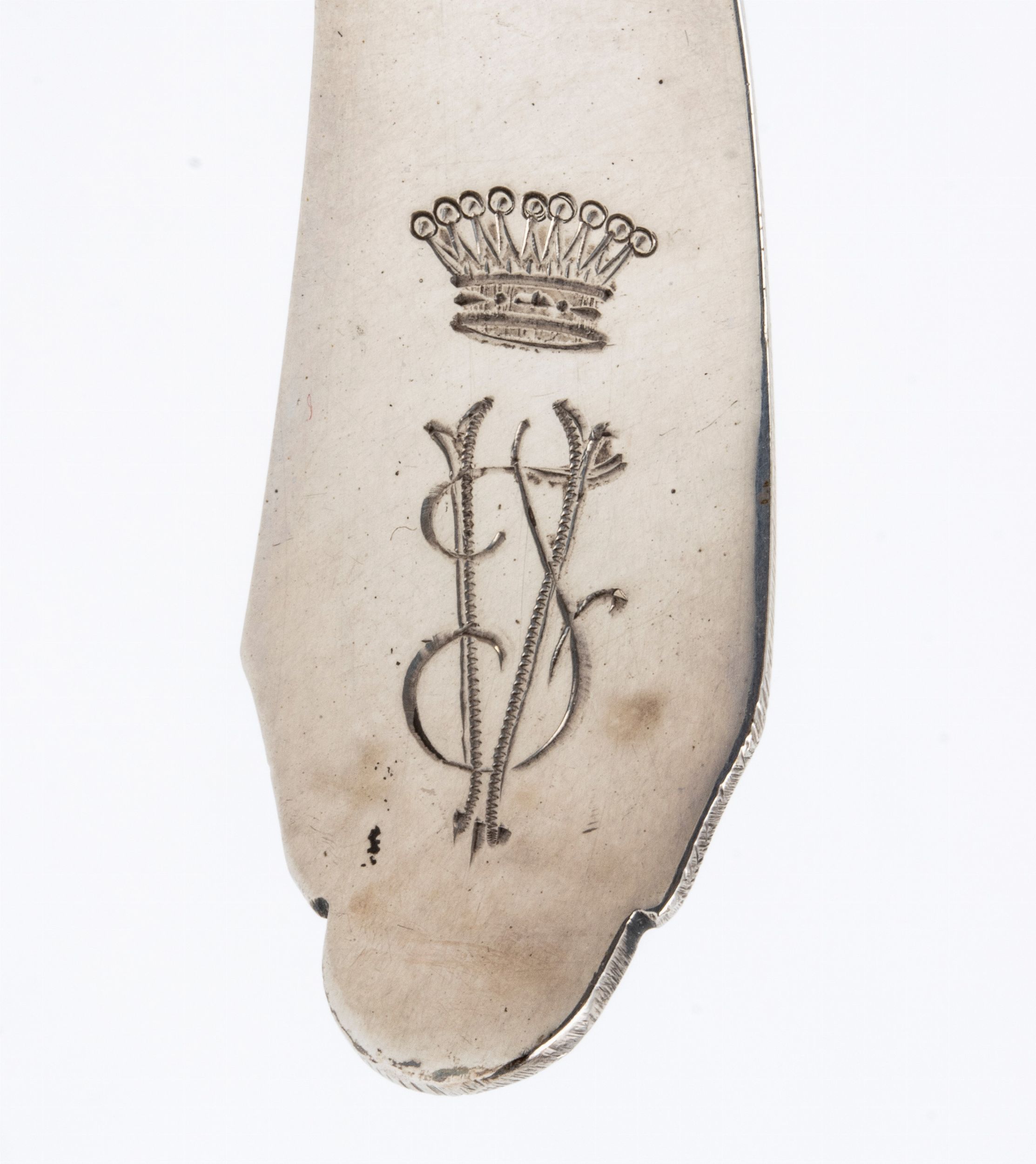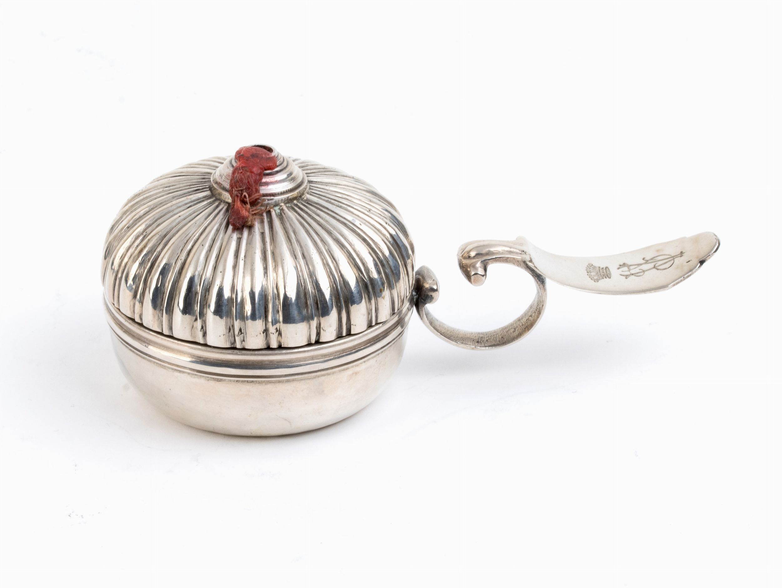 di forma circolare con coperchio scanalato, e foro centrale per la cera. Punzonata con marchi in uso a Venezia nel XIX secolo.Stato di conservazione: **** buono, minori segni d'uso commensurati all'uso nel tempo.