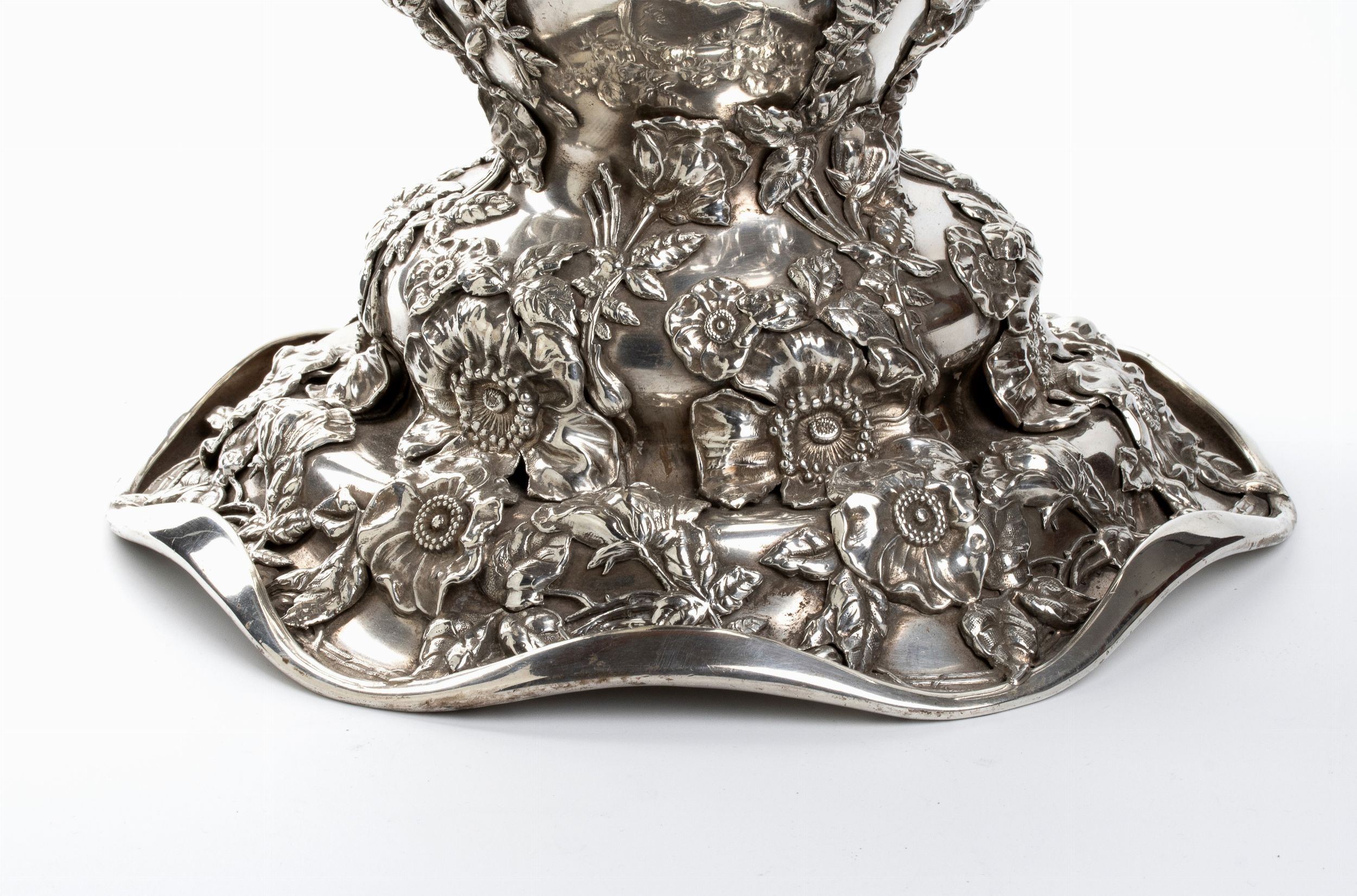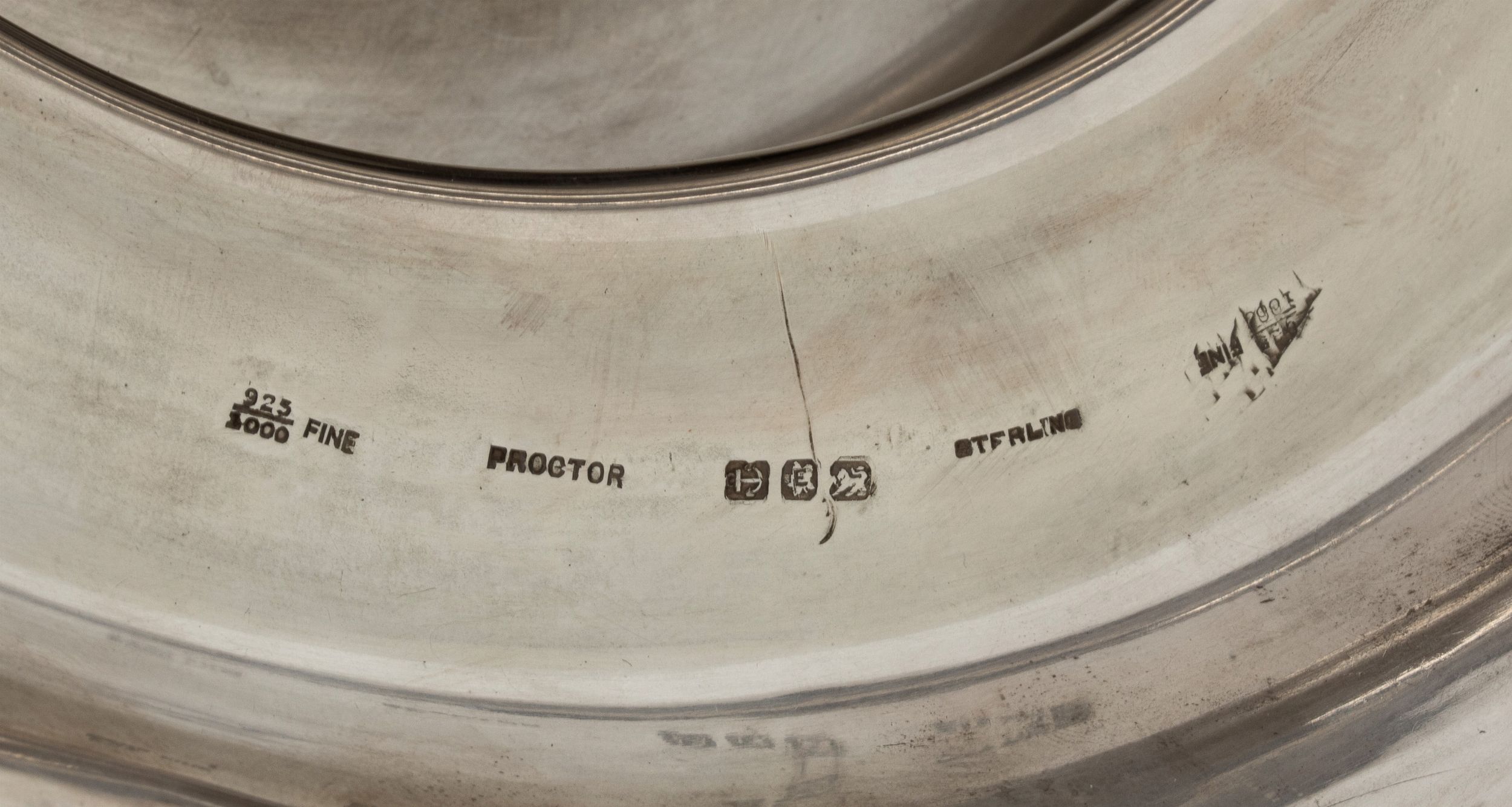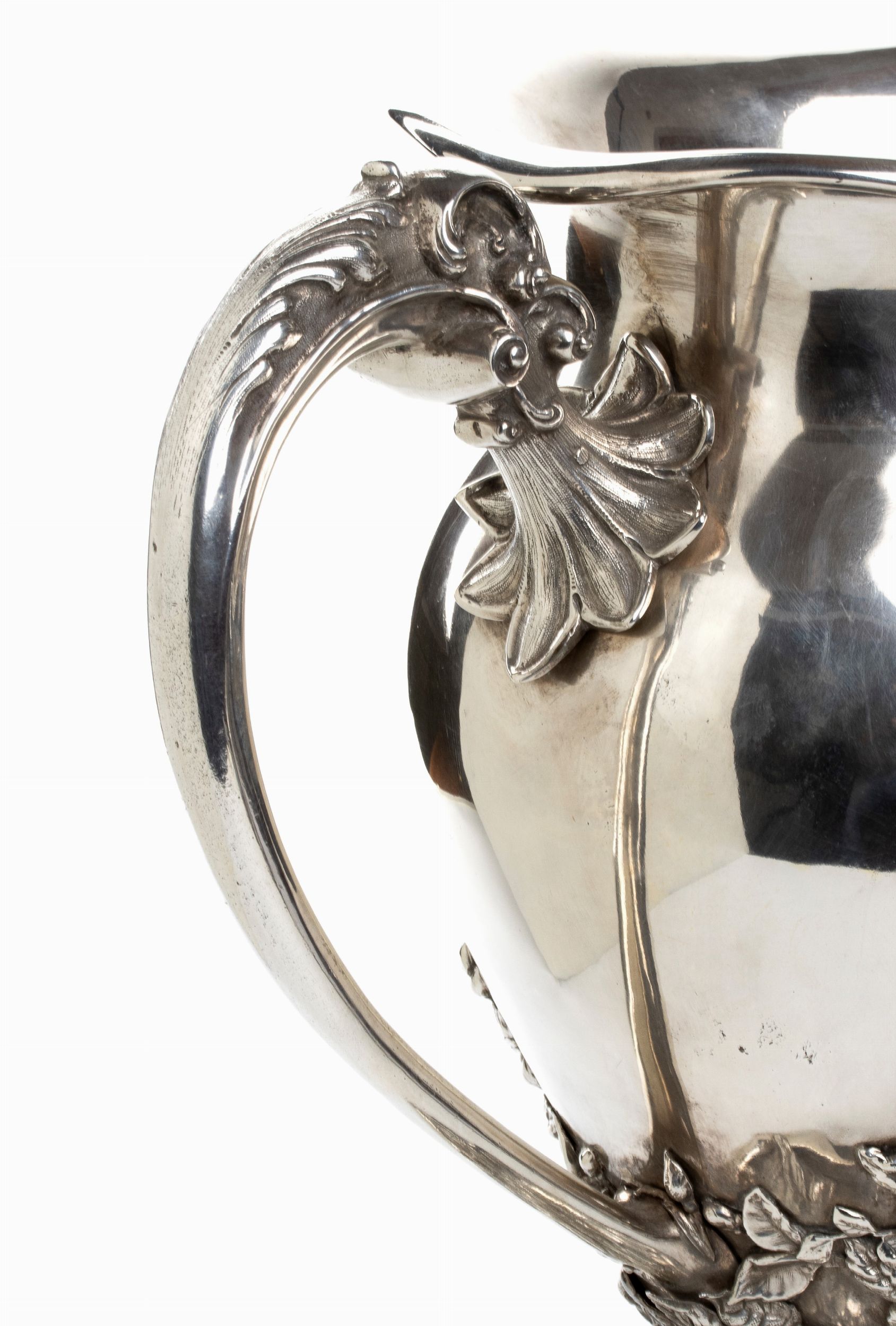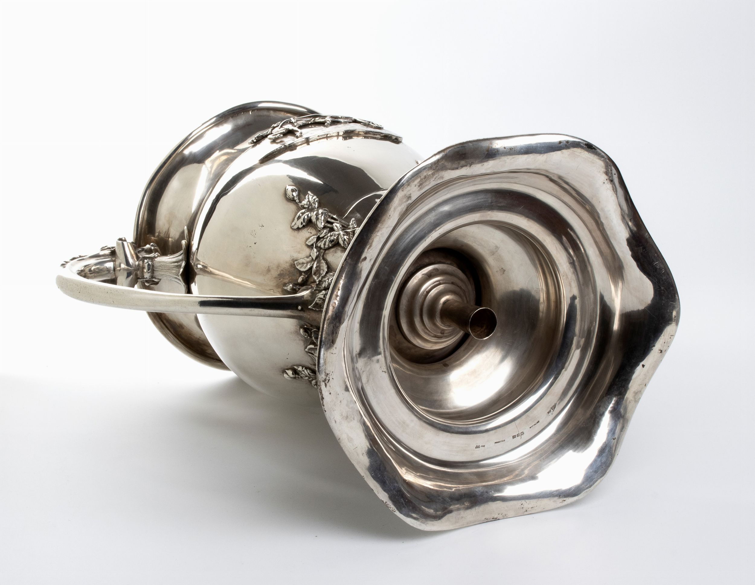 Su una base a cupola a gradini con bordo ondulato applicato con fiori rampicanti e fogliame; sul corpo è applicato su un lato un cavallo che traina una carrozza, sul lato opposto è incisa una iscrizione di presentazione; i manici ad anello con cappuccio a foglia e terminali superiori a fiore. Argento 925/00, punzonata 925/1000 Fine - Proctor - Sterling e marchi P.W. Ellis & Co.