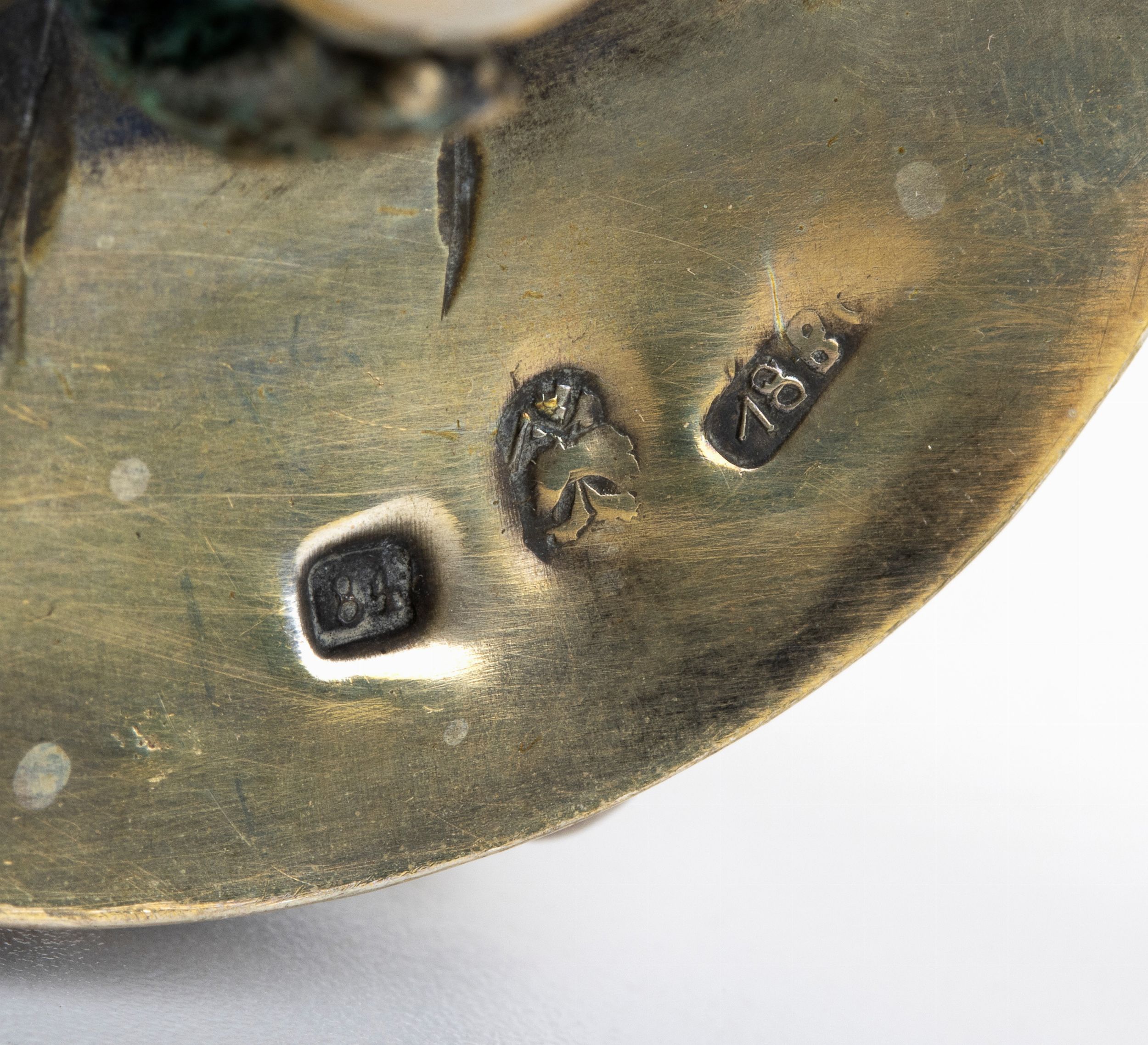 Altezza x diametro: 10 x 5,5 cm. Peso 157 gr. Manifattura Russa (?) del XX secolo in argento fuso con coperchio ad innesto, decorato teste di femminili, poggiante su tre piedi a zoccolo animale. Punzonato con marchi apocrifi Russi del XIX secolo per l'argento al titolo di 84 zolotnik (875/1000).