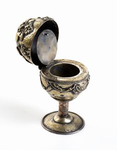 in argento fuso con coperchio incernierato, decorato con festoni e teste maschili, poggiante su un piede circolare.