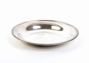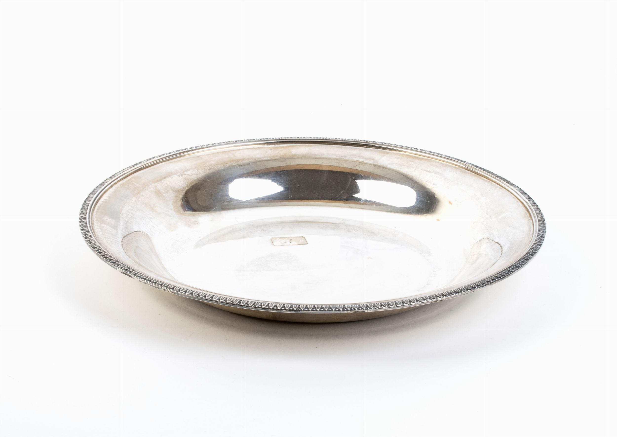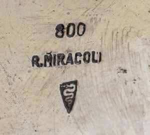 di forma circolare con bordi in stile impero. Argento 800/1000, punzonato 800 - R. MIRACOLI, argentiere Roberto Miracoli.Stato di conservazione: **** buono, minori segni d'uso commensurati all'uso nel tempo.
