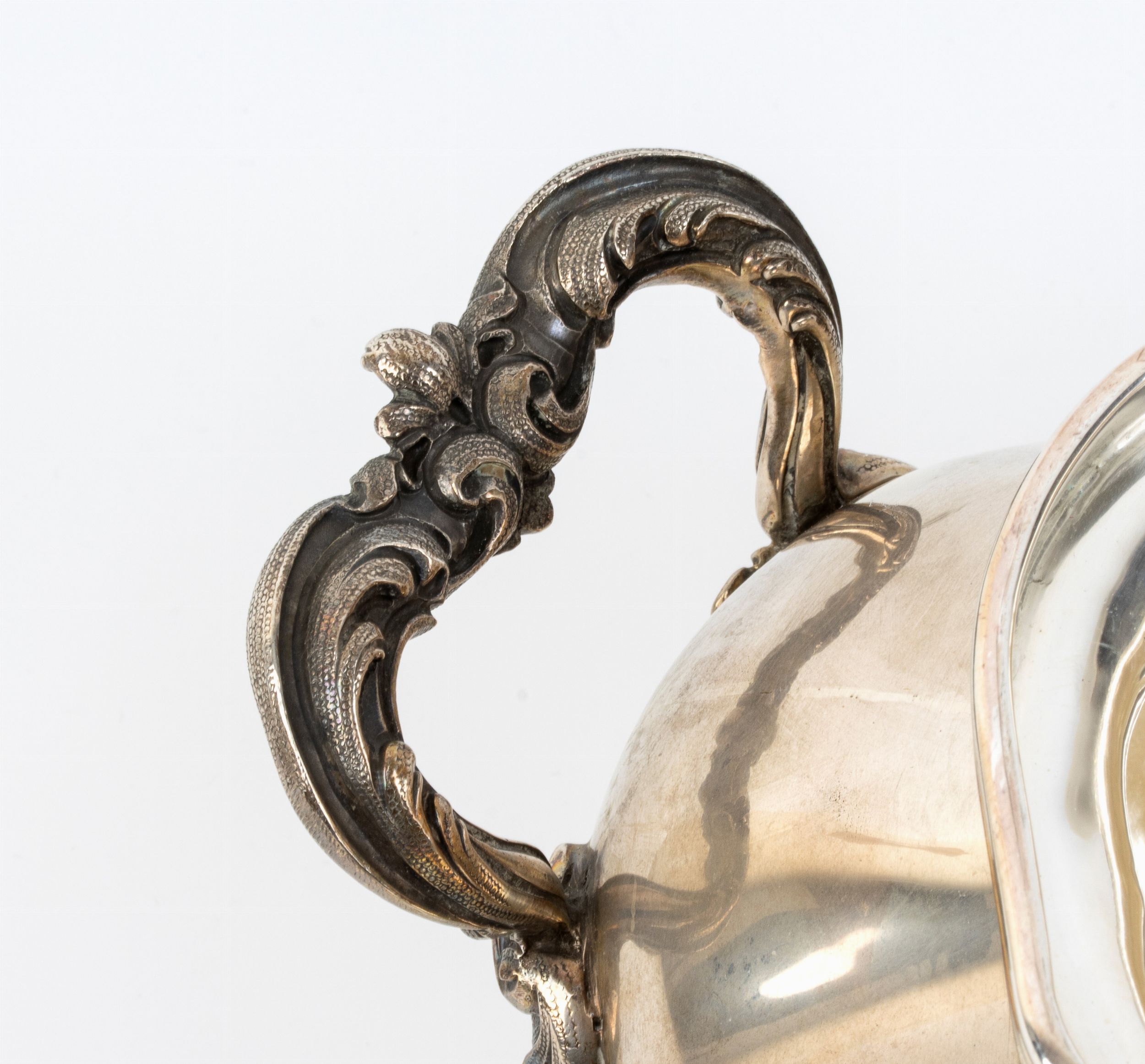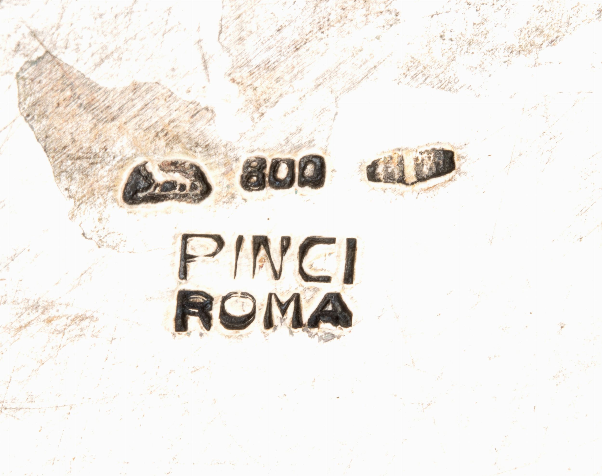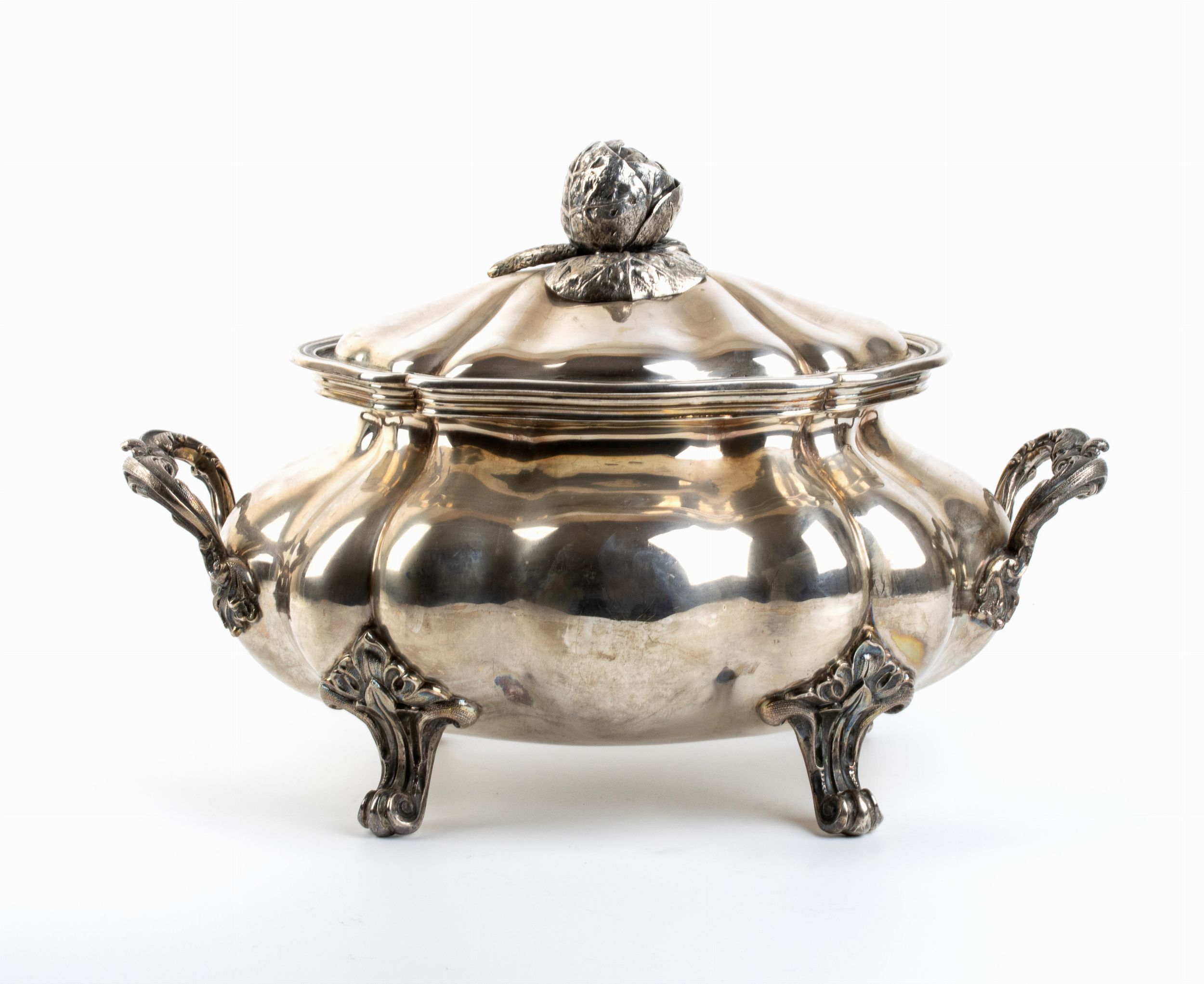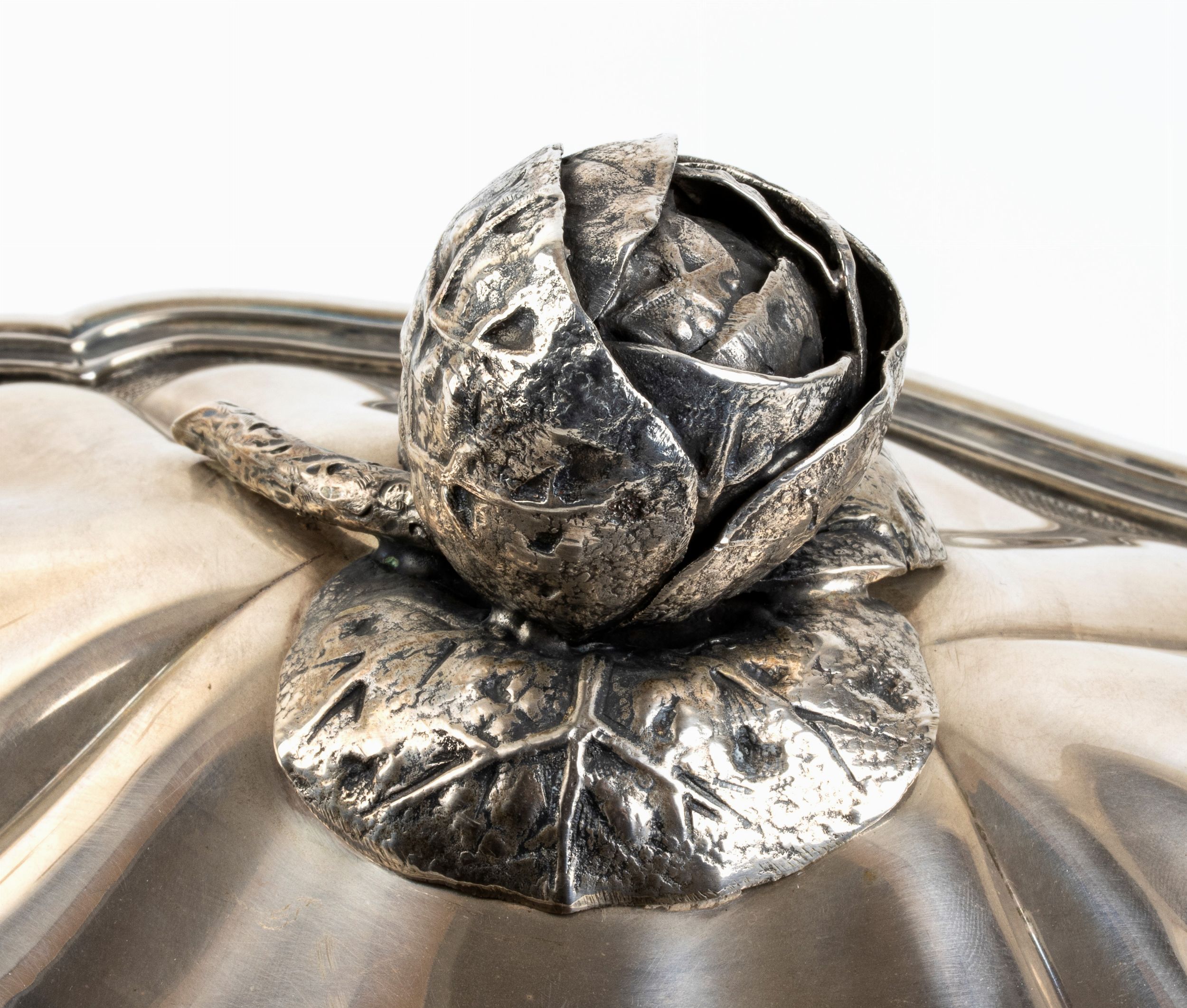 di forma ovale con corpo bombata, manici laterali a motivi vegetali, coperchio con presa a forma di rosa. Argento 800/1000, punzonata 800 - PINCI ROMA - marchio del fascio.