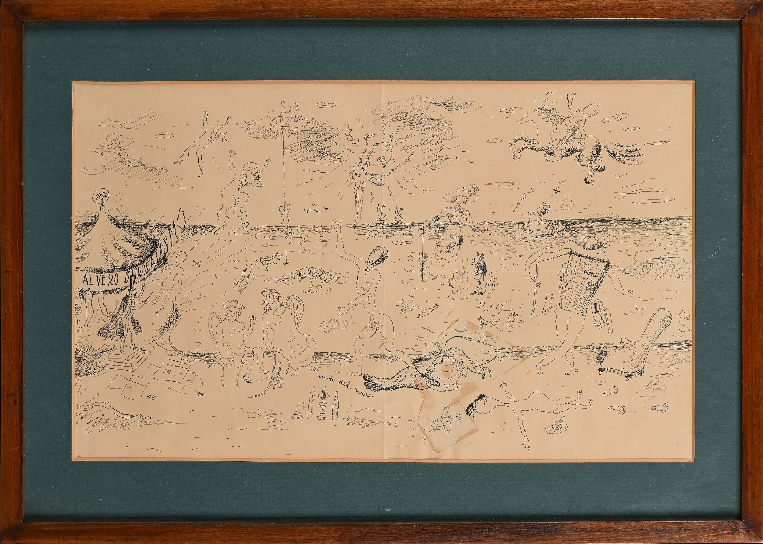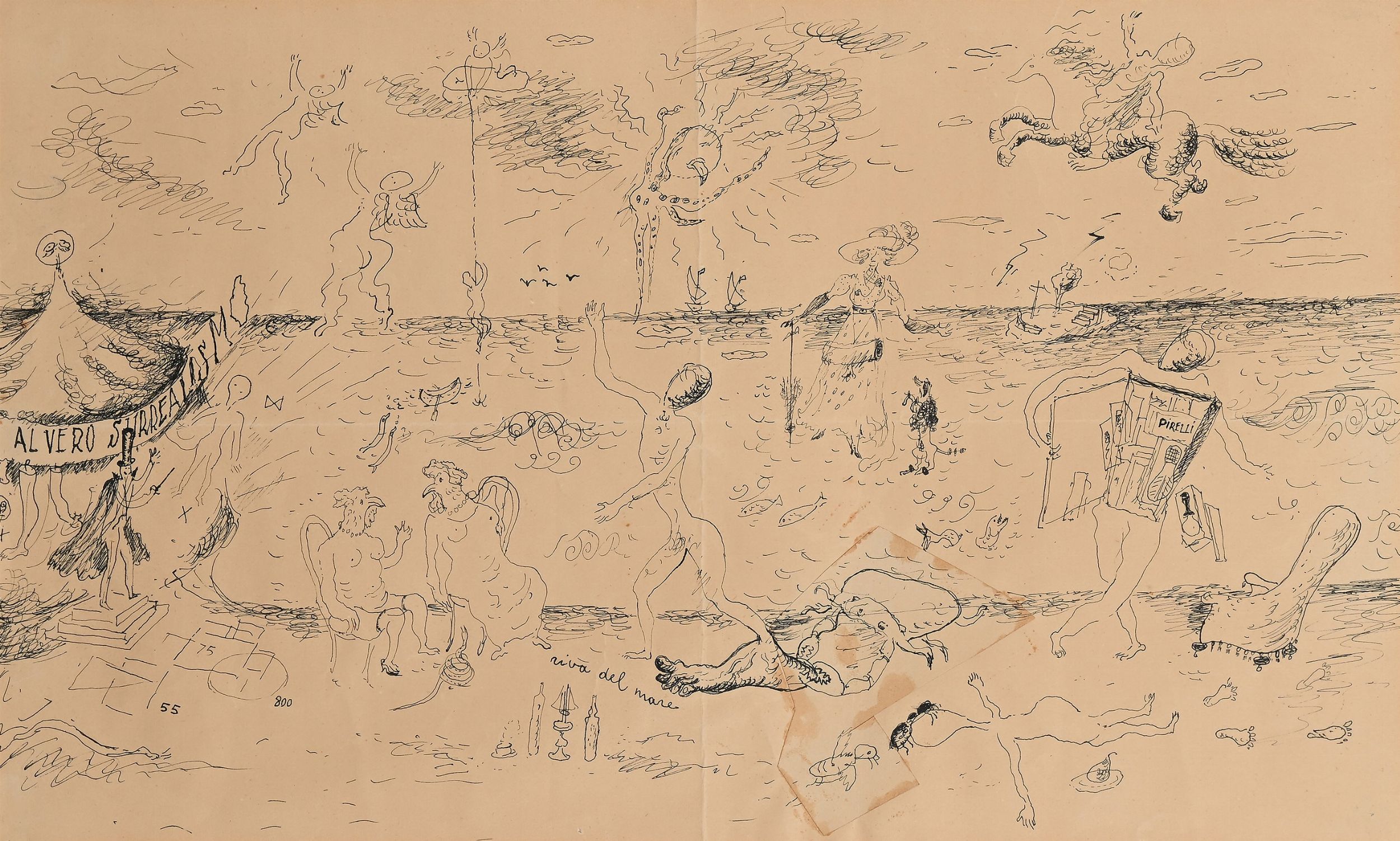 Da sinistra raffigurati due personaggi di Savinio, un uomo di Dalì e Mirò, un manichino e una poltrona di De Chirico, in volo due angeli di Savinio ed un cavallo di de Chirico