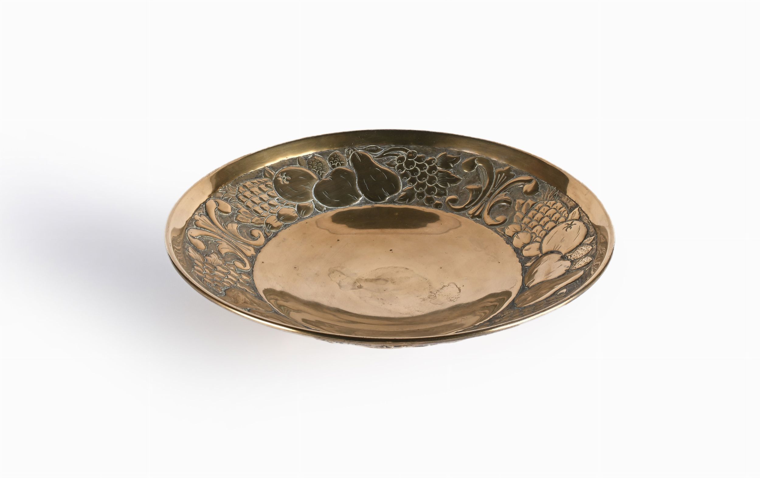 forma circolare su basso piede ad anello, con frutta sbalzata ed incisa lungo la circonferenza