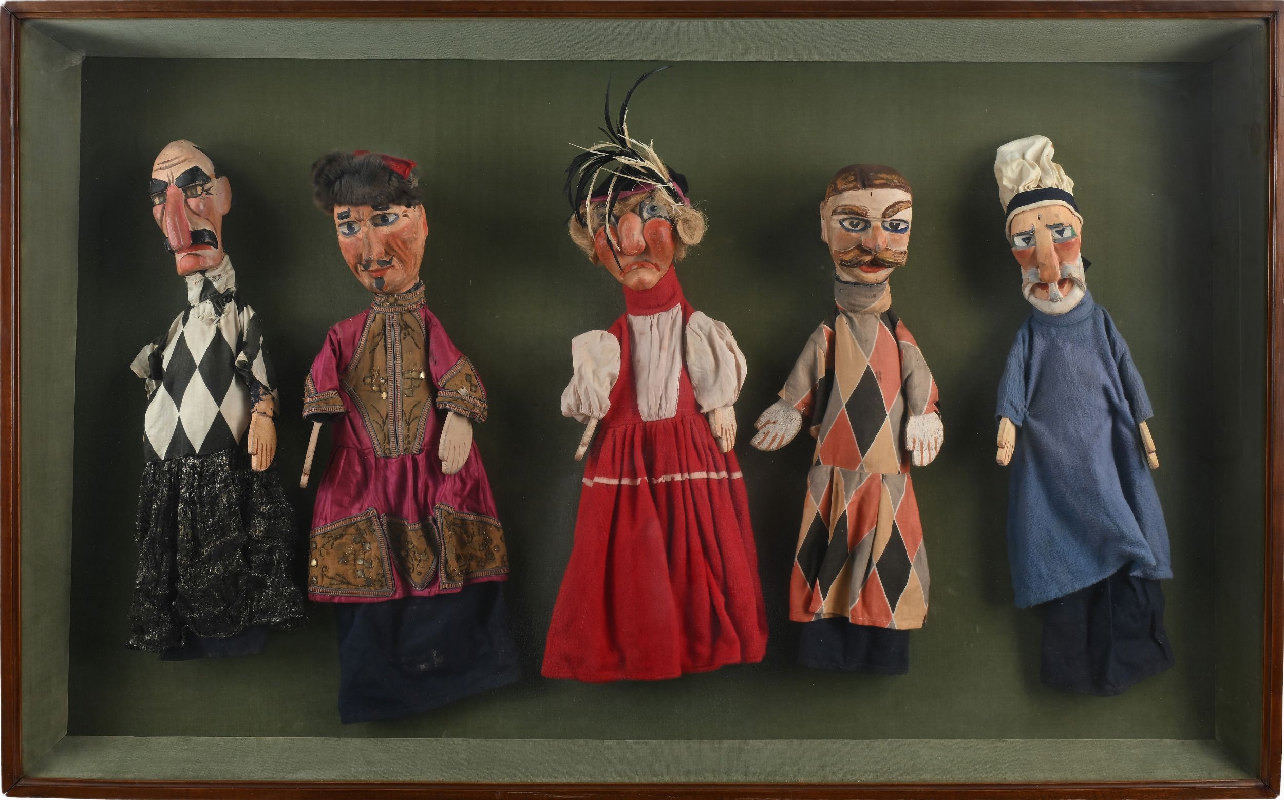 ognuno con tratti caricaturali nei volti, informi e grotteschi nell'abbigliamento; custoditi entro teca a parete