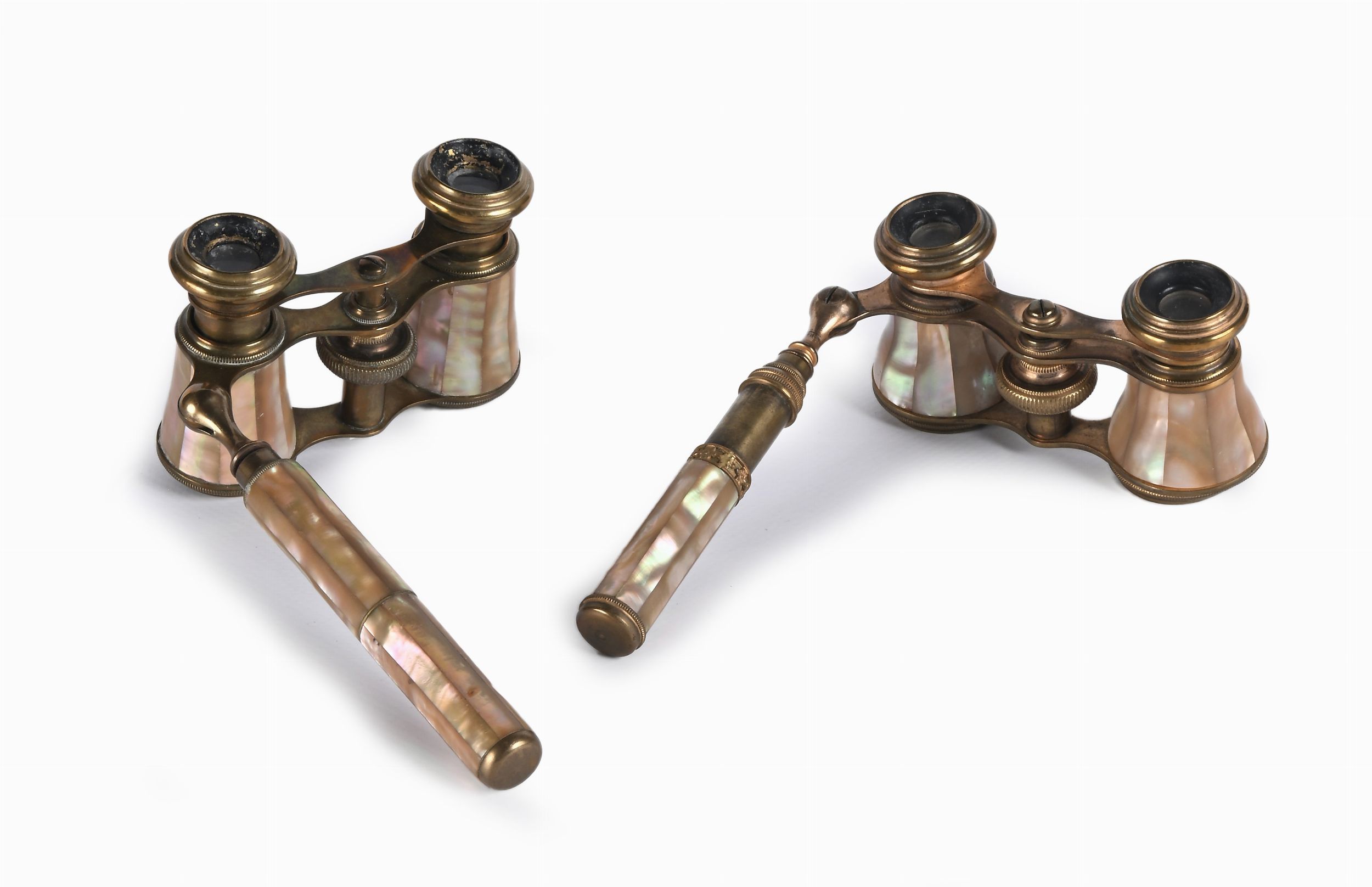 Due binocoli da teatro in ottone e madreperla, Francia, fine del XIX secolo