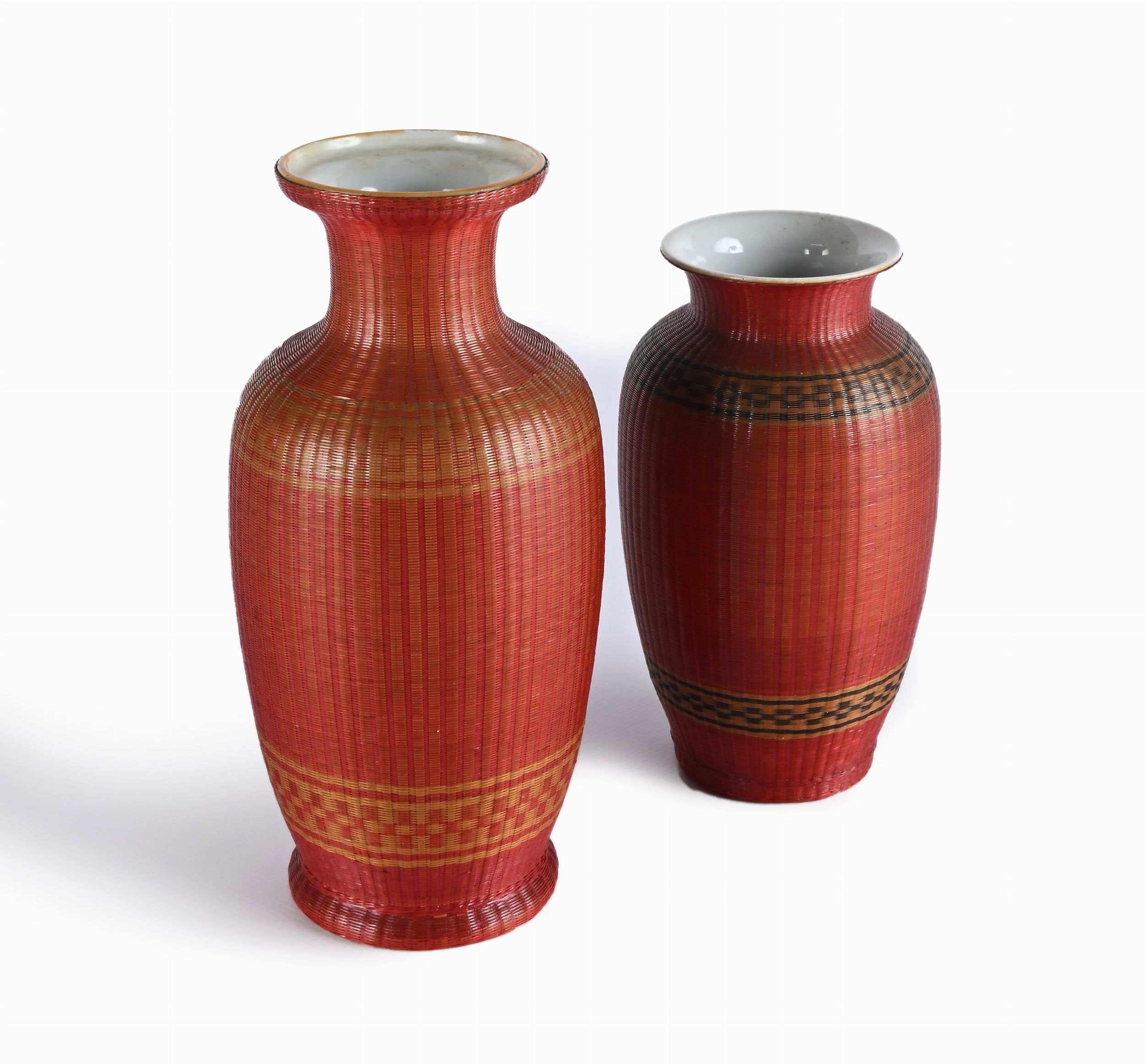 Due piccoli vasi in porcellana e rattan rosso, Cina
