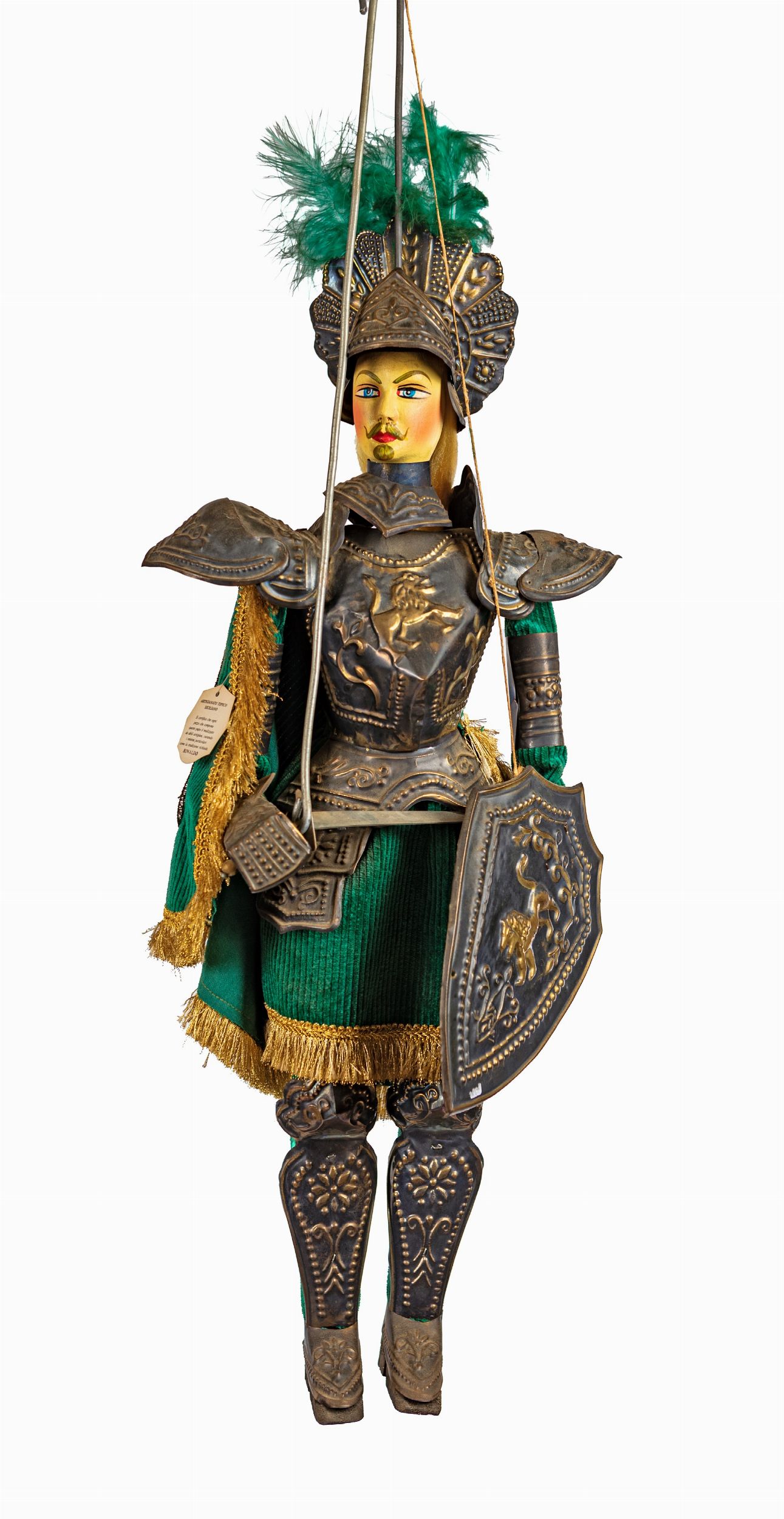 altezza cm 95 e cm 80 rispettivamente la figura femminile è caratterizzata da grandi occhi mobili azzurri, lunghi capelli castani, abito ricamato e guarnita da gioielli; il paladino reca volto ed arti in legno dipinto, abito in tessuto, elmo, scudo ed armatura in lamina stampata