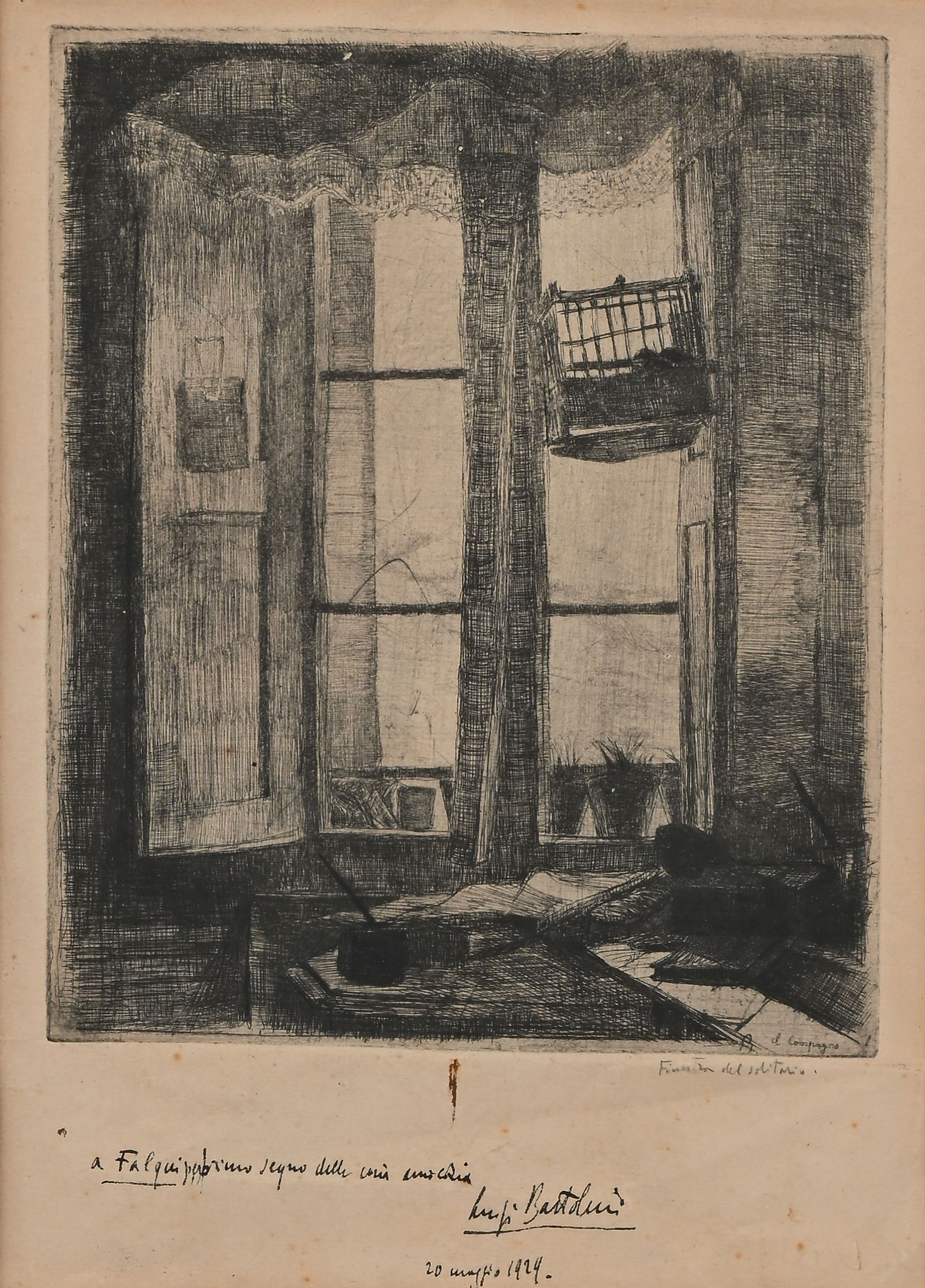 1924 Titolo, firma, dedica e data Finestra del solitario, A Falqui per segno della mia amicizia, Luigi Bartolini, 20 maggio 1924. In lastra B. Al compagno.