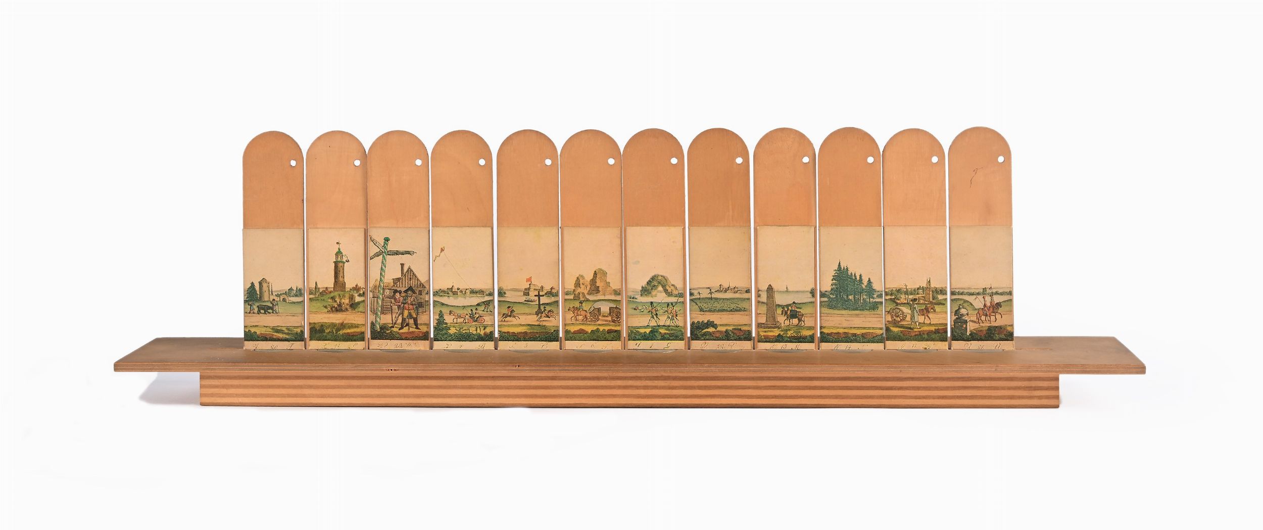 cm 12x45x6,5 composto da dodici stecche in legno con sommità centinata, decorate su entrambe le facciate da paesaggi animati da architetture, figure ed animali; profilo inferiore rifinito da un cilindro metallico per essere inserito nel supporto a formare una staccionata. Reca marchio GiBi Milano impresso sotto la base