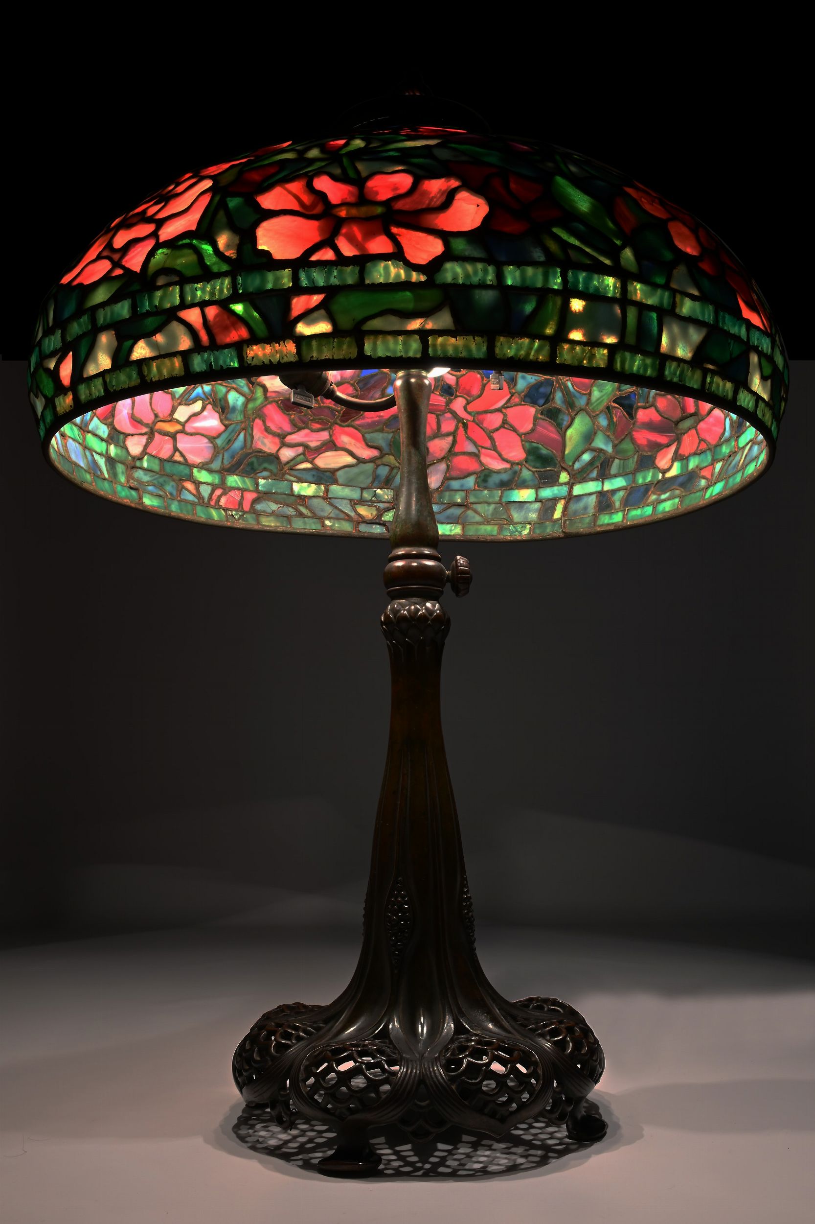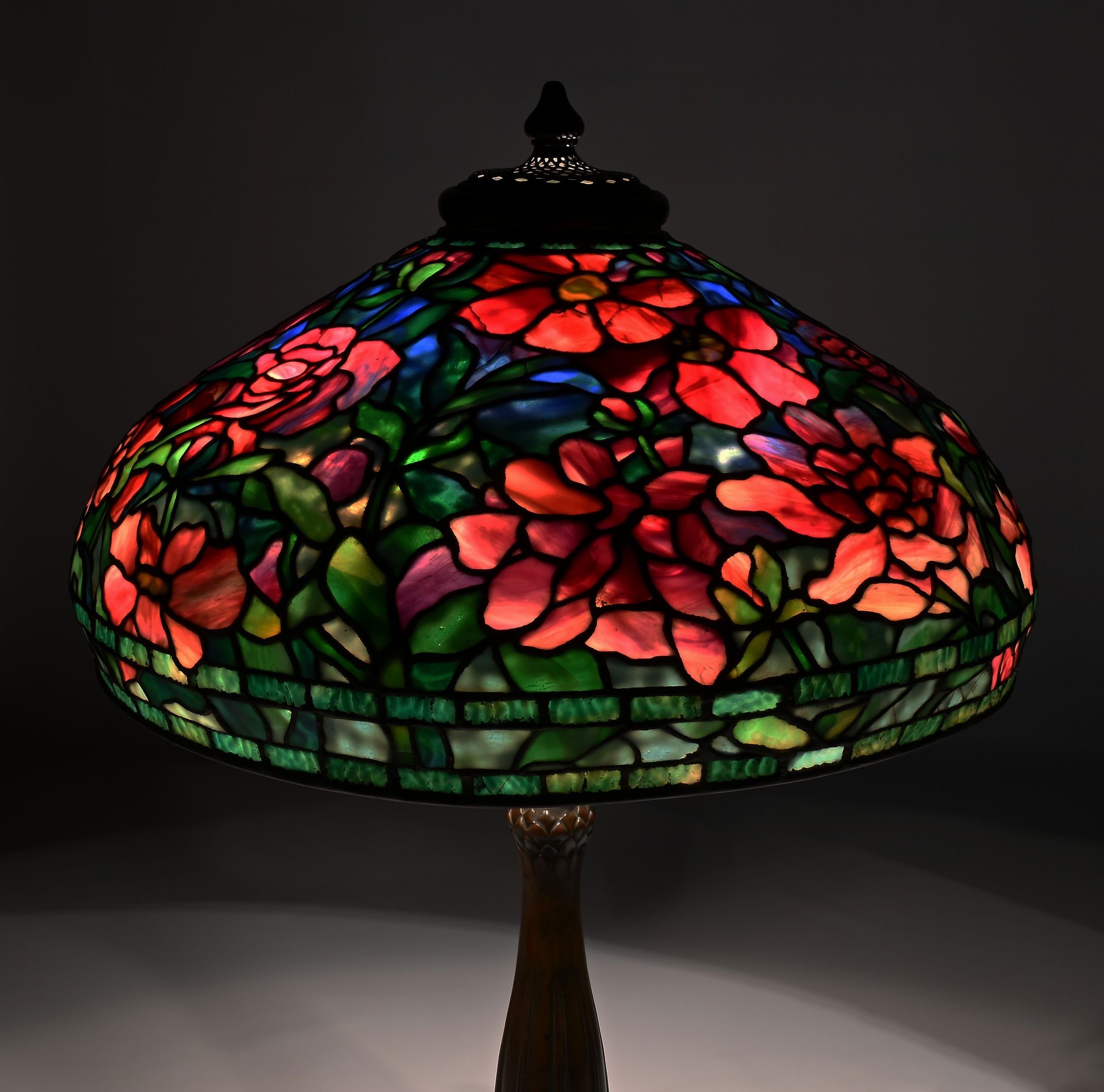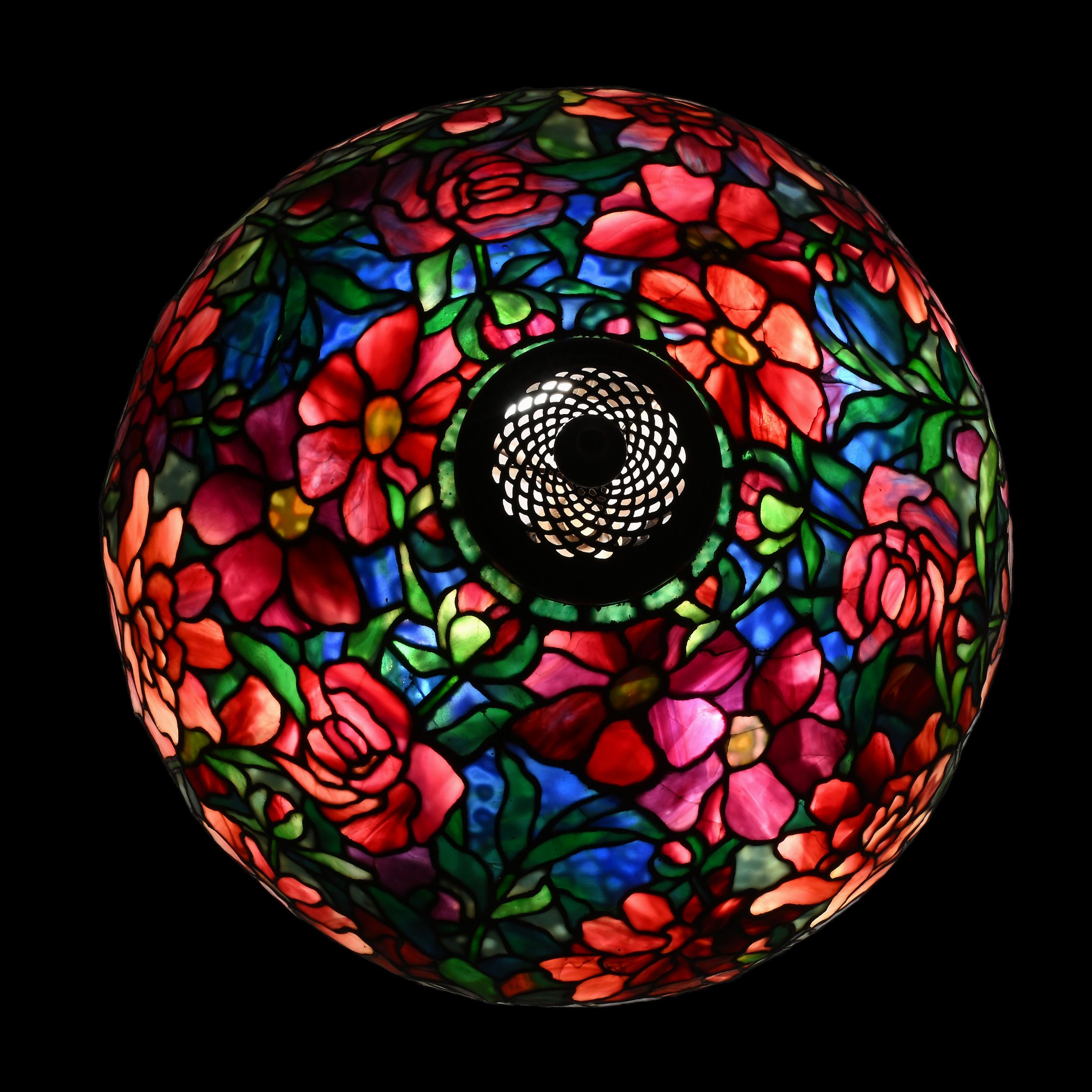 diffusore a cupola di tessere di vetro policromo legate a piombo a decoro floreale; lungo il bordo tessere geometriche verdi si dispongono su due file sovrapponendosi, idealmente, sul fitto disegno naturalistico. Base reticolata in fusione di bronzo a quattro luci. Marchio della manifattura con numero di modello impresso sotto ad un piede Tiffany Studios New York 397 e lungo il profilo interno del diffusore Tiffany Studios / New York / 1505.