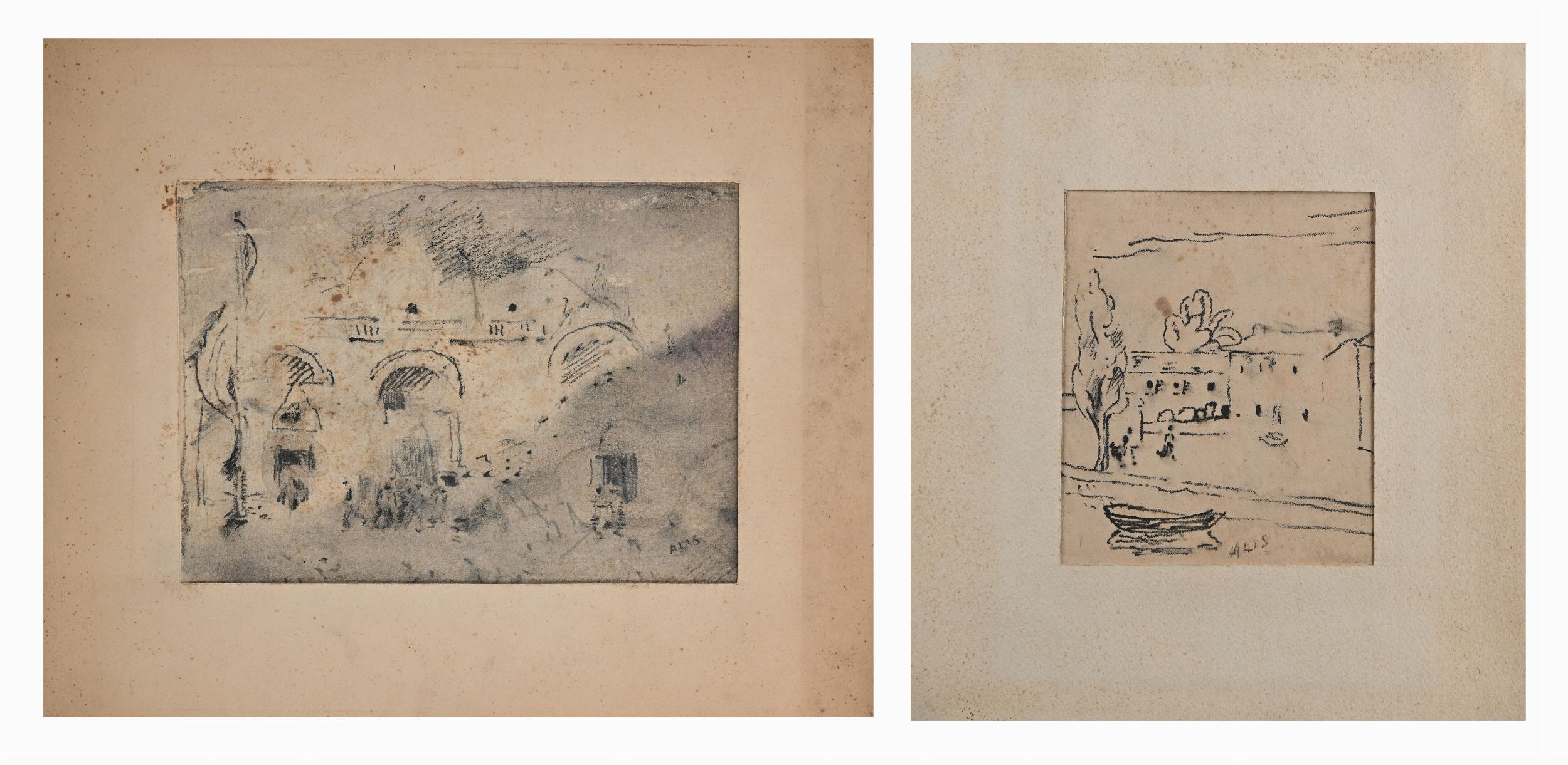 2) Paesaggio con casolari e barca, matita su carta, cm 16x12, firma Alis.