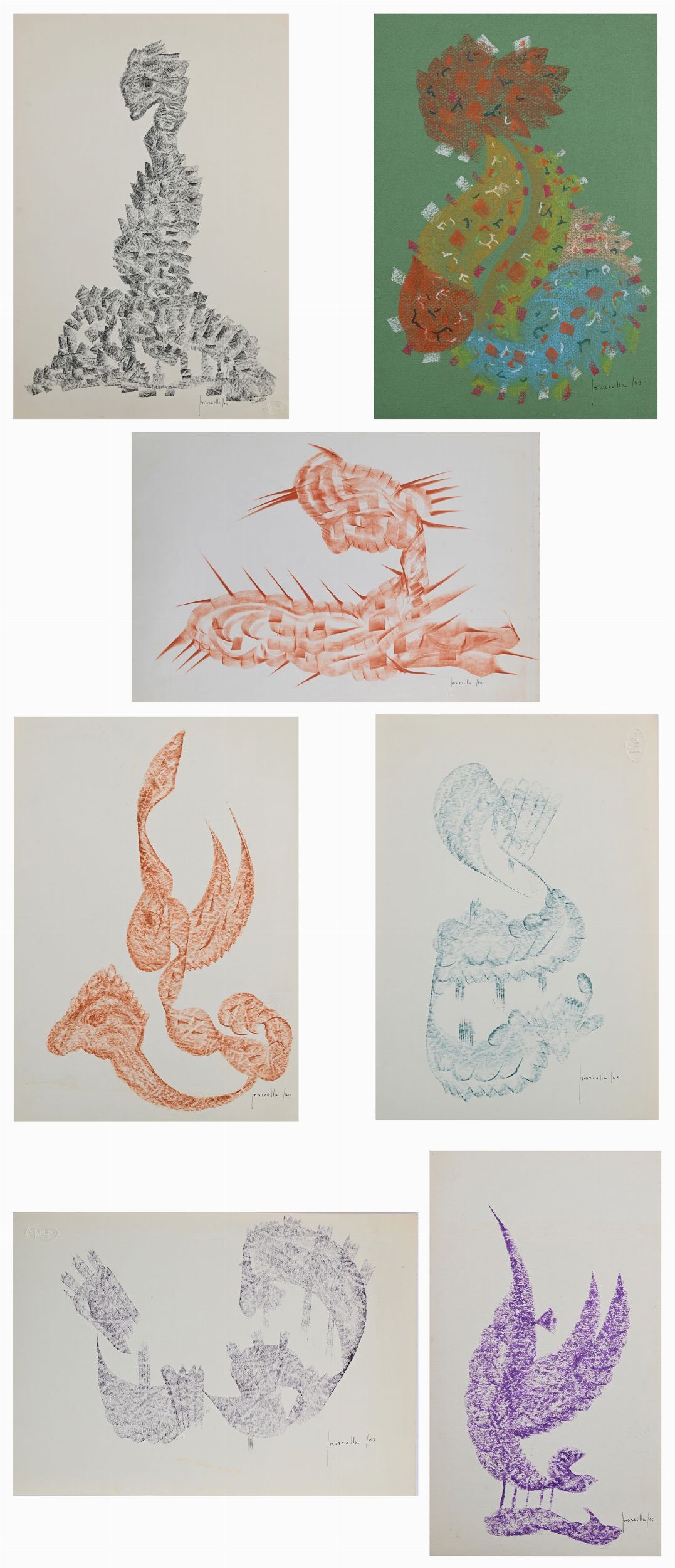 due opere misurano cm 50x35. 4 misurano cm 35x24. una misura cm 31x22. Tutte firmate Piazzolla. Alcune datate 1969 altre 1970
