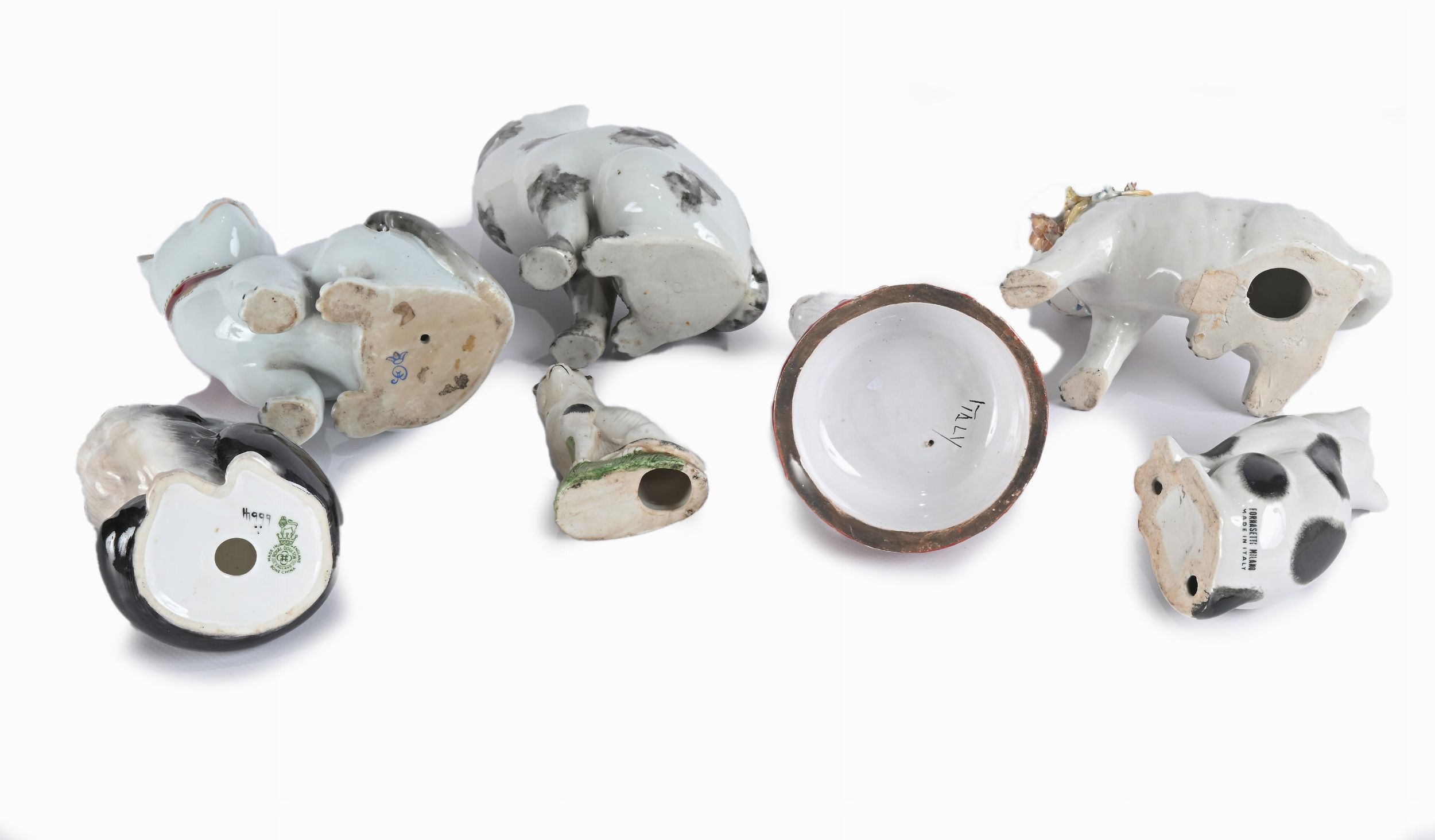 Sette figure di gatto in ceramica policroma, manifatture ed epoche diverse