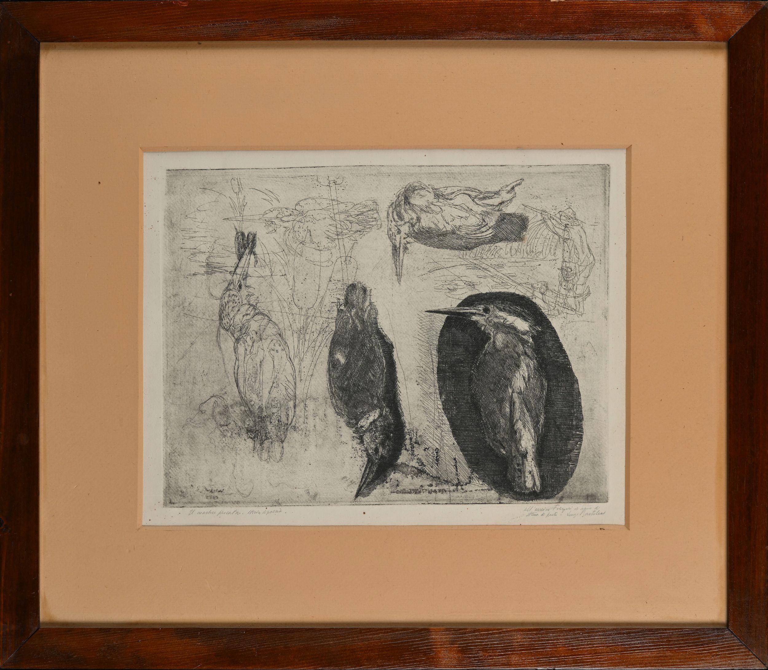 Acquaforte, cm 35x50 (foglio) ; 25x33 (lastra) - in cornice cm 49x56 1935 Firma titolo e dedica a matita Il martin pescatore. Storia di poesia. All'Amico Falqui in segno di stima di poeta. Luigi Bartolini. Firma e data incise in lastra L. Bartolini 1935