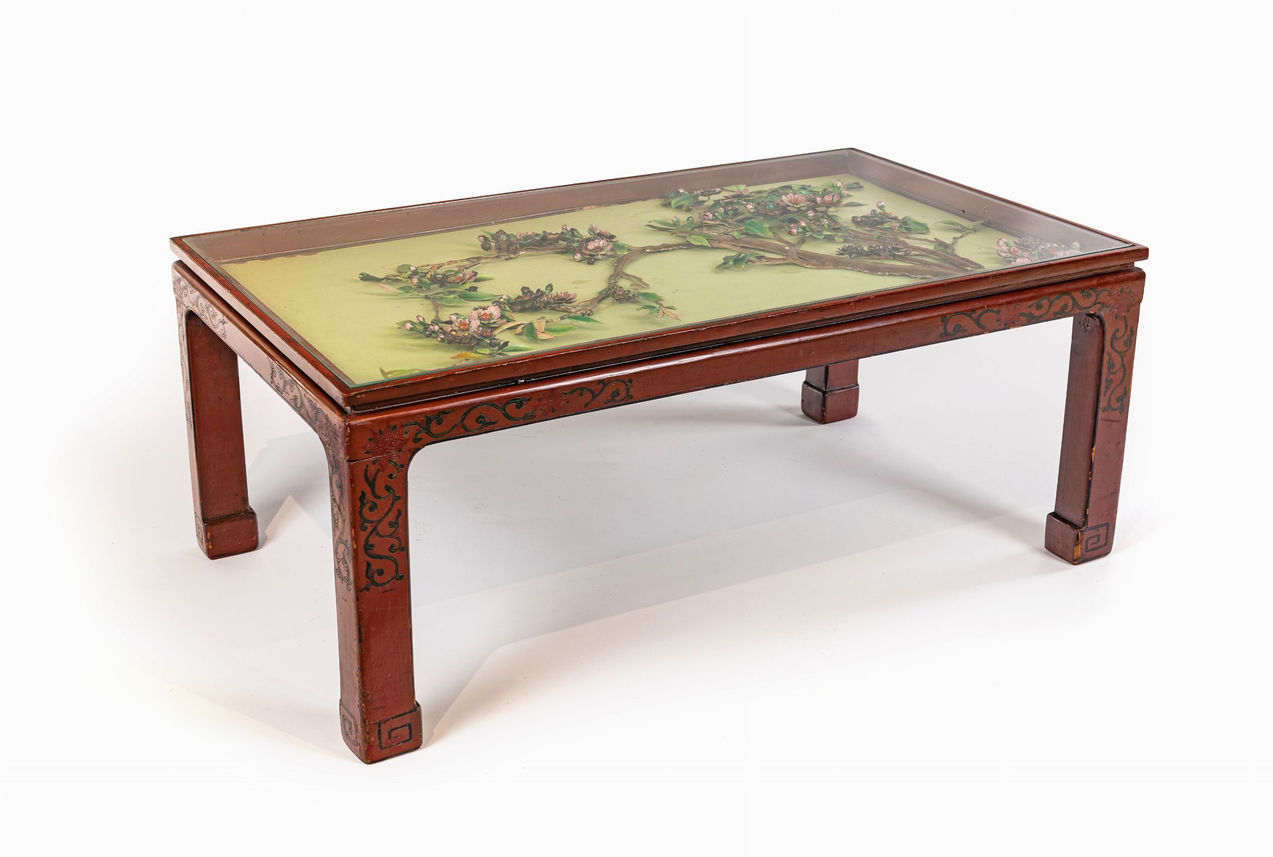 piano caratterizzato da una composizione di rami di pesco fioriti realizzata in rame smaltato in cromia realistica e da piccole api sparse, protetta da un cristallo; struttura lineare decorata da volute vegetali stilizzate nere