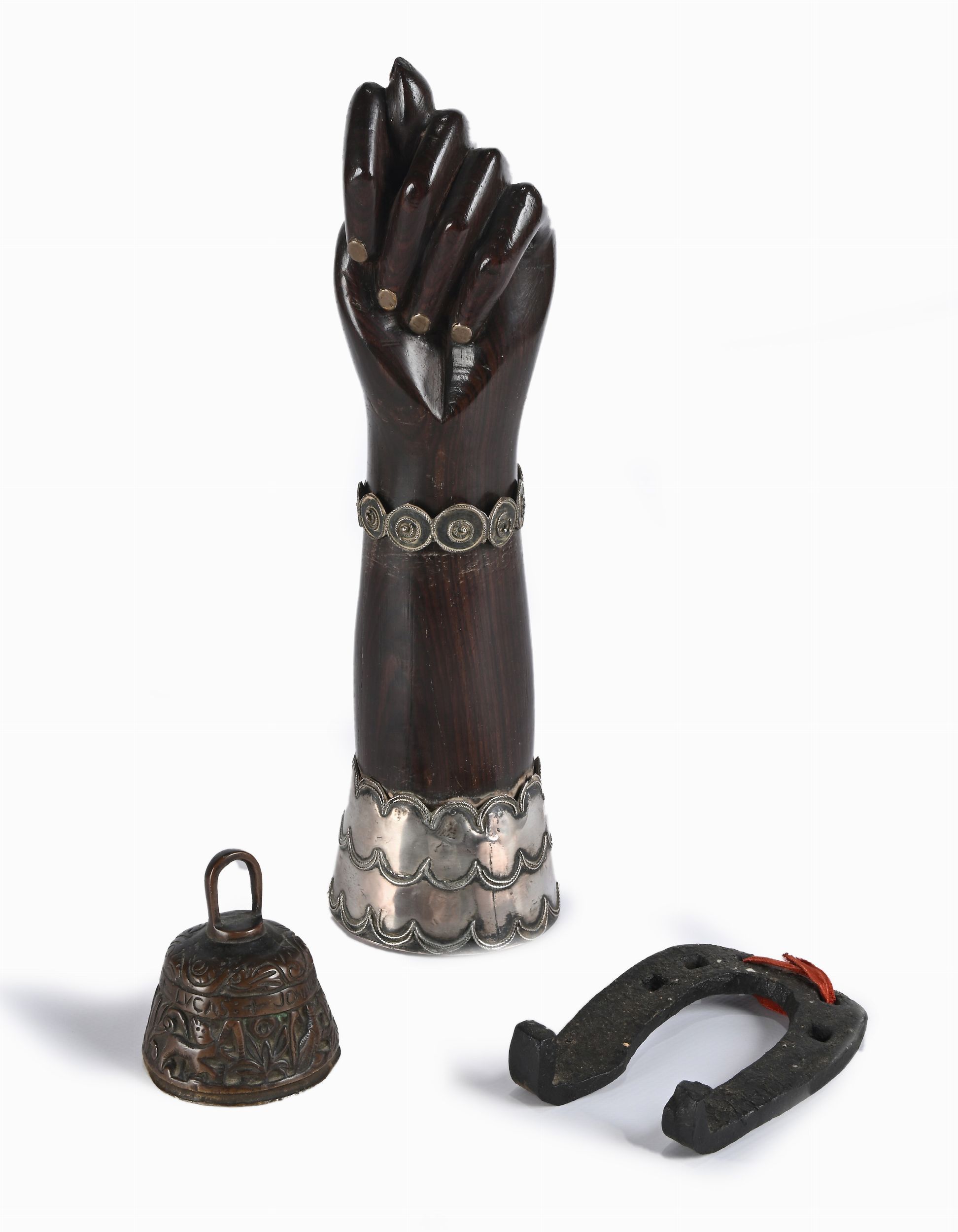 grande mano scaramantica in legno, cm 30,5; ferro di cavallo cm 11,5x7,5 e campanella in bronzo con apostoli cm 6,5x6