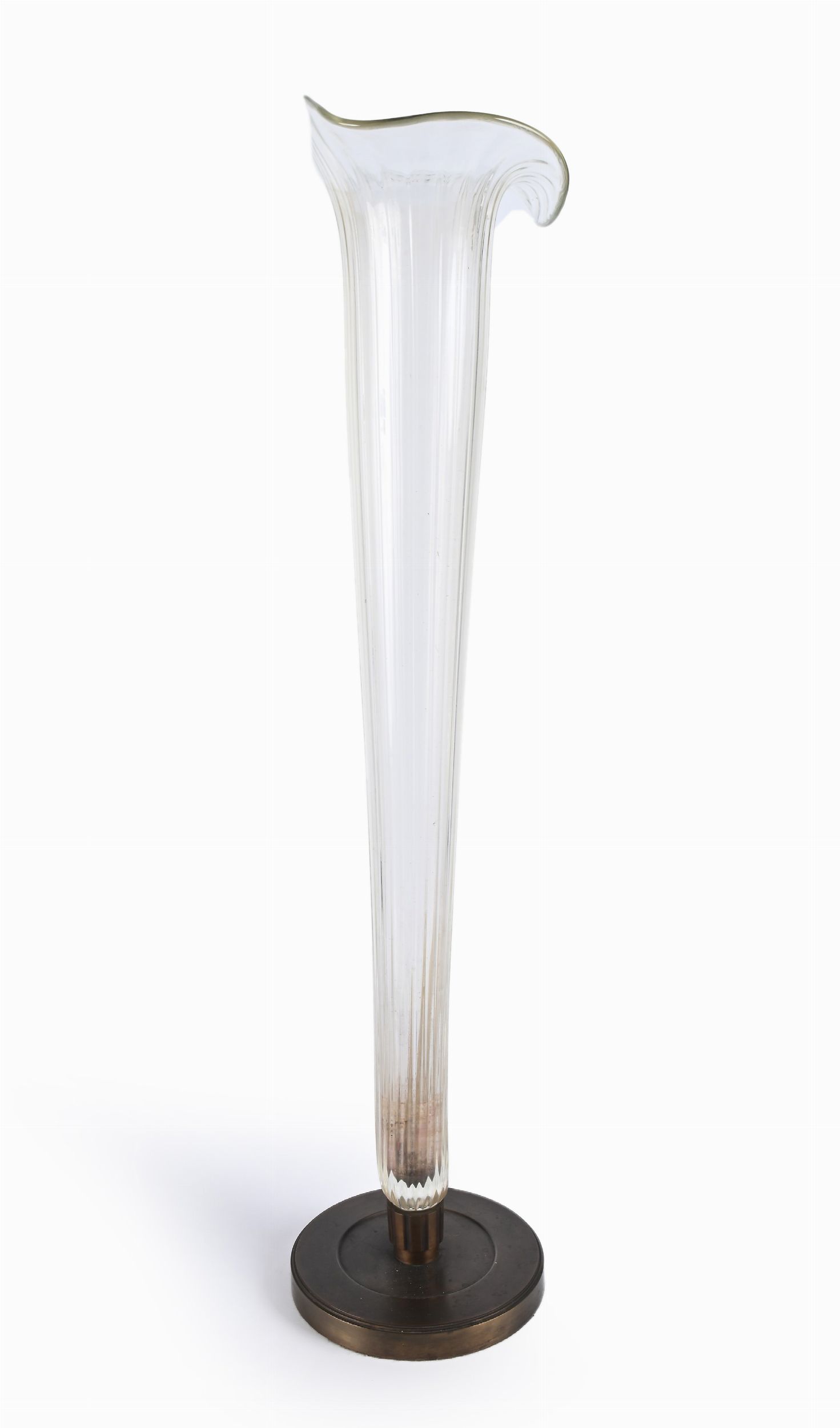 lungo stelo rigato e bocca a forma di convolvolo con un lembo ripiegato, base circolare in ottone