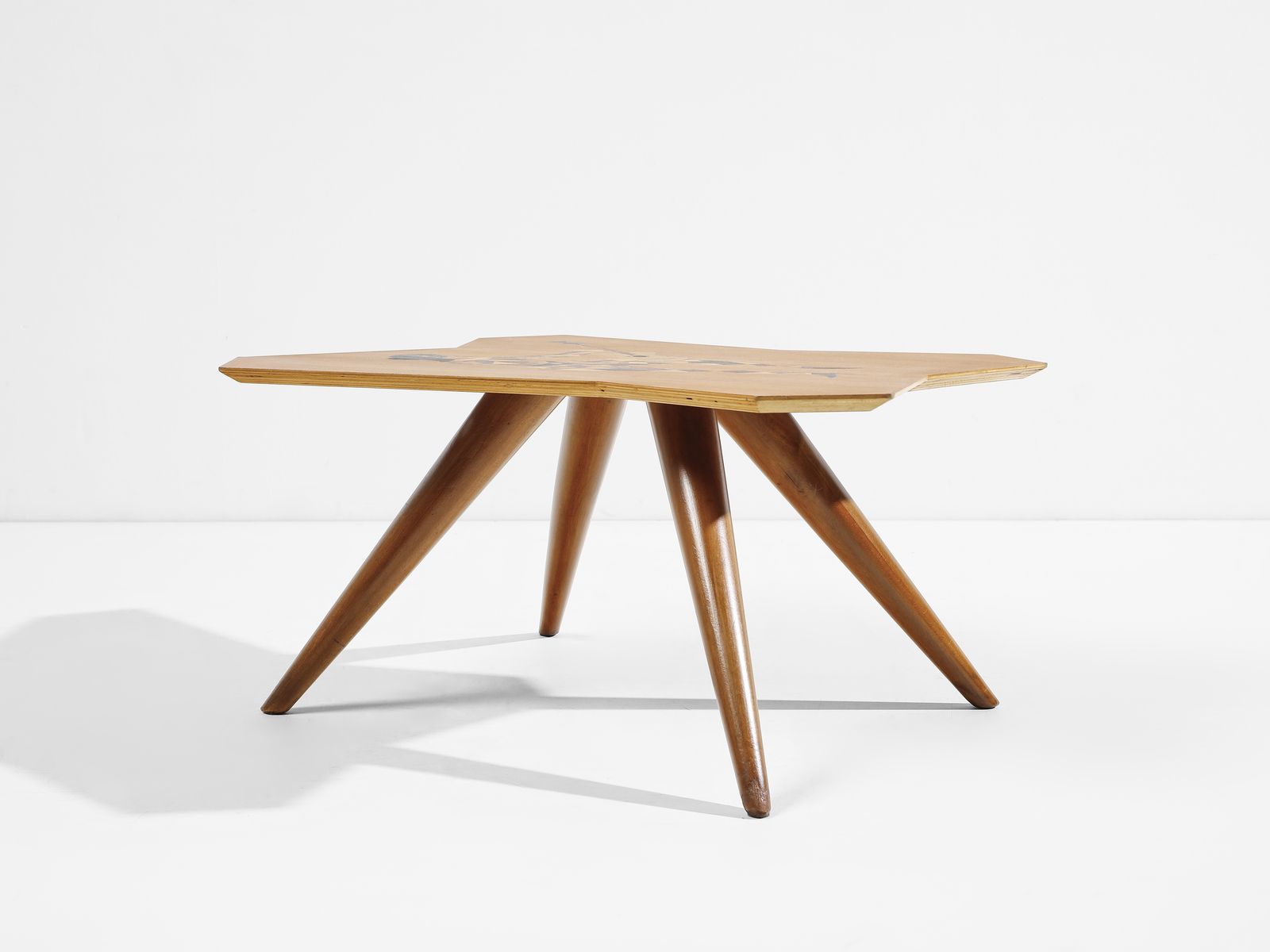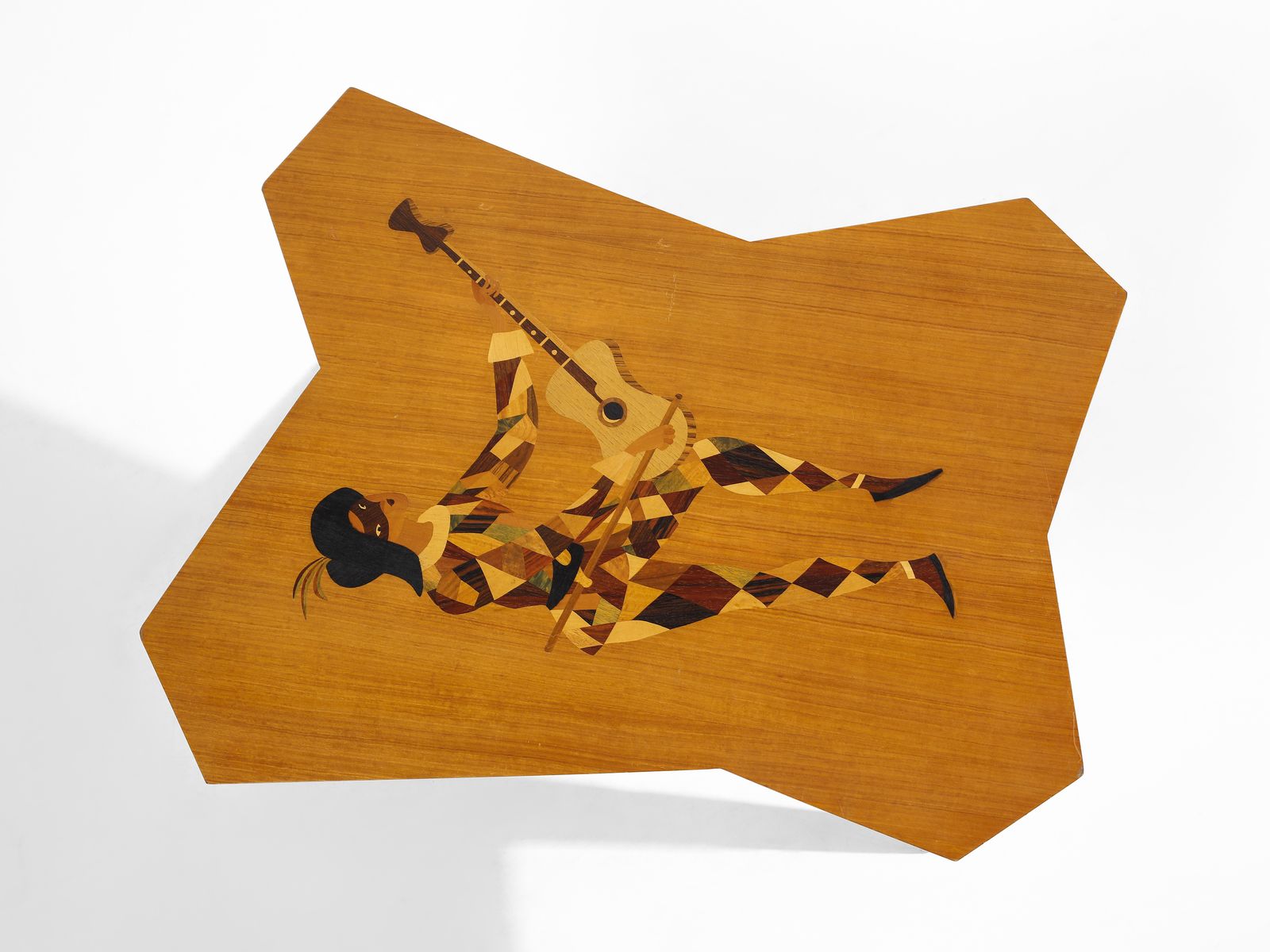 attribuito. Tavolino da salotto con piano poligonale decorato con Arlecchino