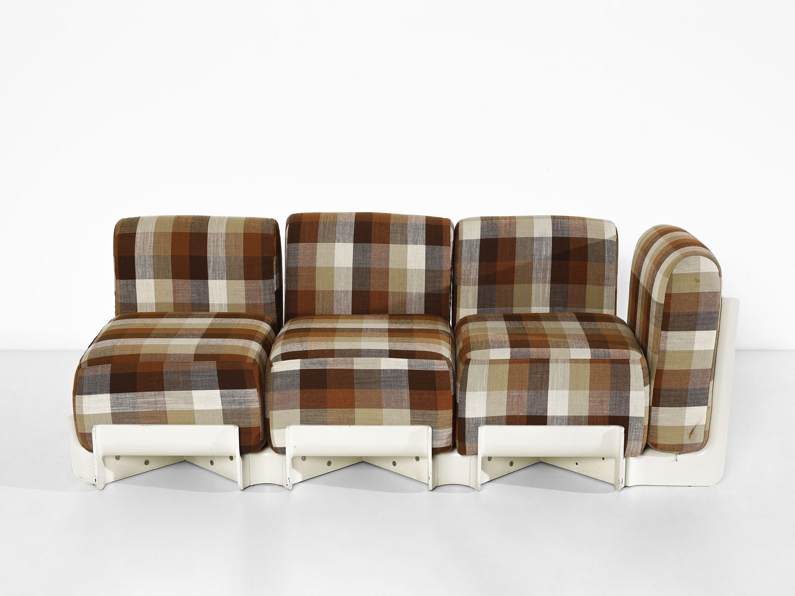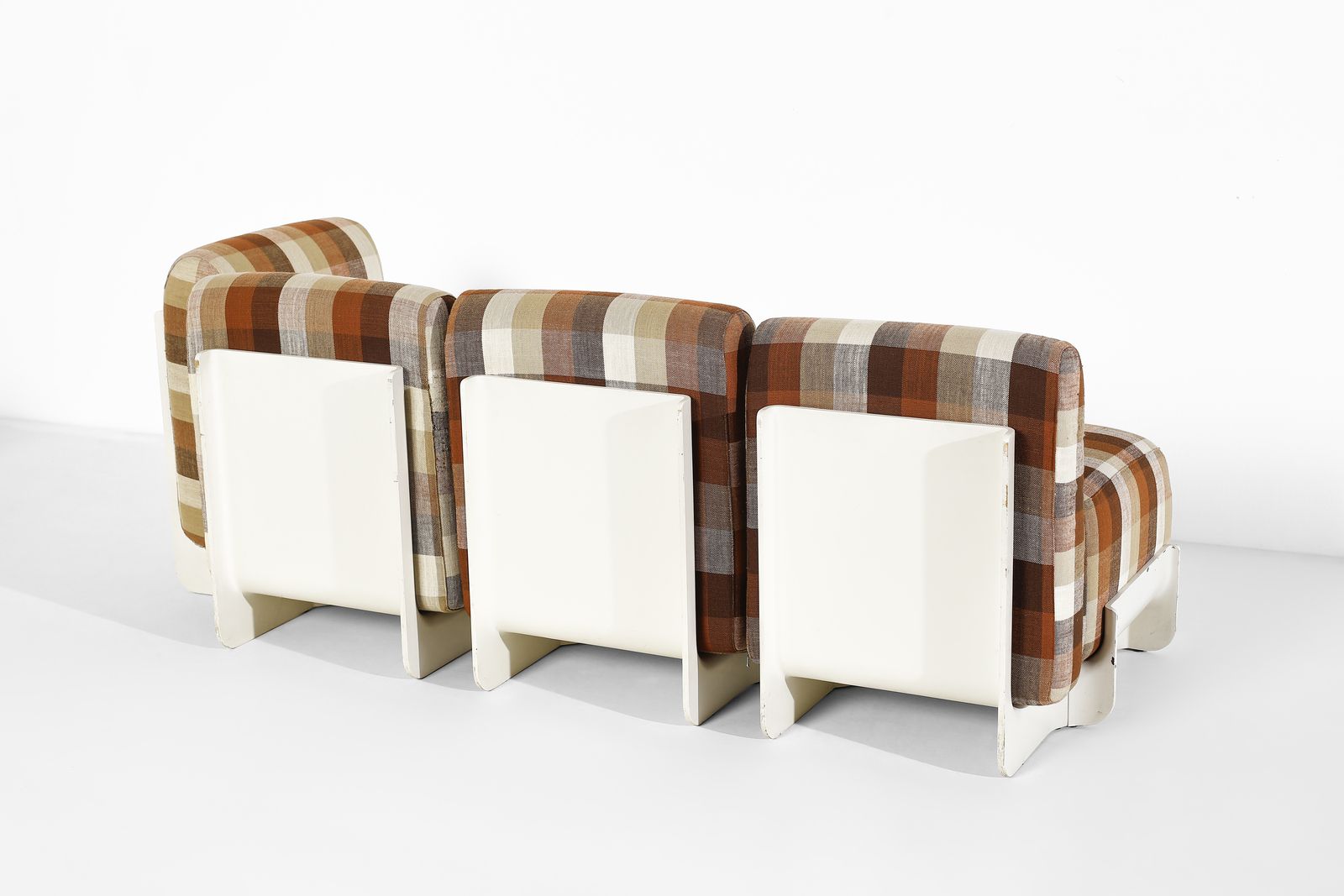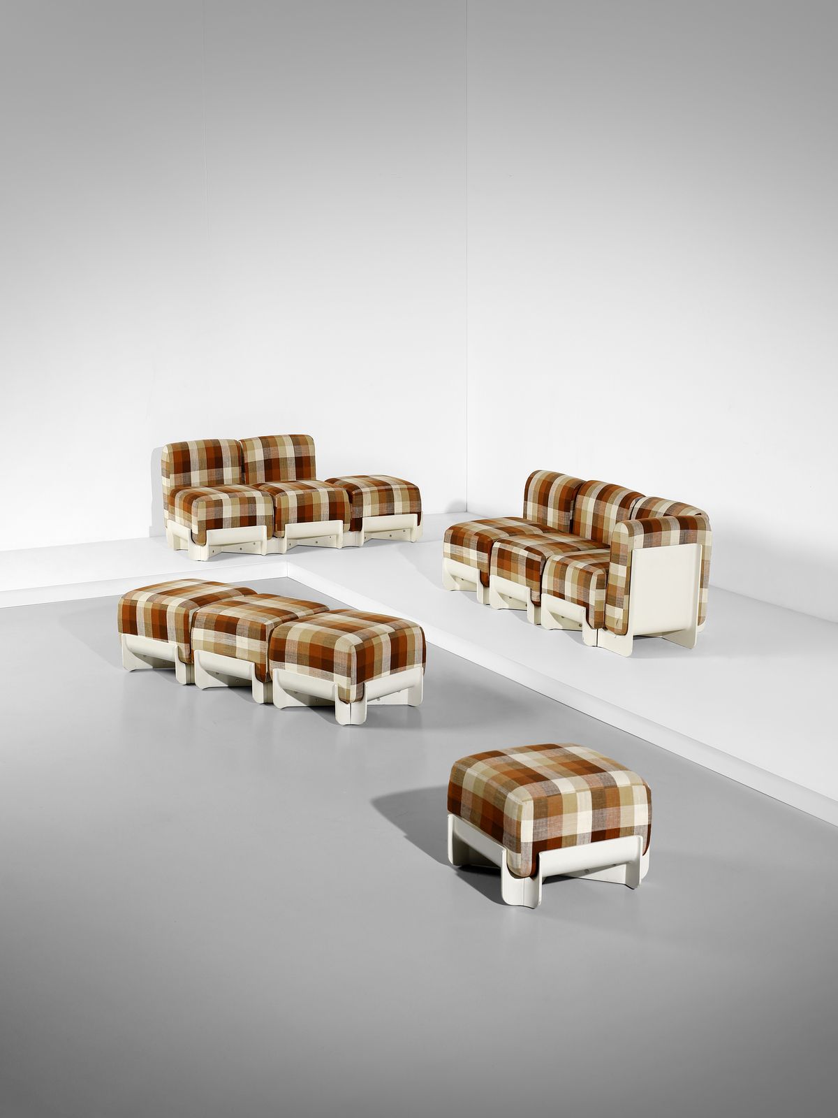 Etichetta con numero di collaudo 270159 e marchio della produzione sotto i cuscini. marchio della produzione sotto la base.Domensioni: modulo con spalliera 69 x 53 x 76 cm. modulo senza spalliera 39 x 55 x 55 cmBibliografia: Domus n. 502, Settembre 1971, pagina pubblicitaria