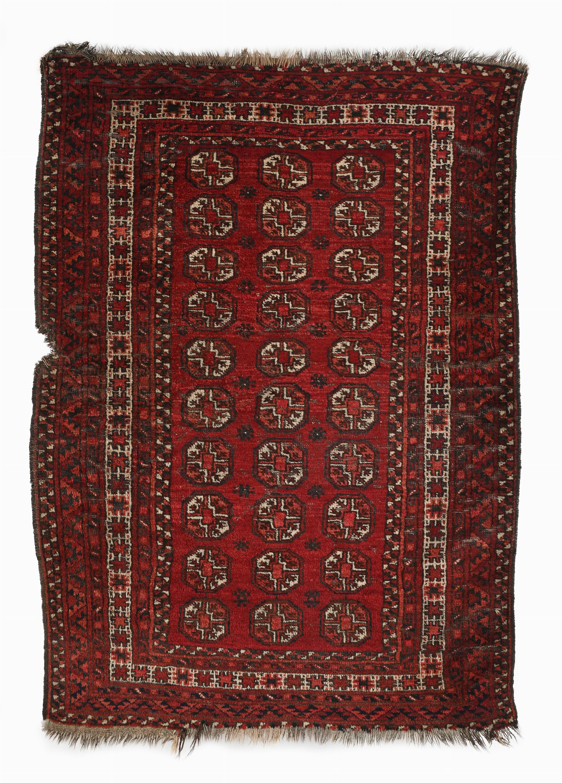 caratteristico disegno a gul disposti su tre file parallele; molteplici piccole bordure, la principale bianca. Consunto