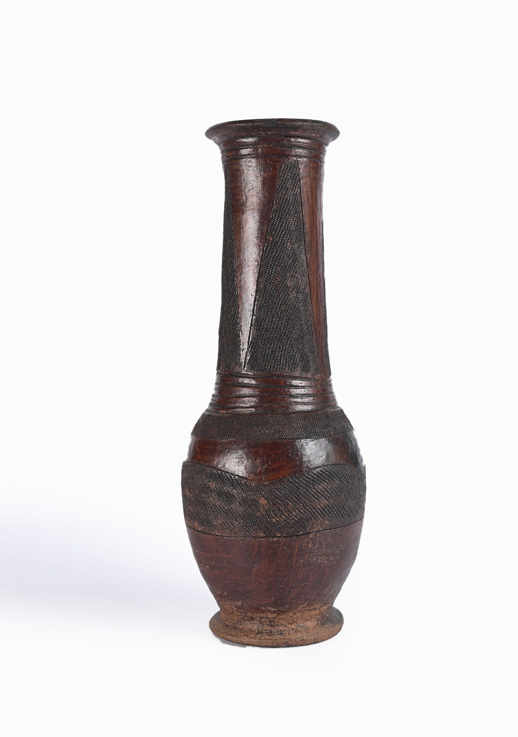 con lungo collo cilindrico caratterizzato da riserve triangolari incise; analoga lavorazione ripresa lungo l'ampia fascia che circonda la circonferenza; basso piede ad anello