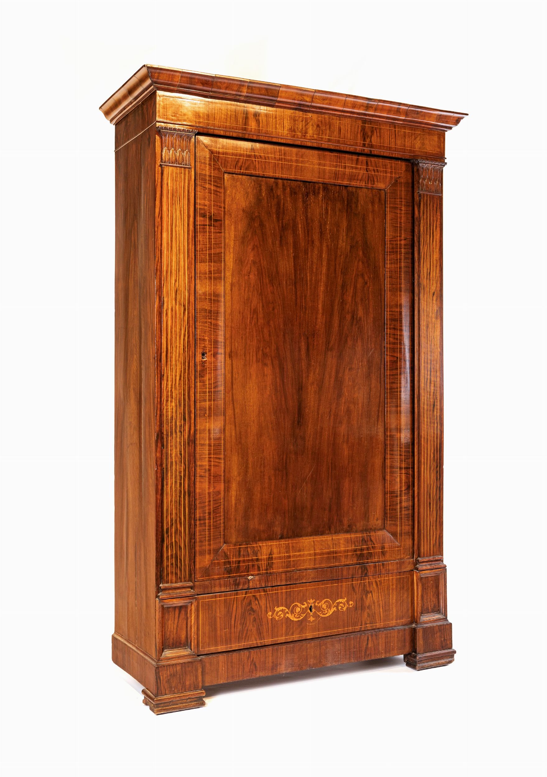 cm 200x120x50 caratterizzato da un'anta frontale con specchiatura incassata ed un cassetto sottostante decorato da una minuta tarsia a volute vegetali; lesene percorse da sottili filettature intarsiate, rifinite superiormente da capitelli intagliati delimitano la facciata; piedi a mensola