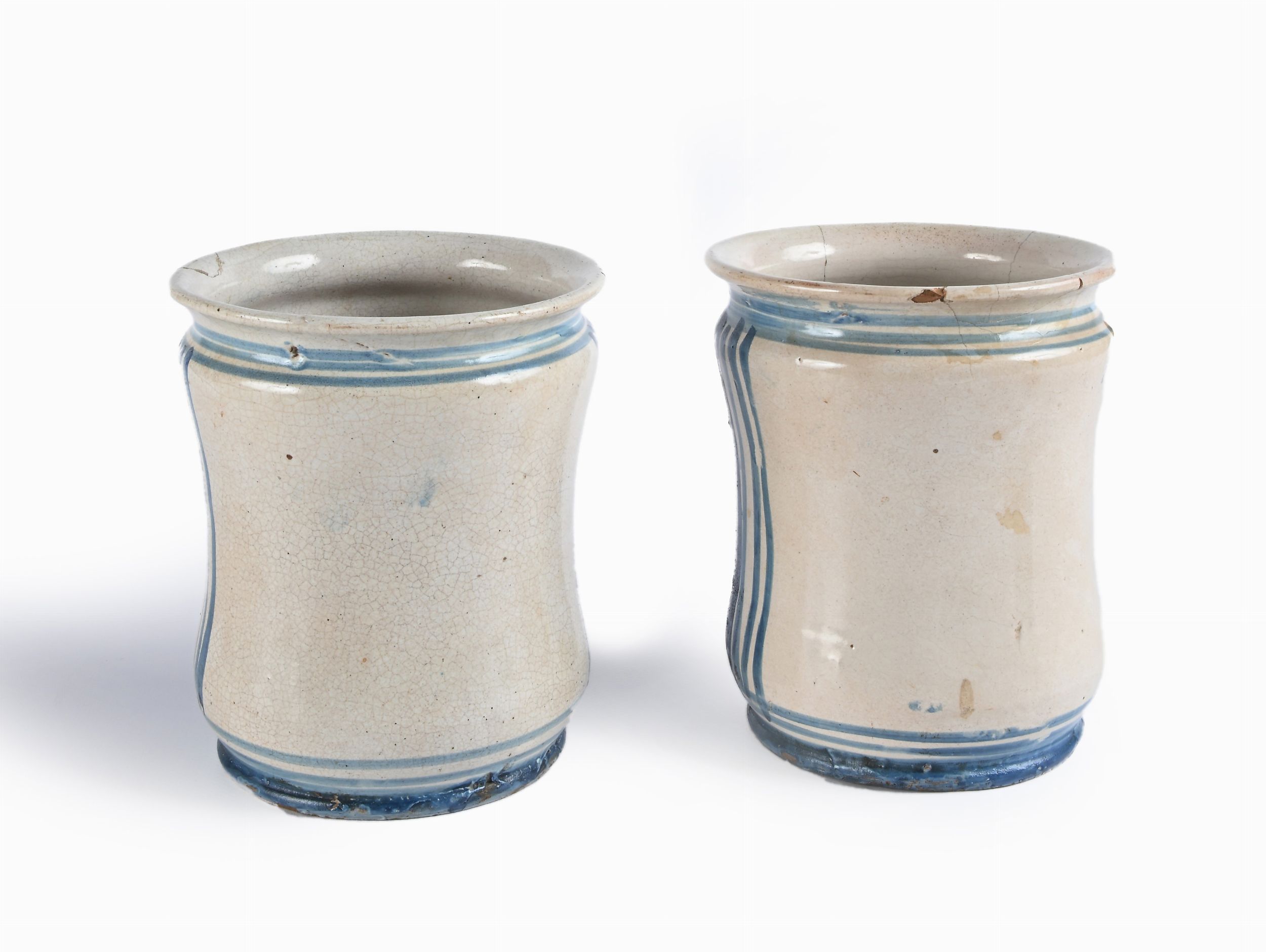 Coppia di antichi albarelli in maiolica bianca e blu, Napoli, XIX secolo
