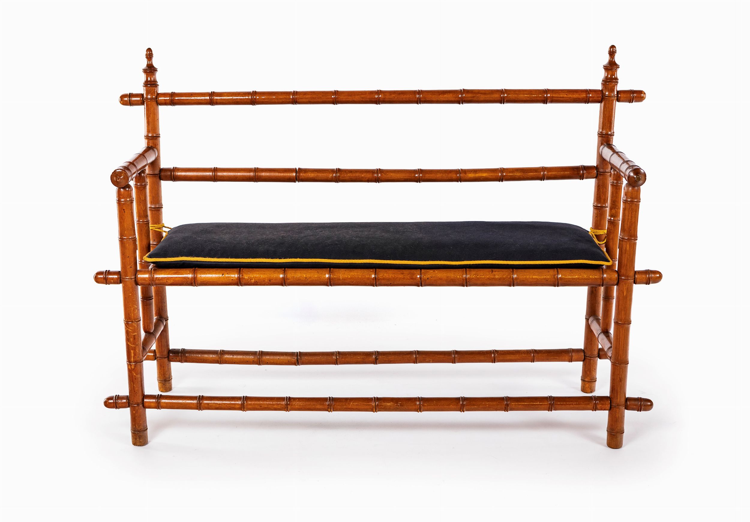 struttura a giorno di linea squadrata in legno tornito ad imitazione del bambù e sedili sormontati da cuscino
