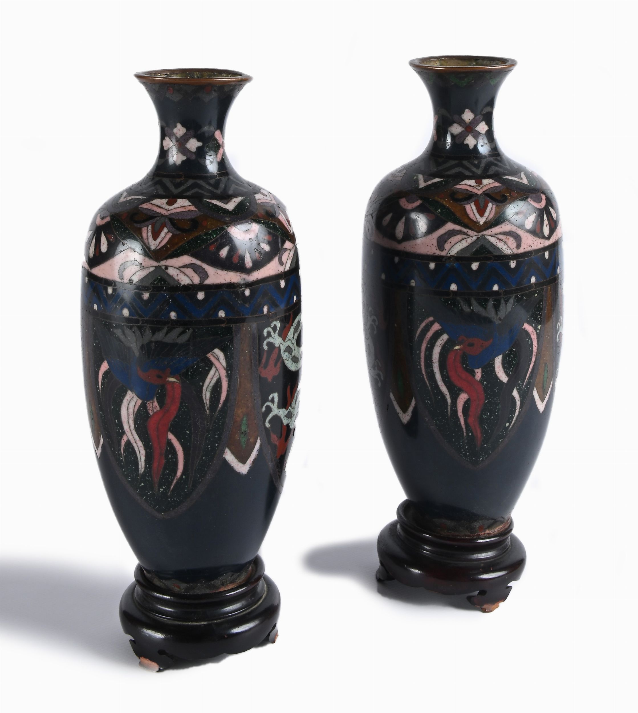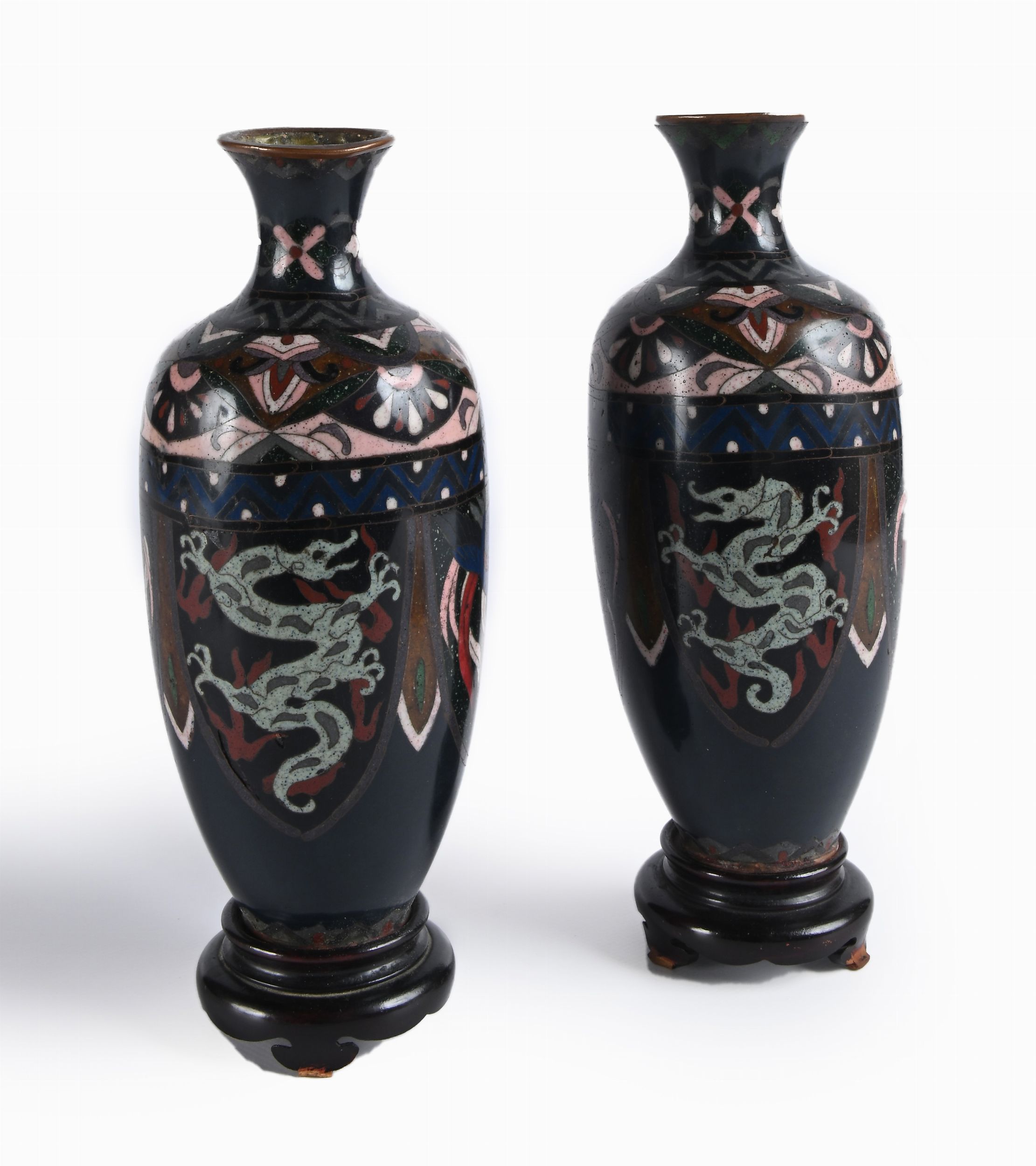 decorati da draghi e fenici su fondo blu scuro; montati su basi in legno con foro centrale passante per essere utilizzati come lampade