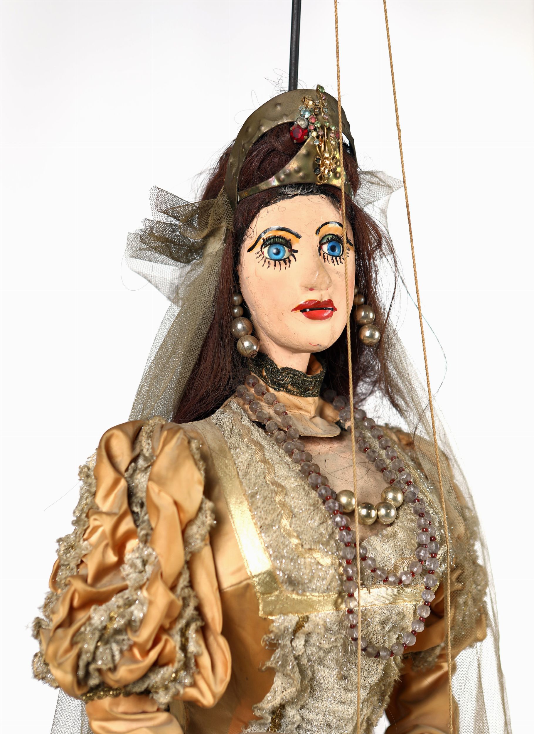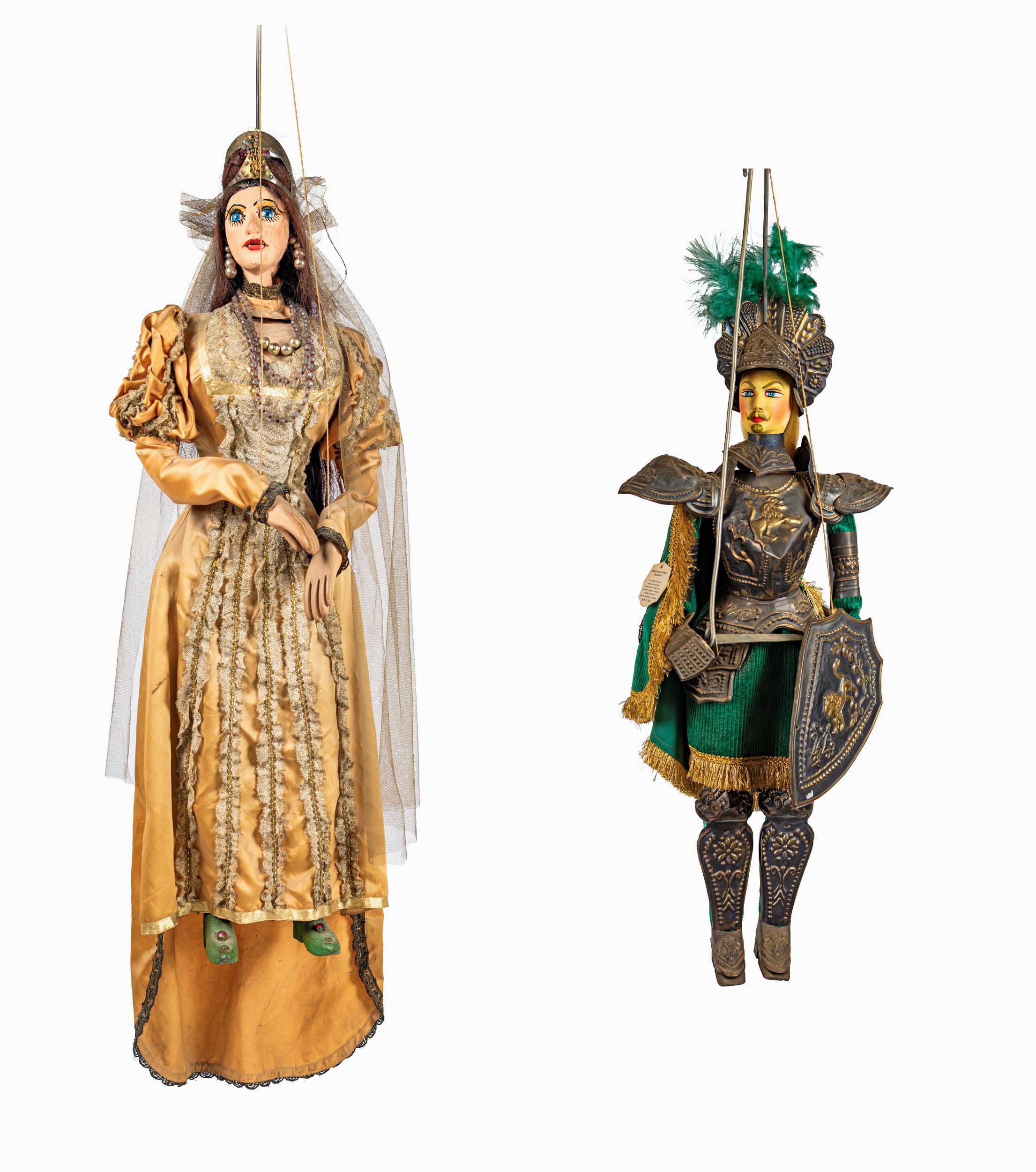 altezza cm 95 e cm 80 rispettivamente la figura femminile è caratterizzata da grandi occhi mobili azzurri, lunghi capelli castani, abito ricamato e guarnita da gioielli; il paladino reca volto ed arti in legno dipinto, abito in tessuto, elmo, scudo ed armatura in lamina stampata