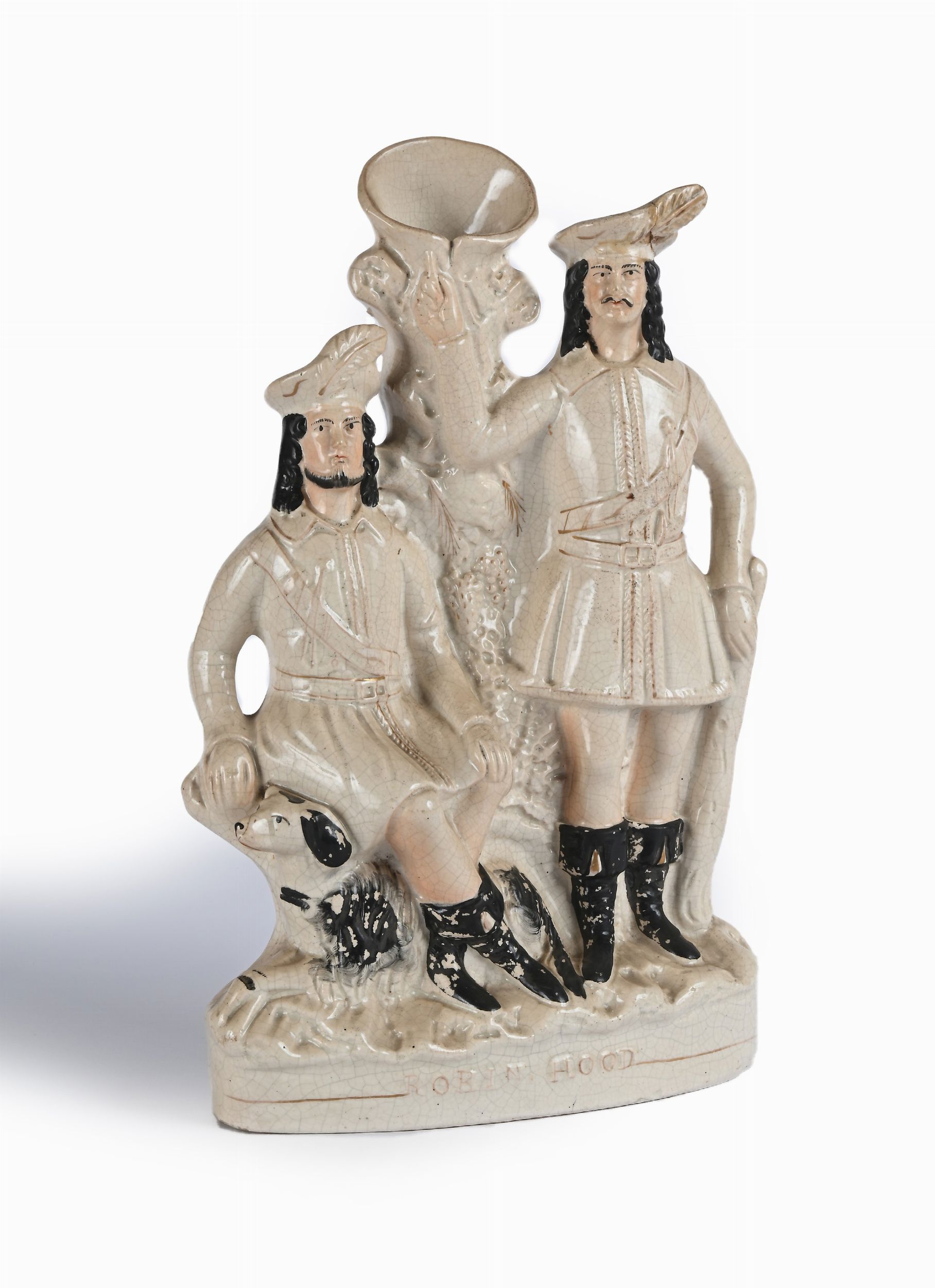 raffigurante Robin Hood, Little John ed un cane spaniel; alle loro spalle un tronco d'albero funge da spill vase. Intitolato Robin Hood sulla base. Marca assente