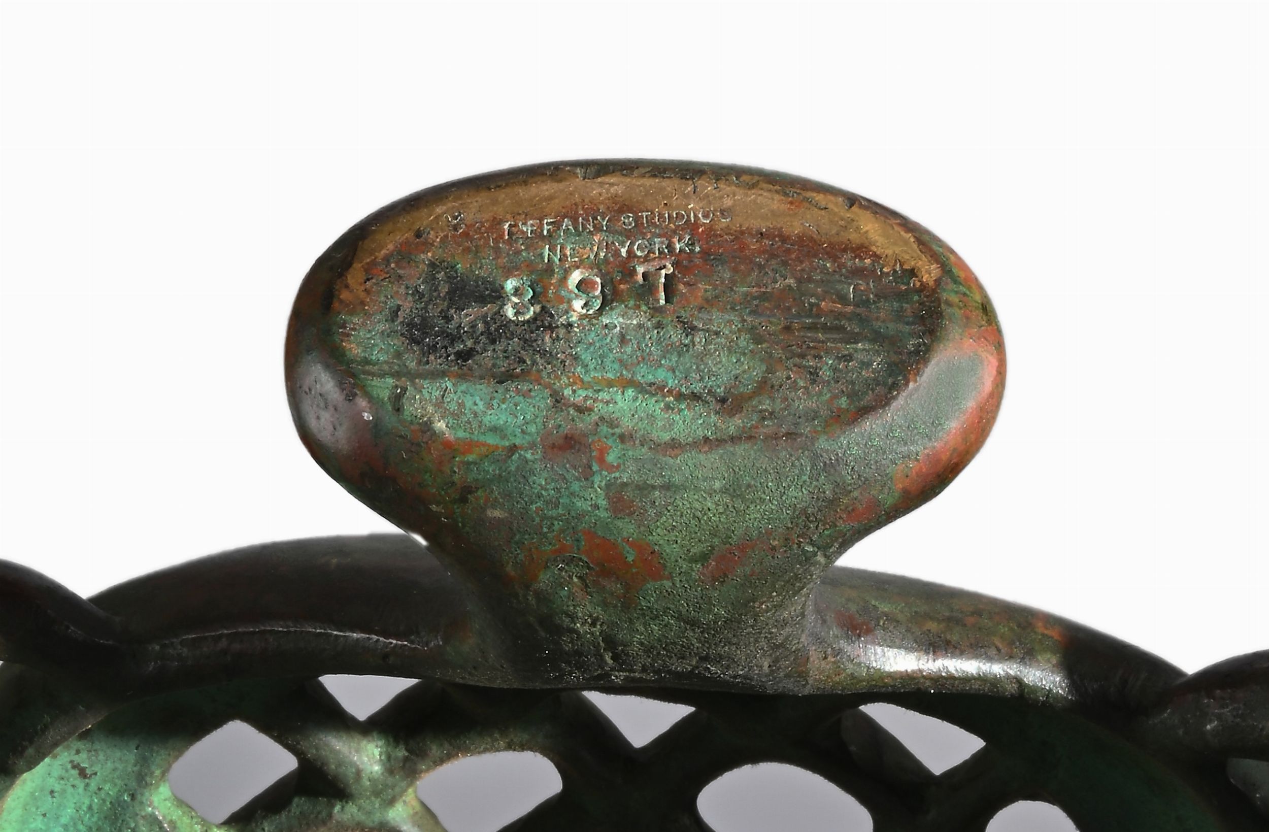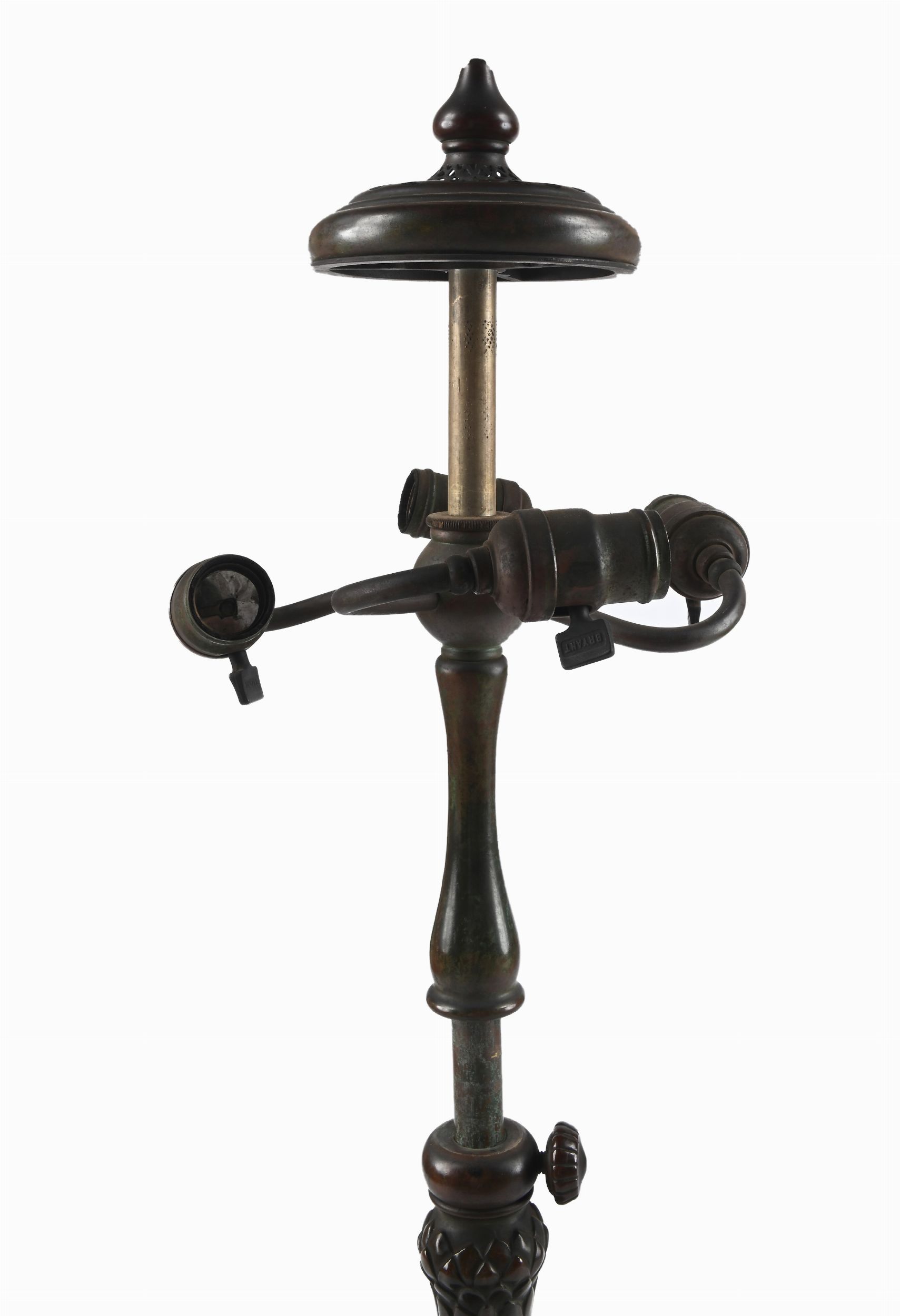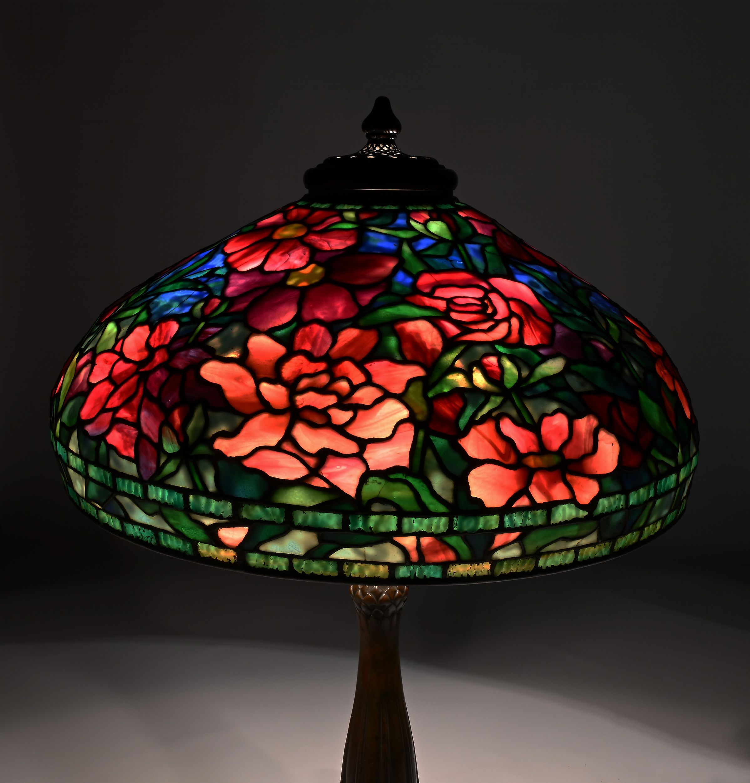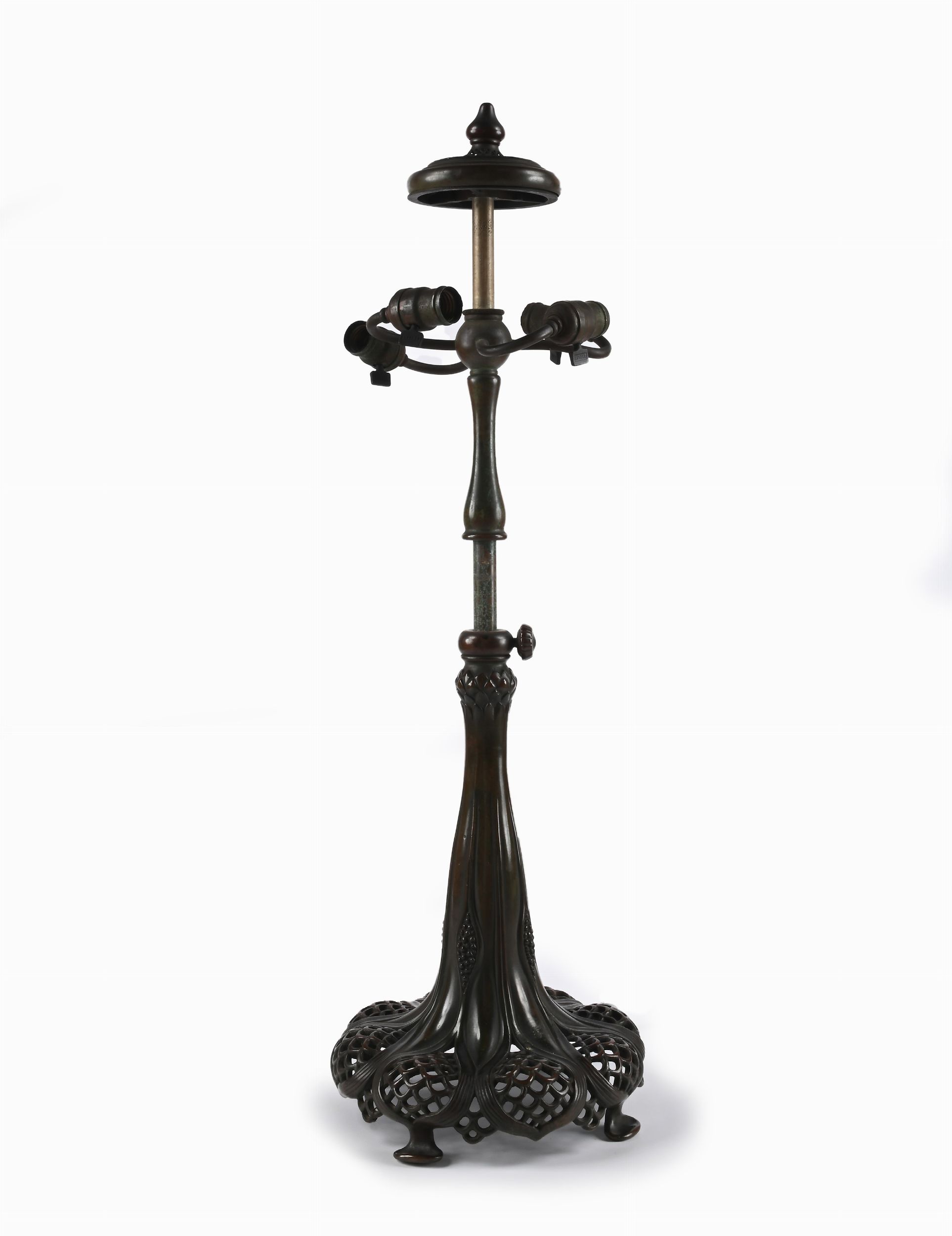 diffusore a cupola di tessere di vetro policromo legate a piombo a decoro floreale; lungo il bordo tessere geometriche verdi si dispongono su due file sovrapponendosi, idealmente, sul fitto disegno naturalistico. Base reticolata in fusione di bronzo a quattro luci. Marchio della manifattura con numero di modello impresso sotto ad un piede Tiffany Studios New York 397 e lungo il profilo interno del diffusore Tiffany Studios / New York / 1505.