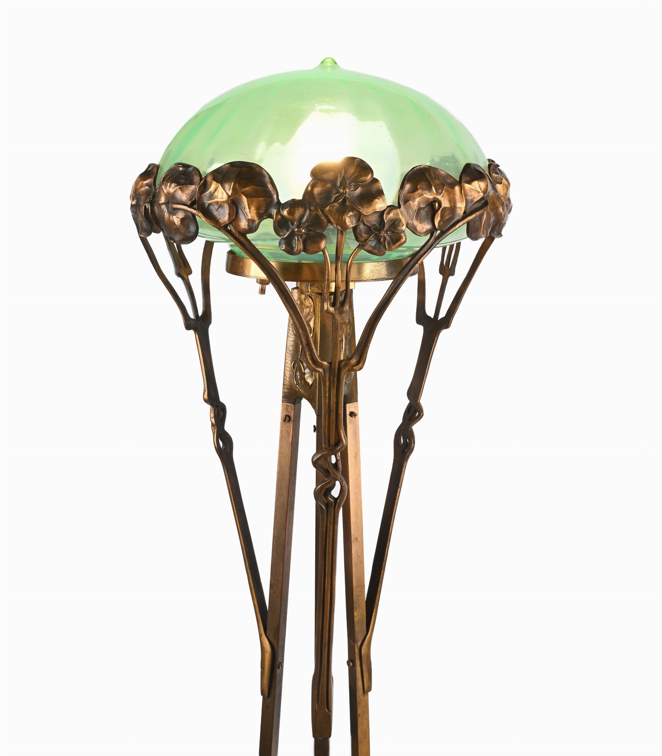 struttura tripode caratterizzata da foglie di ninfea poste alla base e ripetute come finitura del paralume a forma di fungo in vetro soffiato verde iridescente, all'interno del quale vi è un diffusore bianco; base in marmo giallo