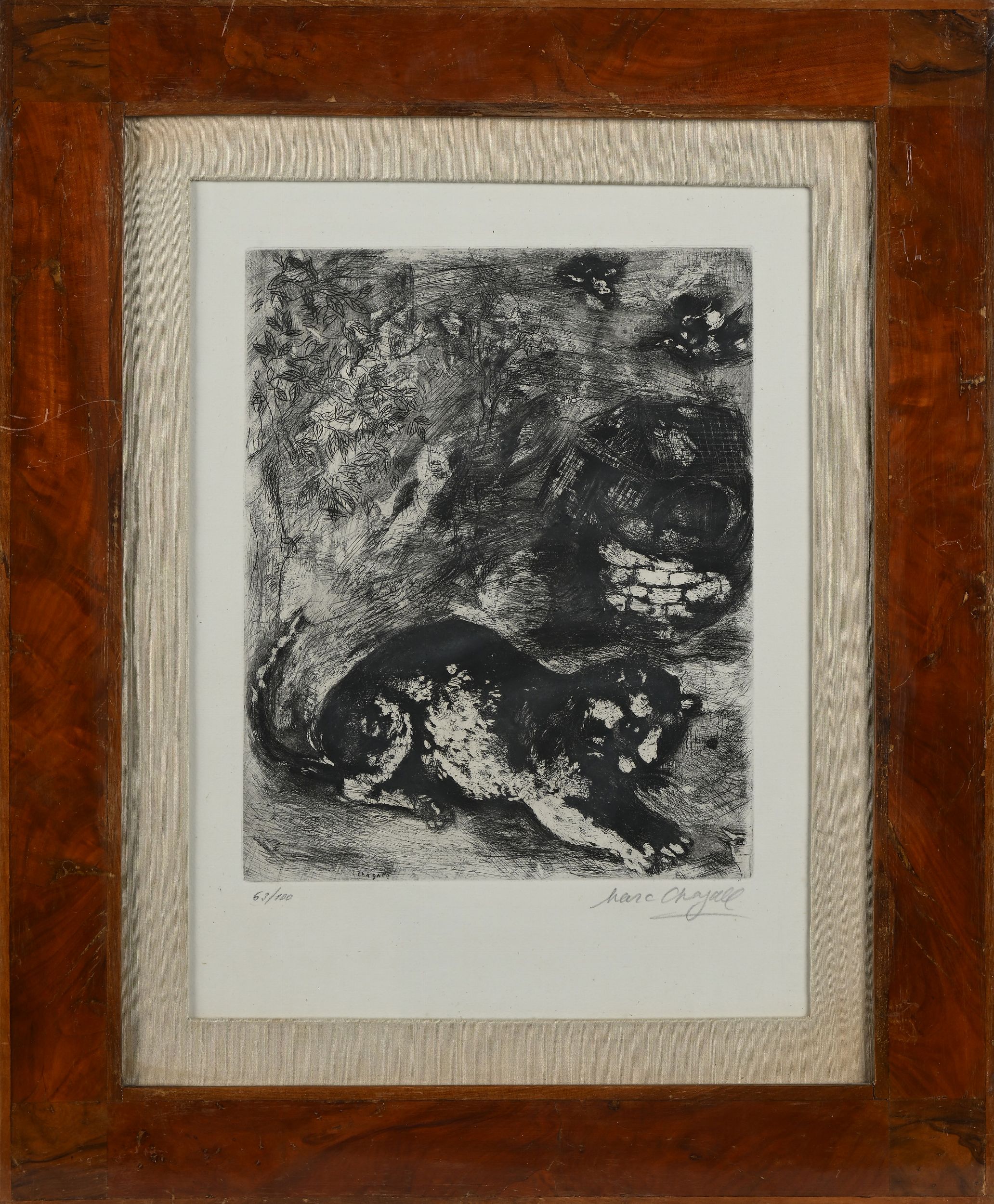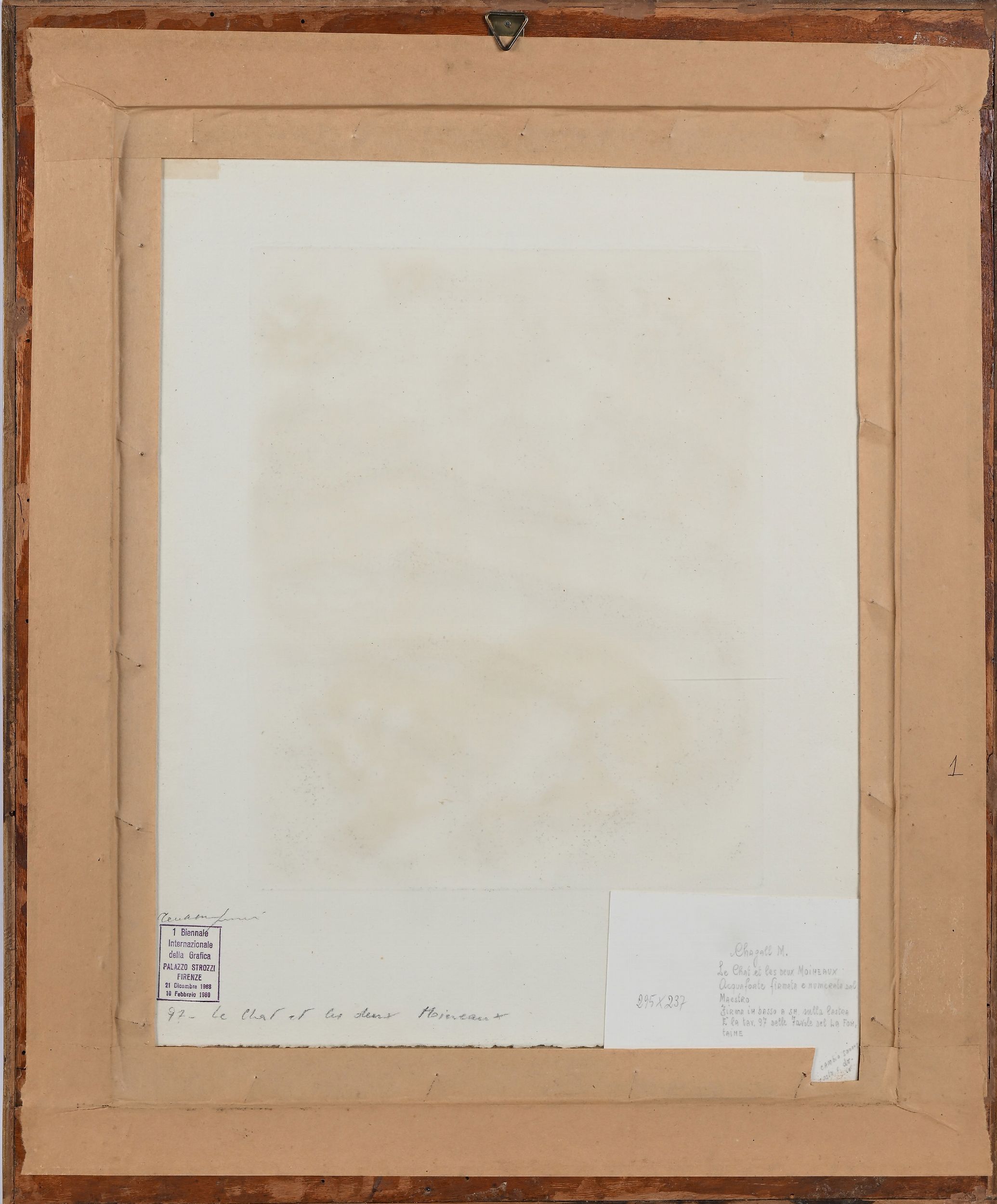 Acquaforte, cm 29,5x24 (lastra) - con cornice cm 56x46cm 1927-1930 Firma e numerazione sul fronte Marc Chagall 63/100. Firma in lastra Chagall. Al verso reca timbro della 1° Biennale Internazionale della Grafica, palazzo Strozzi Firenze, 21 dicembre 1968 - 10 febbraio 1969.